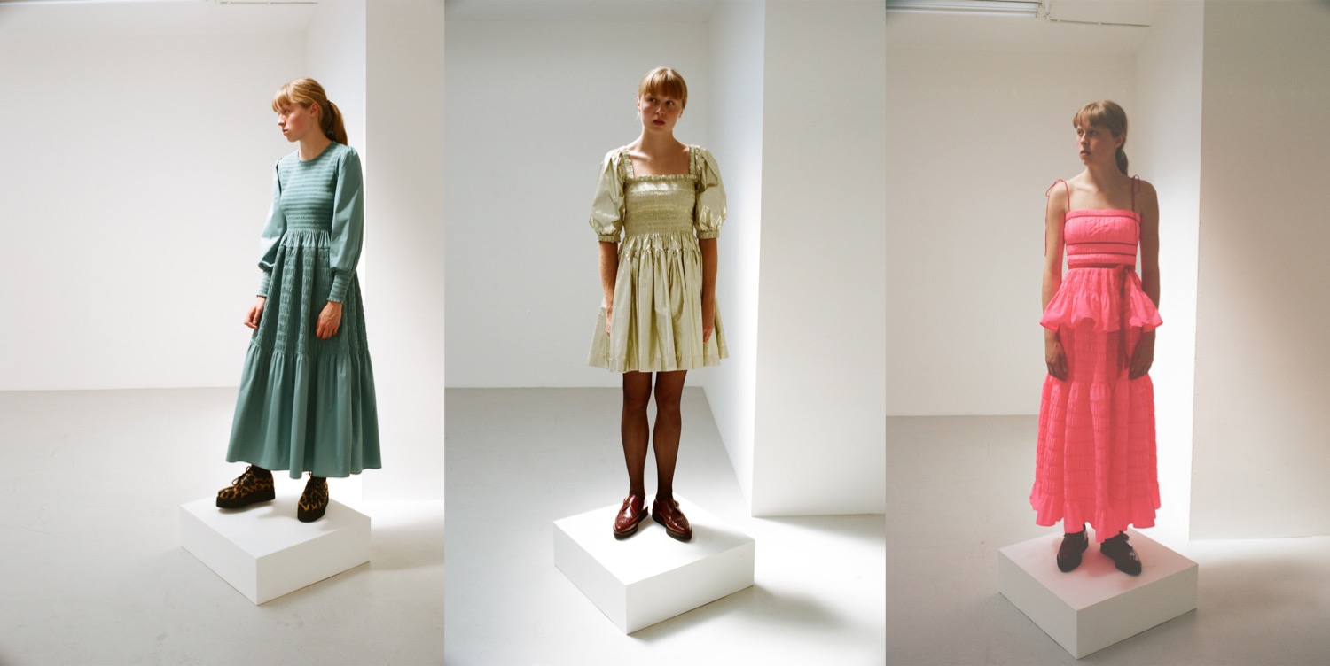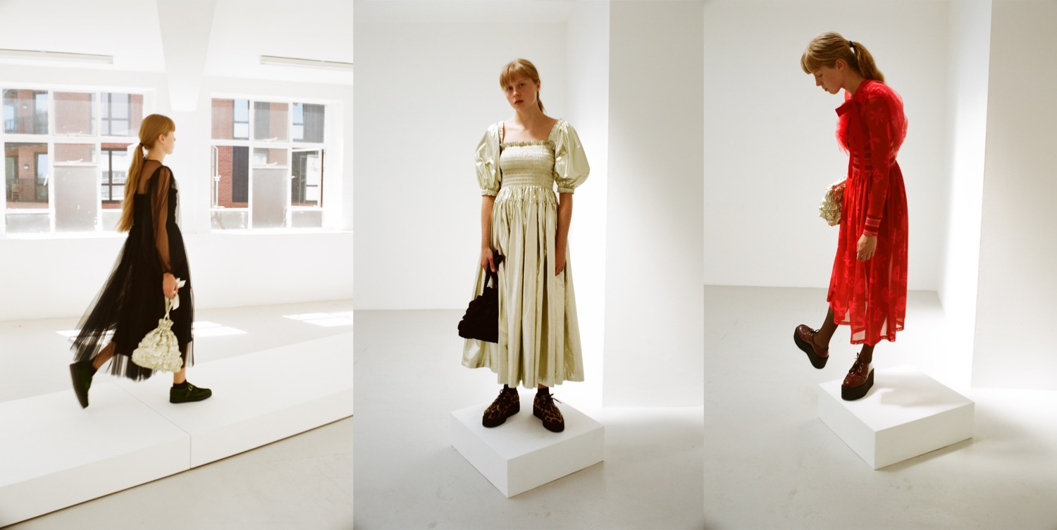 Going back to the roots, enjoying the simple things. In the uncertain times – and 2020 is a winner in this category – designers and labels yearn for a more organic approach, one that opposes mindless abundance. In her resort 2021 collection – which is more of a capsule really – Molly Goddard is serving her all-time signature, tulle dresses, in a more everyday mode. Molly’s clothes are as cheerful as ever, dresses and skirts made “in all the ways I can think of,” she told Vogue, with the smocking and ruffling techniques she developed as a student. The shirred polyester taffeta – this season in neon pink with burgundy velvet trims, or inky blue flounces – is “so comfortable to wear, because it just stretches with you,” she explained. “So you can sit down, lie about, do anything in it. I think that’s why people like it. Because you can wear these things in an everyday way, not just for parties.” True to her hands-on resourcefulness, the designer decided to keep things going during the height of the lockdown. “We all worked remotely, doing fittings on ourselves, which was quite funny.” She runs a tight and friendly business. “I didn’t furlough anyone. I thought it’s important to maintain our relationships with all the people who we rely on, the fabric suppliers and the local London factories who managed to keep ticking over, with people taking work home.” There’s knitwear, too, now – shrink-pleated stretchy sweaters and wool cardigans made in England. She’s also spent her time developing accessories: ruched bags made from her signature fabrics, and solid-but-perky leopard-spot and emerald green creepers in collaboration with the British brand Underground. And how does the designer see the future? Who knows whether there will be a usual London fashion week schedule this September. But then, do creators like Molly need those? “Really, I never meant to get into that whole fashion week thing of having huge shows and all the nightmare that goes with it,” she says. “Honestly, I’d love to get back to what we did at the beginning, just being able to do something that feels spontaneous and fun.”