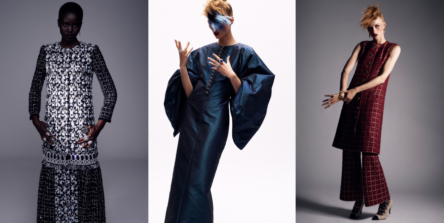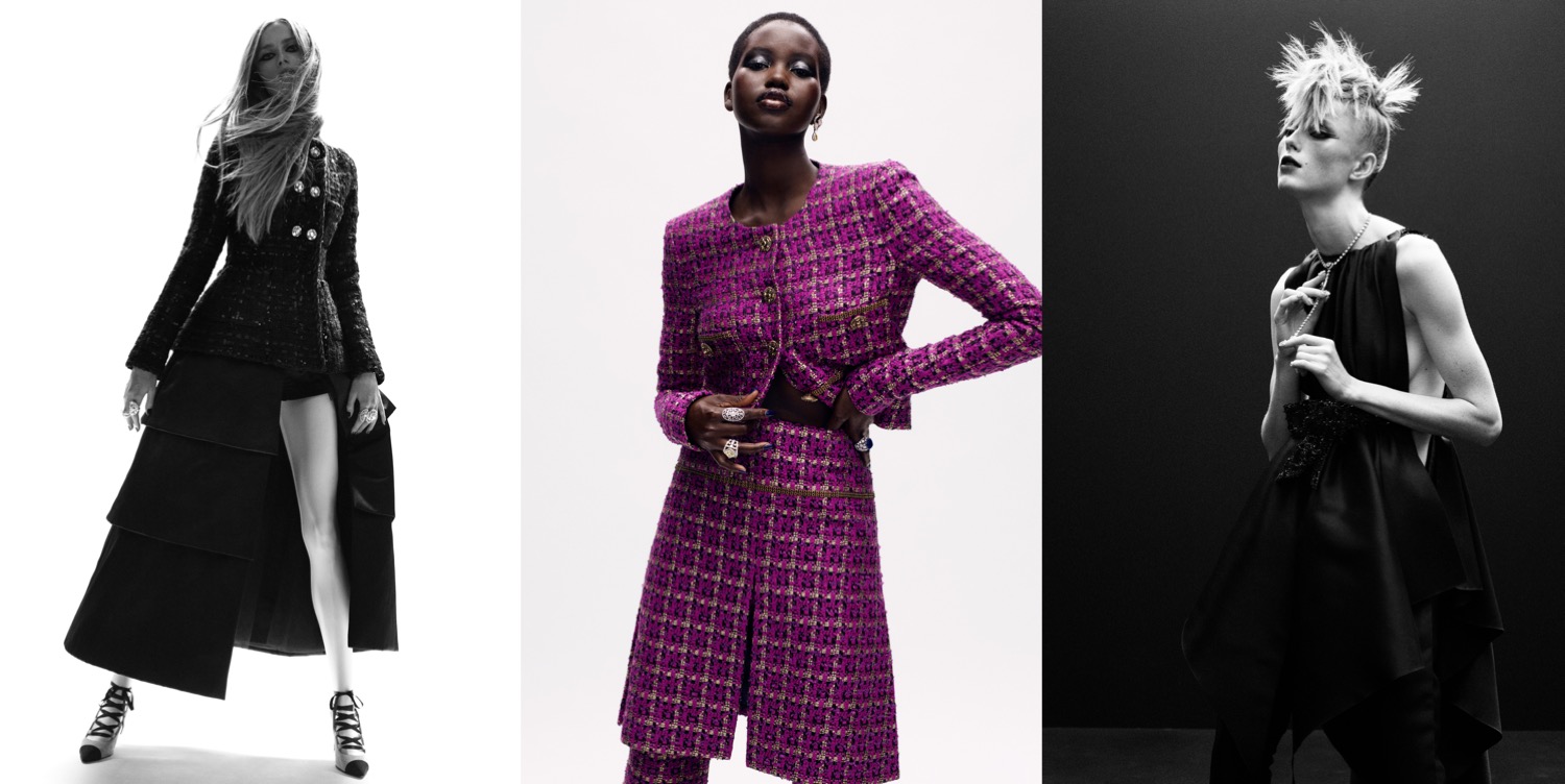 Things started looking up for this unusual, digital haute couture season the moment Chanel revealed its gorgeous collection by Virginie Viard. No pointless mega-productions with special effects, just a short video and a proper look-book shot by Mikael Jansson starring Adut Akech and Rianne Van Rompaey. The focus is on the clothes, which are a delight. “I was thinking about eccentric girls,” Virginie Viard said of her autumn-winter 2020 couture line-up. In particular, Viard was remembering Karl Lagerfeld heading off to parties with his sometime muse, the madcap Princess Diane de Beauvau-Craon, who as a teenage debutante got herself an American crewcut to give some punk edge to the pretty but detested pink dress her mother had chosen for her coming-out ball. “Life with her around is the ideal for me,” Lagerfeld said of de Beauvau-Craon when he spoke with Vogue, “because life must never be flat. She gives a light spirit, yet she is deeply spiritual.” Viard wanted to swing to some escapist opulence after last season’s soulful austerity – and because we all need the dream of a grand party right now! Viard was thinking of “things that maybe I would not do in a show – punk hair, fine jewelry.” Those Chanel haute bijoux included yellow diamond lions (Chanel herself was a Leo) and tiaras. The de Beauvau-Craon touch erupts in the form of a short frothy taffeta dress and faille ball skirts or a full-skirted retro cocktail dress of flowering black and white lace spliced with lacquered pink lace – and in punk feather mohawk bangs worn in the hair, and the lace-up court shoes that would have been perfect for dancing the night away in the great 1980s Parisian nightspots Les Bain Douches and Le Palace. As usual in her work, Virginie looks towards the essence of Chanel. Tweed figures large in the collection for day and night: a knee-length tunic worn over boot-leg pants, for instance, or a minidress with the traditional Chanel braid trim reworked in rhinestones. There is more amazing trompe l’oeil in the allover Lesage embroidery of a lean jacket worn with an ankle-length skirt, or in the Emmanuelle Vernoux–embroidered sleeves of a decorous wool ball gown, or the Montex sequin and wool tufts of an off-the-shoulder minidress. Viard provides subtle elegance too – which I always adore the most in her collections – in pieces that include a sheath of inky faille with bishop sleeves or a solemn evening gown of steel gray silk velvet (my favourite), discreetly dusted with embroidery at the waist and cuff, and jackets with midriffs defined by hand smocking. Viard aptly describes the looks as “casual and grand” – and this is what I call relevant couture.