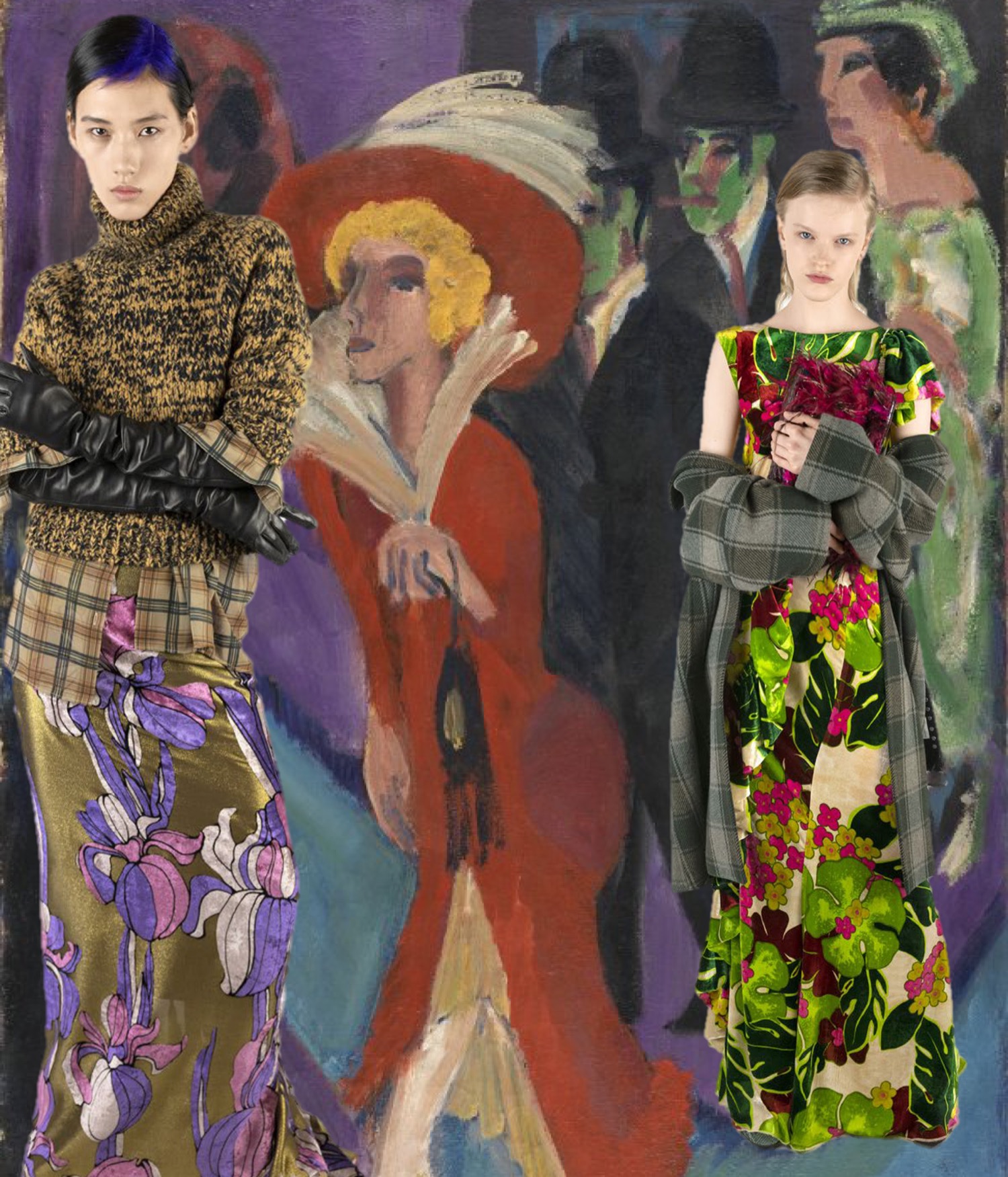 Yesterday I had a second glace at Dries Van Noten‘s autumn-winter 2020, a truly magnificent line-up, and just like that, from one collage I’ve ended up with an entire story. After last season‘s collaboration with Christian Lacroix, it was clear that Dries would somehow continue with this over-the-top energy. The designer was thinking about “nocturnal glamour” and particularly the dressed-to-kill creatures of the glam 1970s and high 1980s, whom he glimpsed from afar as a young man in Antwerp, in the form of the high-gloss photography of the makeup artist Serge Lutens. Maybe she was heading for a night at the most trendy club in Paris (well… corona is out in the wild, but let’s dream!). Or maybe that was her, wending her way home in daylight, with a plaid coat shrugged over her glitter. “It’s about going out, enjoying life – having fun, that’s very important!” he remarked back in March. “I thought of this party girl. Something mysterious. Something dark. But I questioned how far it could go, while staying contemporary.” His solution was to partially casualize the glamour by applying his melee of acid green and fuchsia jungle prints to fluid pajama shapes, and adding ’90s grunge–influenced plaids and hip-tied shirts to the mix. Equally head-turning: a dress in a violent purple, streaked with silver embroidery. The look-book photos by Tommy Ton additionally convey the vibrance of the collection. Now, here are my favourite looks, immersed in the subverted world of the Expressionists and Symbolists…