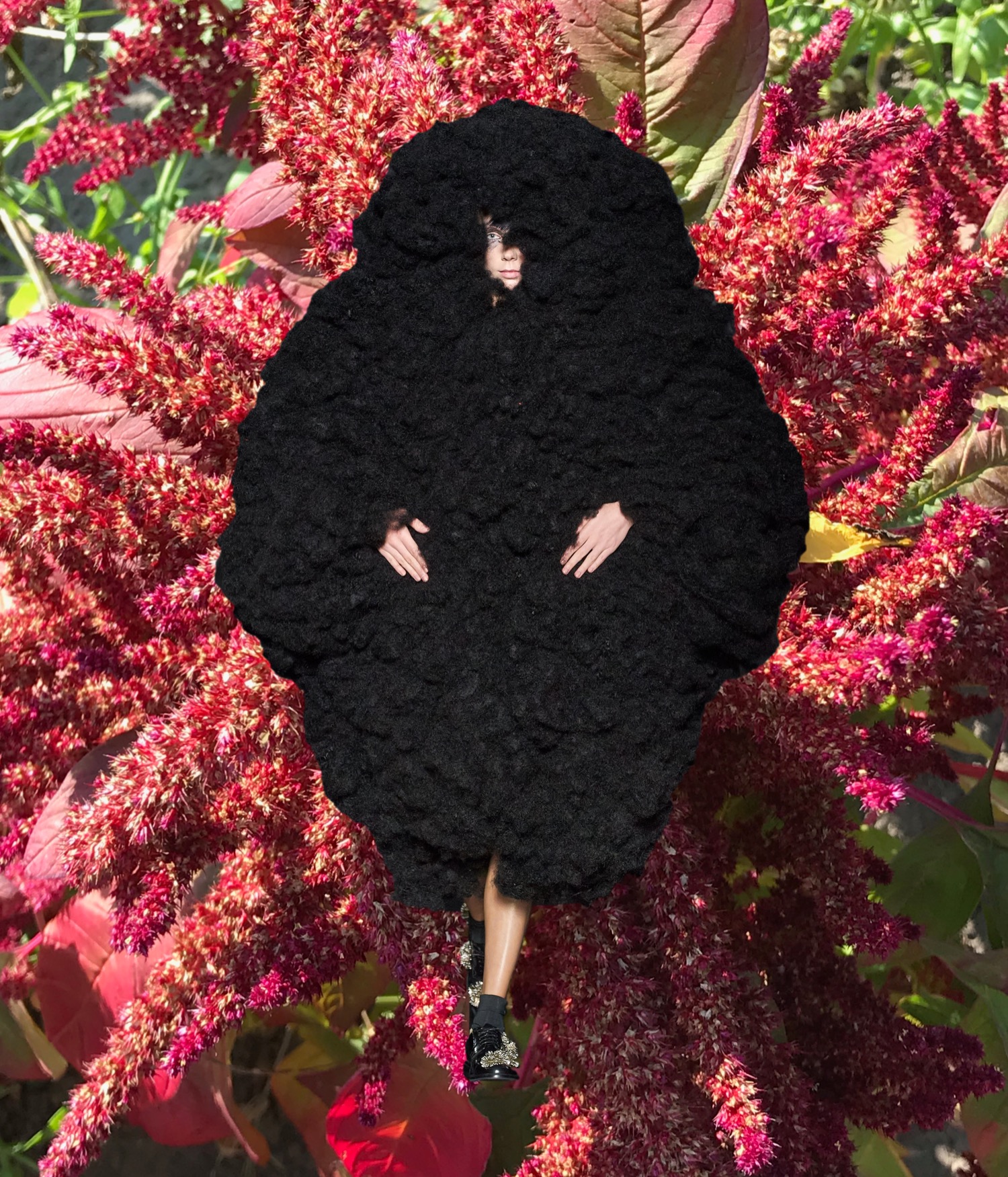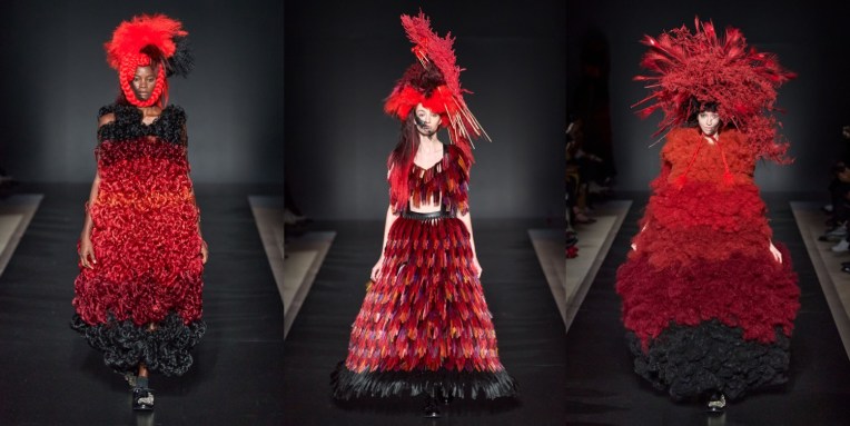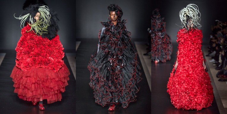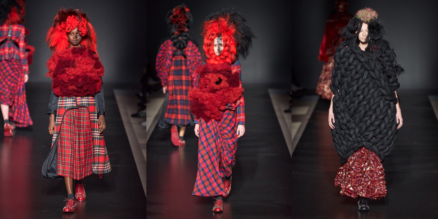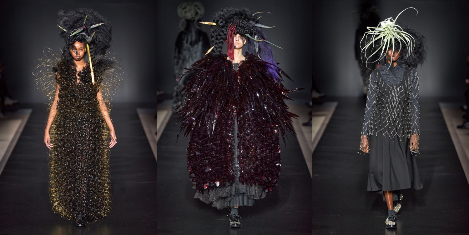 Today in the morning, out of the blue, I thought to myself: I need to look at Noir Kei Ninomiya‘s autumn-winter 2020 collection. I’ve got no idea how I missed it in my Paris fashion week coverage last March, but I’m happy to catch up on it. This collection was extraordinary. Ever since he first appeared during spring 2016, Ninomiya has slowly expanded his stitch-free wearable sculptures, building grander and ever more unsettling architectures. This season he again pushed forward into new territories, while working for the first time with Icelandic installation artist Shoplifter (aka Hrafnhildur Arnardóttir) as well as his long-standing floral art collaborator, Makoto Azuma. The magic of creative collaboration delivered something quite unforgettable. Shoplifter (an artist whose chosen material is synthetic hair, her works include the cover of Björk’s 2004 album, Medúlla, and the mind-blowing installation in the Icelandic pavilion at last year’s Venice Biennale) added a fresh element to the interplay between Ninomiya’s materials and Azuma’s botanicals, specifically exaggerated hair extensions that made the silhouettes look and feel even more organic and out-of-this-world. In his usual enigmatic manner, Ninomiya had said this collection was mostly about the color red, in that as paint it can be mixed to create black. The metallic woven check fabric that was folded and whipped like air-filled ice cream around the body vaguely resembled a florist’s bouquet wrapping. The fronds of palm, succulent, tuber, and bamboo that nuzzled and nudged their way through and around Shoplifter’s hairy extensions created an impression of human and plant grafted together and slowly devouring each other. Ninomiya’s materials included golden wires that furled like unearthly waratahs around the wearer; interconnected safety pins built into pearl-linked globes or an entire dress; red feathers; strips of rivet-connected red tulle; and lengths of brass-colored steel wool frayed, then wrapped in transparent PVC and braided to resemble enormous Viking wigs. Those safety pins (also gracing a fine new shoe collaboration with Church’s) and the tartan section signified a punk undertone also present in the guitar: Ninomiya’s usual biker jacket motif was retired for the season, but he hit the fringe trend via a couple of apocalyptically enormous black pieces. The closing titanic fuzzball was at once hilarious and ominous – part dark cloud, part hyper-expressed protective aura, all Noir.