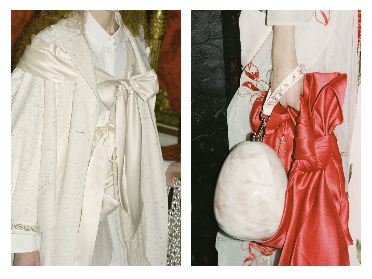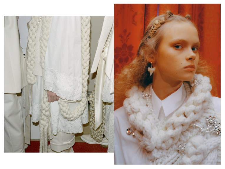 As the cropped and largely digital “fashion month” is about to start, I’m looking back at some of my favourite collections from autumn-winter 2020 season, and Simone Rocha‘s delightful line-up is definitely in my top of the top rank. There was something beautifully sacred and mystical about Rocha’s collection. Ribbons and ties, fisherman’s nets, white lace and baptism-like cotton cloths, pearl details from head to toes… and of course the Aran knits. “Procession, baptism; birth, life, and loss,” began the designer. “It’s about the Aran Islands, the life there, and J.M. Synge’s play about it, ‘Riders to the Sea’.” The cream wool Aran pattern is the centerpiece of Rocha’s collection – the Irish stitch is world-famous, even though if originates from a tiny sprinkle of islands off Connemara on the country’s west coast. “It’s the color of the unbleached wool from the sheep there,” Rocha explained. An what about the slightly nautical feeling? In the past, people on the remote islands lived only on sheep and the proceeds of battling with the sea – Synge’s drama is about the tragedy and the resilience of a woman who has lost her husband and sons to drowning. Rocha is never afraid of the less optymistic themes for her shows. But somehow, they never appear heavy or dull. After the virgin-white looks, something darker began to flow in. Women in mourning, church rituals, priests, legends, and the Virgin Mary all became wound into this one. Rocha never had a religious upbringing from her parents at home in Dublin, “so I never made my first Communion, so I never got to dress up in the white frocks, though all the girls around me at school did. Maybe that’s why I’m obsessed, making up for it,” she said with a laugh. “Of course, you can’t look at Ireland and not be influenced a little bit by Catholicism.” As always with Rocha, I’m completely in love.