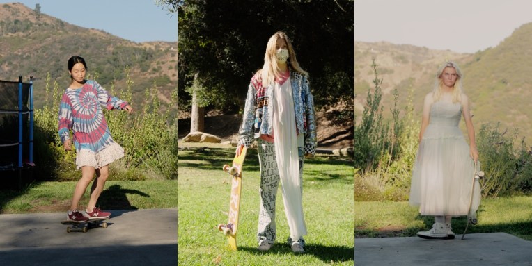 I discovered Imitation of Christ a year ago, and when I’ve shared some archive images from Tara Subkoff‘s early 2000s shows on my Instagram stories, many replied to me that they’ve never heard of the brand and that it’s just so, so amazing. I was in awe, too. Each of the label’s collections was presented as a sort of ironic performance: a funeral show; a red carpet line-up opened by Chloe Sevigny; a collection solely dedicated to denim, with Scarlett Johansson as a Marilyn-Monroe-look-alike model. Then, the brand seemed to go into a hiatus, then it came back for a moment and disappeared again. And then, to my surprise, somebody posted on Instagram that Imitation of Christ is back this summer with a guerilla couture performance in Los Angeles. And now, here we are with Subkoff’s spring-summer 2021 collection – in a moment that one might never suggest for a brand that’s planning its “big” come-back. But Imitation of Christ isn’t a regular brand, so the circumstances just couldn’t be more exciting. Twenty years after the brand’s first show on the escalators in a subway station, this season’s performances (there were two, one in Los Angeles, one in New York, not identical, but each consisting of a capella singers accompanied) are equally inventive. And, while all of this is going on, The RealReal, from which Subkoff sourced some of her pieces, will offer the spring collection for sale in see-now, buy-now fashion, with part of the proceeds going to Greta Thunberg’s nonprofit Fridays for Future. Upcycling or “resurrecting” existing pieces is the central tenet of Imitation of Christ, and it means that every piece is unique. Collection themes do emerge, however, and are crystallized by the way they are presented. Skateboarding is the organizing principle this time around, and Subkoff describes the clothes as “glamorous activewear” – say, a vintage slip attached to the front of a sports jersey. Some of it could have been hand-sewn by the bored, home-imprisoned Lisbon sisters from Sofia Coppola’s The Virgin Suicides, by the way. Subkoff became acquainted with skateboarding girls when she was feeling a bit blue. Struggling to find inspiration, the designer started visiting local skateboard parks, which she found to be “heavy on the dude feeling” until she noticed the young female skaters trying to master tricks, falling down, and starting over again. In their determination Subkoff says she found a “good metaphor for what it feels like, to me, to be female in this world in some capacity. Like you just have to keep doing it, until you do it better than the men. And then you have respect in some way.” Looking forward to more of Imitation of Christ, as it’s one of the most enigmatic and intriguing labels in New York.