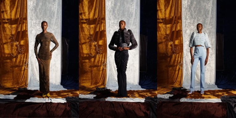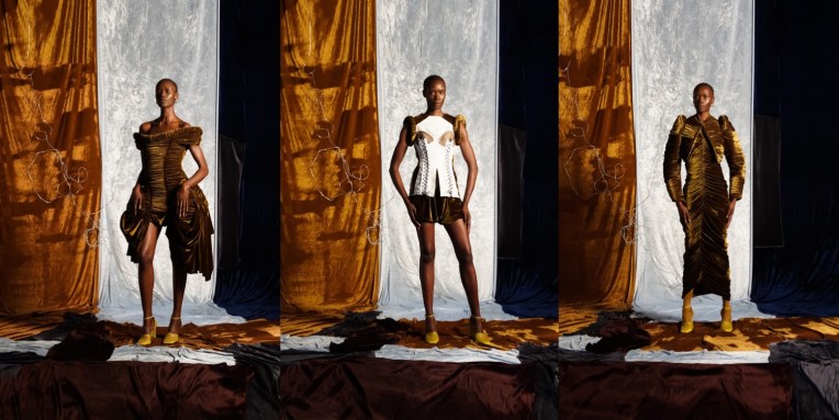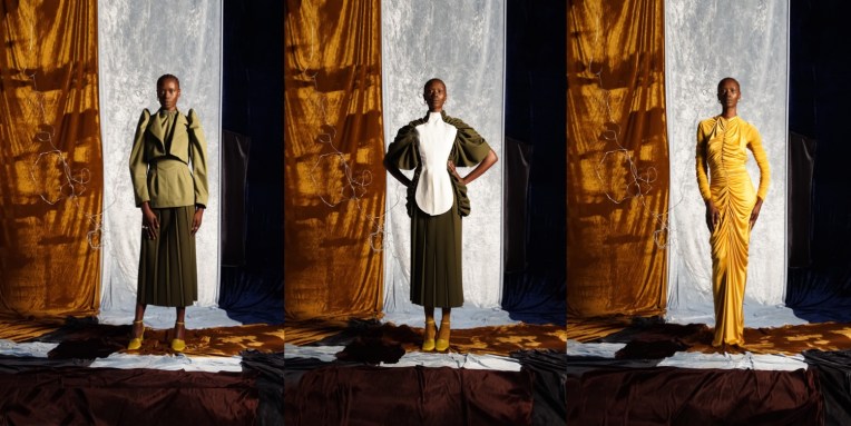 Who would have ever known, that during confinement, when our clothes were all about lazy-wear, one could come up with such beautiful refinement? Richard Malone, the Irish designer, brought back elegance to London Fashion Week, done in his signature, sustainable way. It was those months which became the genesis for the spring-summer 2021 collection, a period when, even without a team or regular resources at his disposal, he had the luxury of time: the opportunity to rifle through deadstock materials and hand-dye them in his bathtub, or tie them with twine and run them through his washing machine to achieve the right crinkled effect. “Because my language is very much making, perhaps lockdown wasn’t so bad for me,” he noted. “I could just do whatever I wanted in my studio. It was a distraction.” DIY as it was, the luxurious feeling that Malone came up with is just so refreshing: velvets dramatically draped into floor-sweeping Grecian numbers; discarded theater curtains cut into body-con glamour or gathered around padded bustles. “They’re fabrics that lend themselves to lounging—the velour is like Juicy Couture tracksuit material,” he smiles. “It’s comfortable; it’s loungewear.” He was clearly going for a sense of comfort in the armor of sutured breastplates and the padding of cushioned hips. “It wasn’t intentional but I was trying everything on as I designed it and I suppose it was in response to the moment,” he reflects (Malone has always worked as his own fit model in the formative stages of his collections). “I hadn’t worn shoes for three months. Everything, the very idea of clothes, felt abstract.” The abundant historical allusions, too, were instinctual rather than referential. Without access to research libraries, “I was reliant on the guise of memory,” he says. “And I read a lot of books about time: Iain Reid, Doireann Ní Ghríofa, Ali Smith… I was interested in the idea of how all these different time periods can somehow exist at once.” Cropped and gathered matador boleros, their shoulders warped into shrugs, evolved from the idea that “everything’s sort of fucked, so you shrug and you move on” rather than the usual archival imagery; corseted lace-up backs from the simple fact that Malone was having to somehow strap himself into the more elaborate numbers. Sometimes, the simplicity of an accident brings the most spectacular effects.