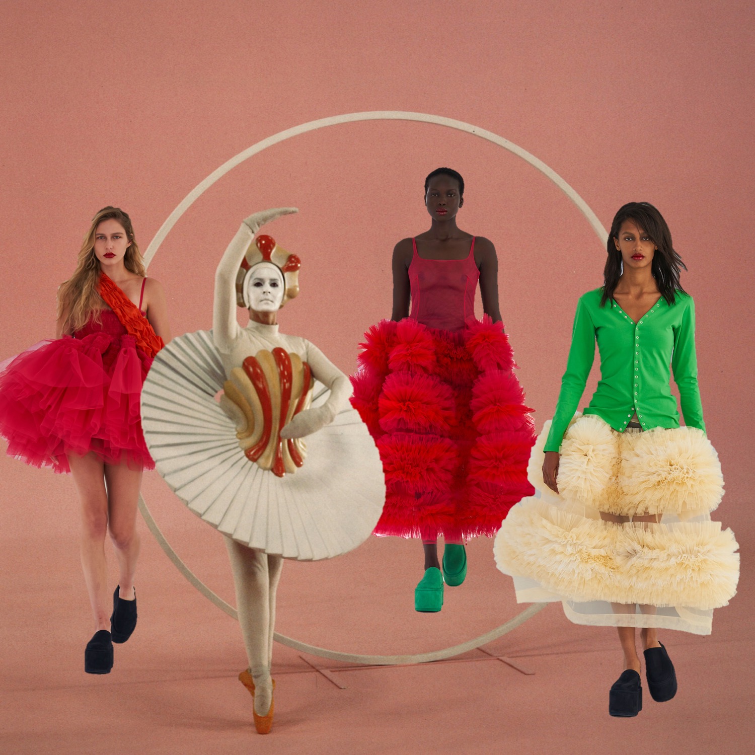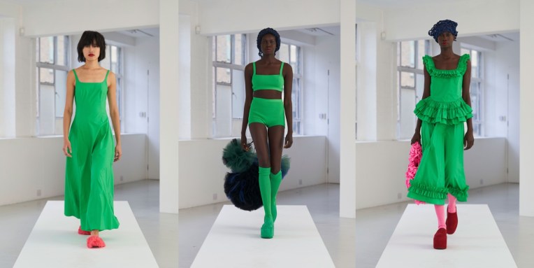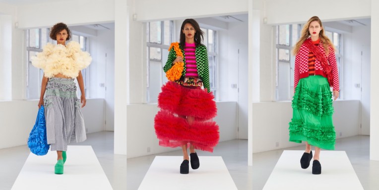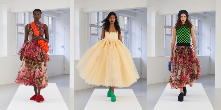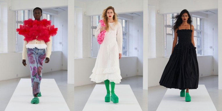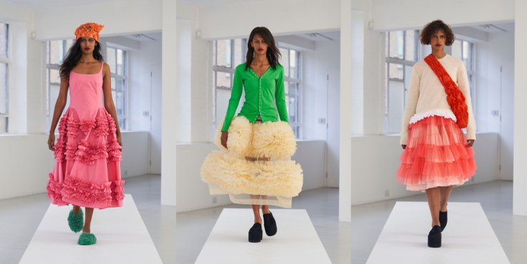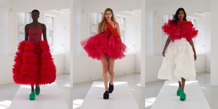Molly Goddard‘s spring-summer 2021 collection is pure joy. Although in the very beginning of the works on the collection, the London-based designer wanted to keep everything in white as a response to the current circumstances, she observed as things slowly started to reopen and totally changed her mind. Her signature, ruffled, full-skirted dresses come in vivid greens, the checkerboard sweaters go neon, and explosive tulle gowns shock with the deepest of reds. A minimalist gesture of colour hits through joyous, maximalist shapes – that’s how you can sum up this delightful collection. But the designer has a grounded approach. Goddard’s taffeta and tulle clothes tend to have a dry hand and a utilitarian aesthetic that works for day. Her new pretty A-line anorak dress was a great example. And if there were ever a season to collaborate with Uggs, this moment is surely it. The colorful shaggy slides and comfy platforms were primed for a life working from home. Also in keeping with the times was Goddard’s decision to make many of her statement-making dresses available in white. For fashion-forward young brides shopping in the era of the socially distanced wedding, that’s the right decision.