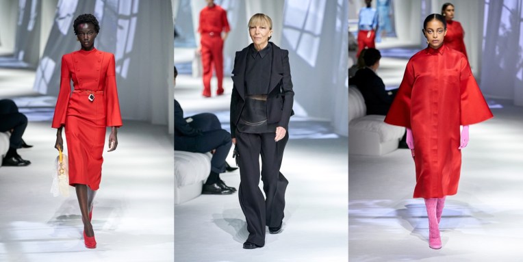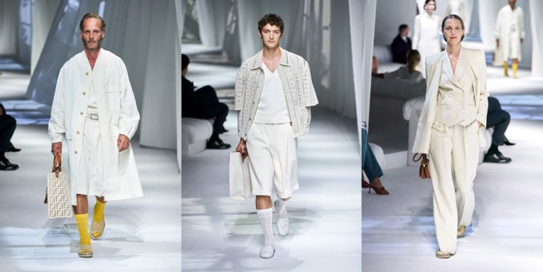 Silvia Venturini Fendi‘s solo vision at Fendi is sublime – so I really wonder why she has appointed Kim Jones as the co-director of the womenswear. Well, I know why – he’s done commercial magic at Dior Men, so why not do the same at Fendi… But back to Silvia’s spring-summer 2021 – again, it’s incredible and it appeared to be a great start of live-slash-digital Milan Fashion Week. It felt so delightfully Italian, as if taken straight out of a Fellini film. The show opened with prints of photographs taken during lockdown by Silvia Venturini Fendi from her bedroom window, which was a nod to the domestic life we’ve all inhabited in the last couple of months. It closed with Leon Dame and Paloma Elsesser amongst those swathed in snuggly satin quilting and pale lace embroidered linens. “This reminded me of Karl,” said Fendi pre-show: “He had a love for bed linen, he had a big collection.” The loungewear and pajamas and floaty wood-printed caftans had a follow-on relationship to last season’s ‘boardroom to boudoir’ collection; “but here,” said Fendi, “she was a little more… sweet.” Much of the collection was cut in barely-dyed but beautifully embroidered linen, a fabric Fendi said she had chosen thanks to its simplicity and sustainability. Runway bags ran from a sweetly naif rattan version of a child’s beach bag to a wicker picnic basket that was a nod to Fendi’s wonderful recent menswear ‘gardening’ collection, co-designed with Luca Guadagnino. And the model casting was amazing, as well: Karen Elson, Maty Fall, Ashley Graham, Eva Herzigova, Yasmin Le Bon, Jill Kortleve and Penelope Tree were all part of a cast as diverse as the swathe of reminiscence Fendi was mustering in this collection. Naturally there were some sections in fur. Maty Fall wore a loosely woven coat of nappa and mink over a floral-pressed romper, while Aliet Sarah a striking skirt of shaved mink ‘lace.’ “I wanted to talk about values,” she explained. “At this time to just talk about fashion seems not enough. I wanted to talk about the values that are behind fashion, and I can tell you that there are a lot. In my family we have always put great meaning into what we do. Here I wanted to achieve clothes that are about the moment, but which also are part of your life, for your life.” By presenting clothes and accessories that whispered of past manifestations of Fendi’s history Silvia was also looking to a future in which garments function as cherished furniture, ever more redolent with memories and meaning in a long and fruitful life.