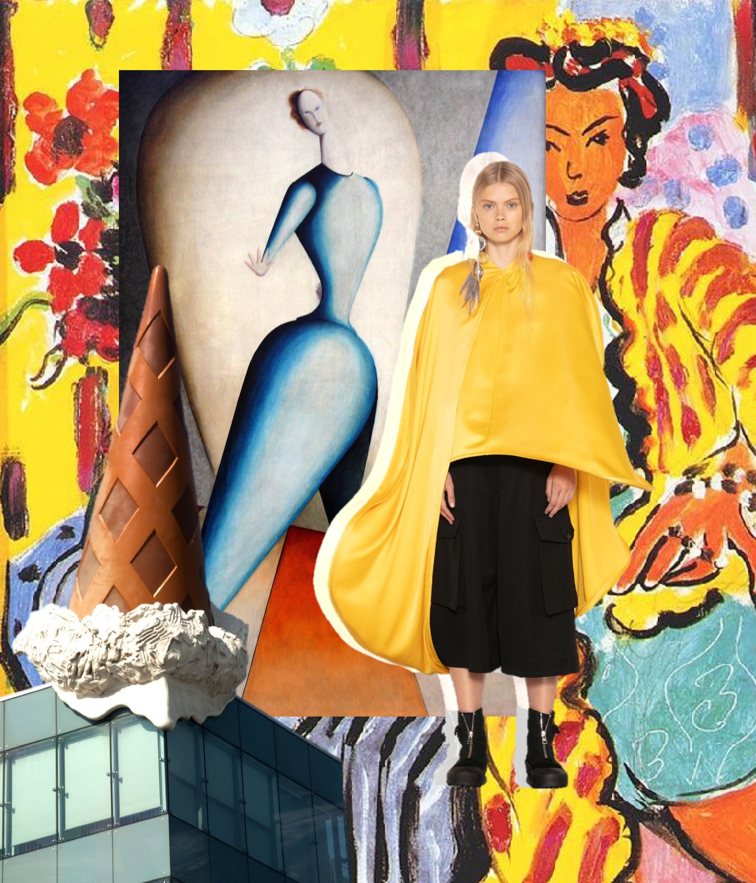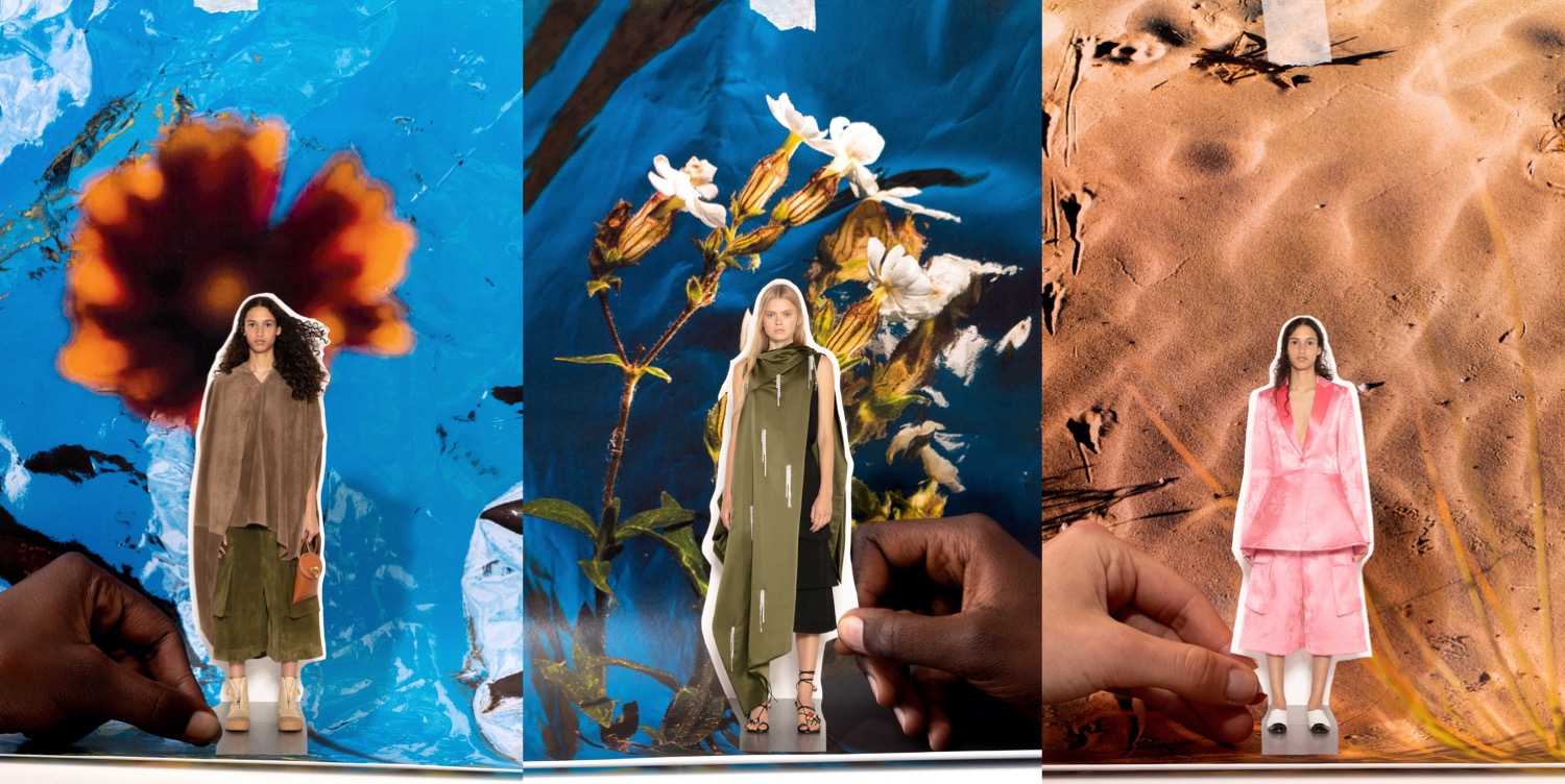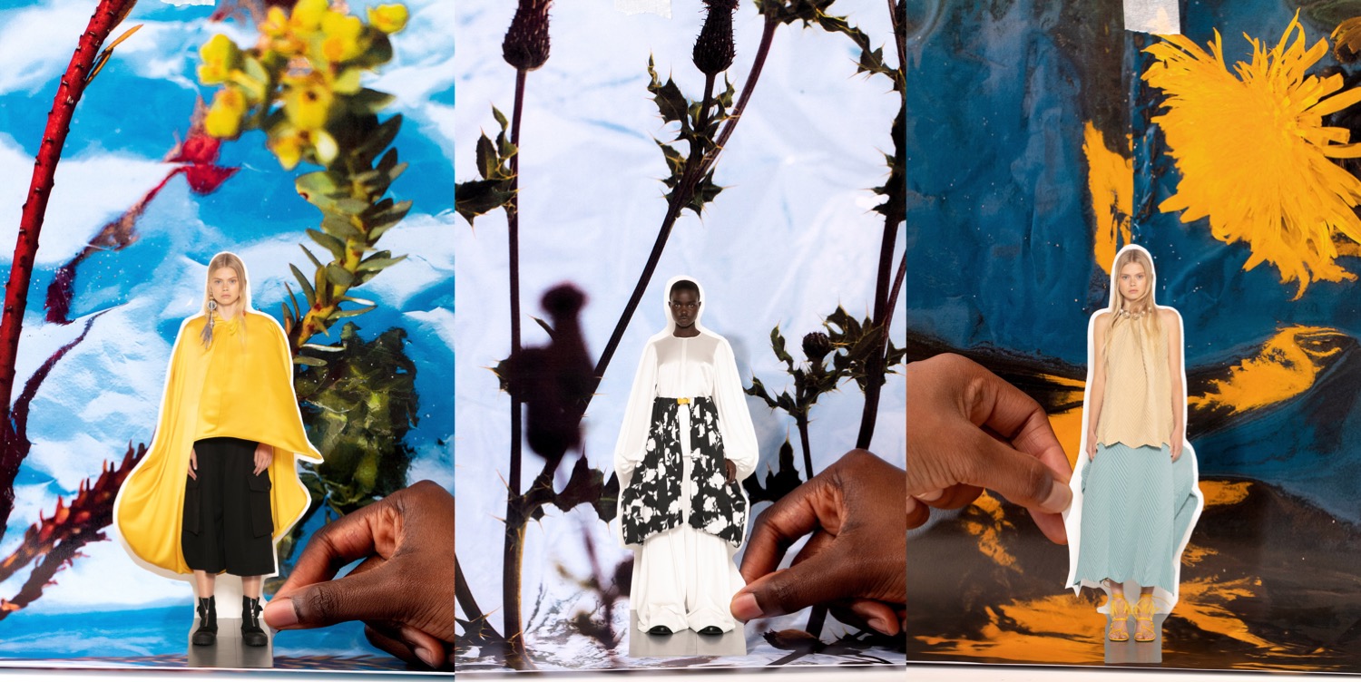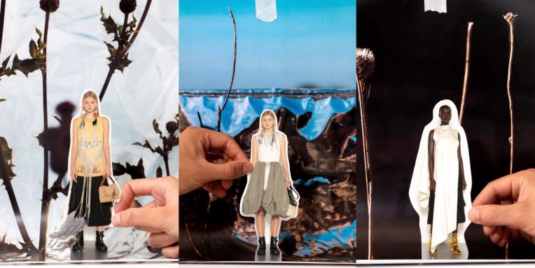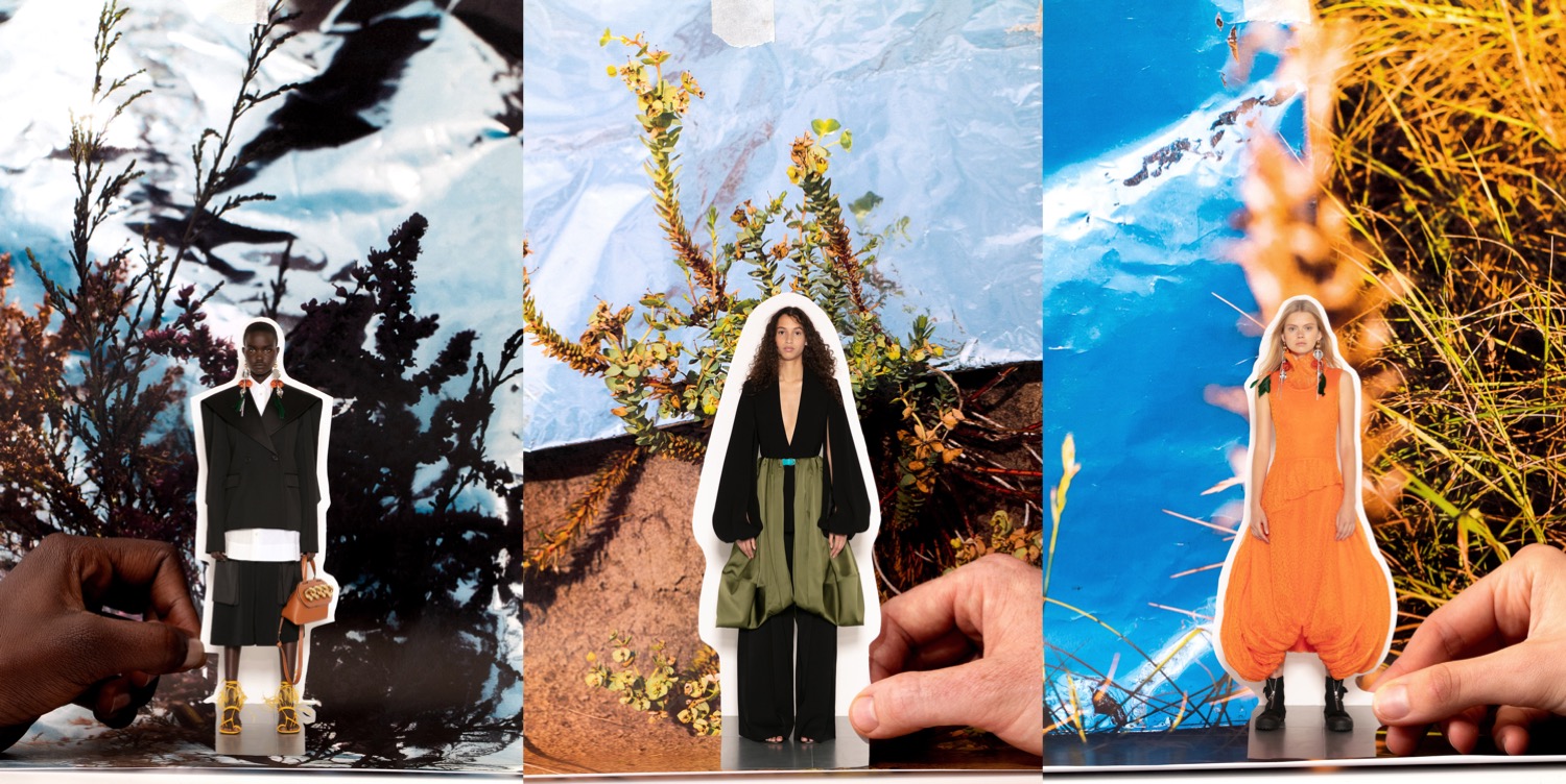 This is one of those JW Anderson collections that need no special explanations or expansive moodboards. It’s just so, so distinct to Jonathan Anderson‘s edgy style codes, that you can’t mistake it with anything else, really. Instead of a livestreamed fashion show, the press received a package wrapped in Oscar Wilde quotes: a book of papers and prints, and artful photographs all screwed together – and an enclosed gold coin, embossed with another Wilde quote (“the secret of life is in art”). Wilde proved both the literal and metaphorical means to unlock this collection, because, according to Anderson, “he was able to criticise the world but embrace the poetic reason within it; to look at the political, artistic, environmental landscape of his time and have a dialogue with it”. Equally, the writer’s affinity for the one-liner, he continued, felt particularly resonant during a period when that mode of communication reigns supreme. “This government has come up with so many – and I thought, how radical Wilde would be now with his ability to summarise a moment. Right now, people’s attention spans are very short, so things need to be very concise. And the clothing had to read like that, too: something easily digestible like a tuxedo, but with a puffball skirt belted onto it.” This collection was, essentially, an array of JW Anderson one-liners – not basic, but signature. “You know the look and you know that this girl belongs in this house,” he said of a loose-fitted pleated suede top layered over a panelled handkerchief skirt, or a white satin peplum blazer paired with matching cargo shorts. There was jewellery – enormous oversized earrings based on birdcage mirrors, or bejewelled brooches – which could transform almost anything into the spirit of the season and a wealth of easy-to-wear sophistication. But, alongside the fluid cuts likely to be required throughout spring-summer 2021, there was some exceptional tailoring, too. “It was important to grab onto that, onto things like the way in which we’ve explored tuxedos over the past five years, and really nurture it”, Anderson continued. Goodie!