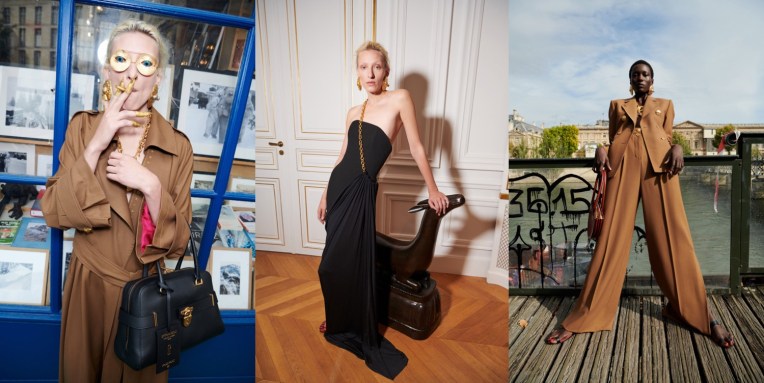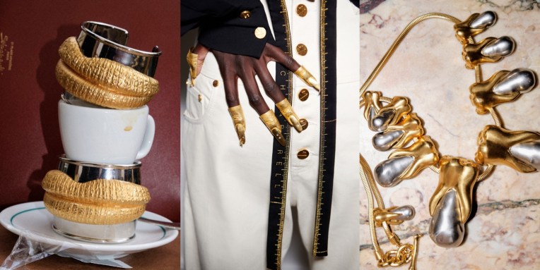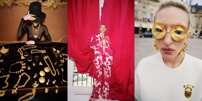 In a pretty short time, Daniel Roseberry has pushed Schiaparelli – a haute couture maison – forward to an extent in which its ready-to-wear line finally makes sense. Roseberry’s flair for the fantastic absolutely works with Elsa Schiaparelli’s aesthetic, and in the spring-summer 2021 line-up he manages to negotiate the balance between the Surrealism that was the legendary designer’s signature and the everyday. Speaking over Zoom, he said he approached the new collection with “a renewed energy to focus on what I want to say here, to capture the irony and what Schiap was about. Her legacy still lives really large, and it feels really true to this moment.” The pandemic has upended fashion. Some designers and brands are sitting this season out or playing it extra safe, counting on pajama sets and tracksuits to carry them through. Not Roseberry. In the look book photos he took himself (it’s interesting that many designers choose to photograph their collections), and in the behind-the-scenes video the brand produced, that extroversion comes across most distinctly in Roseberry’s fabulous gilded jewellery: eyeglasses with enamel eyes in the center, masks that cover nose and mouth, fingertip talons, and even nipple buttons. Those little and big, wearable artworks took Instagram by storm. The clothes are nearly as provocative. See: the white button-down with hand-painted breasts on the front, the odalisque prints on a shocking pink and white pantsuit (studies of Manet and Degas that Roseberry did himself), and the broderie anglaise with Surrealist faces picked out. There’s also a pair of minidresses, one ivory, the other black, with big inverted volumes. Roseberry took no half measures with this collection, and in this time of uncertainty and anxiety, that kind of conviction is a real turn-on – something we’ve experienced as well at Jonathan Anderson’s extraordinary Loewe.