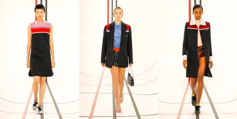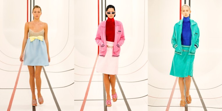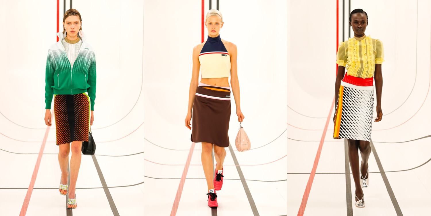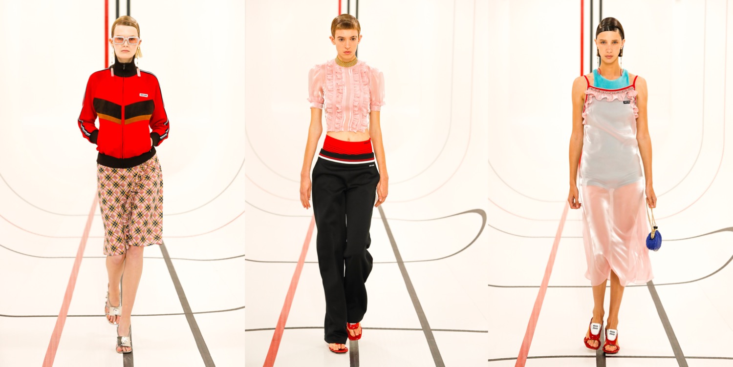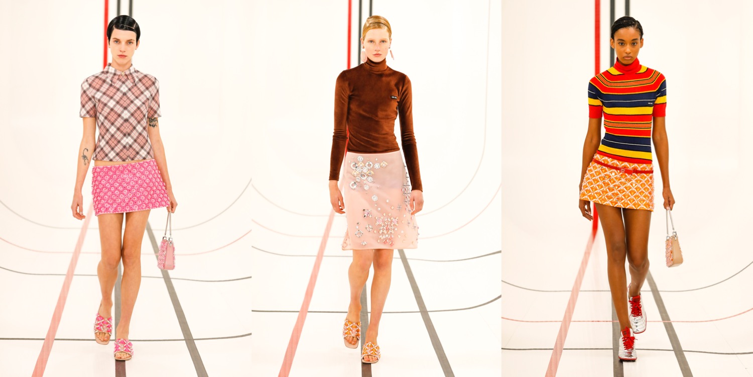 Is Miu Miu the “old Prada” now? After Miuccia Prada‘s first Prada collection with Raf Simons, which left the audience polarised, this seems to be a good idea for Miu Miu. But them, this was a quintessentially Miu Miu outing – really, the spring-summer 2021 collection is one of the best in a while coming from the brand. Livestreamed from Milan during the last day of Paris Fashion Week, the show set imagined a cyber-spacious sports arena covered in screens with the – also livestreamed – faces of Miu Miu poster girls watching the show, including Elle Fanning, Chloé Sevigny (one of the checked tops was the original piece she wore in the brand’s ad campaign shot by Juergen Teller!), Małgorzata Szumowska, Susie Lau and other Miu faces. Opened by Lila Moss, the collection captured the accidental uniforms of young people. It’s a wardrobe suspended between the extremes of the hyper-casual and that stilted sense of formality you get from a prom photo. “Polarity. These are polar times,” as Prada said in a statement after the show. “The reason why people dress is sometimes to please, sometimes to be sexy, sometimes to be socially relevant, sometimes for a job. The way you present yourself – the clothes are important because they define you in a second. Clothes are a tool for that message,” she continued. “The first spectator of yourself is you.” The Miu Miu show read like the Euphoria generation’s guide to effortless dressing: the things you wear through the process of learning the messages Prada wanted to convey about the role of clothes in life. Prim and pristine low-riding track pants, sharp track jackets, micro skirts, and kitten-heeled tennis shoes embodied the dress codes of sports activities. Sporty blazers, little bowling jackets, neat shirts, and plaid skirts evoked school uniforms. Conceived in the teenage dreams of perfect party outfits, there were techno-fied halter-neck shell tops and oscillating techy dresses. Then, some dream prom scenarios as well, like a white dress with a draped bow on the back that curtained dramatically to the side to reveal its pink lining. Prada’s show notes talked about the institution of the fashion show as a unifying event – something she wanted to convey through her livestreamed experience. Carried by the young women on her runway, that sentiment reminded some of us of the time we fell in love with fashion shows in the first place; in our teenage bedroom, chunky laptop at hand, waiting for the first runway pictures from our favorite shows to come in.