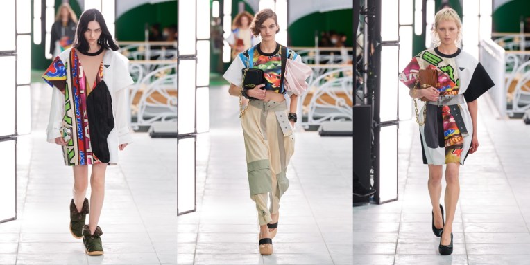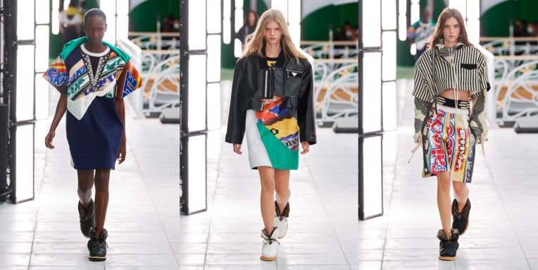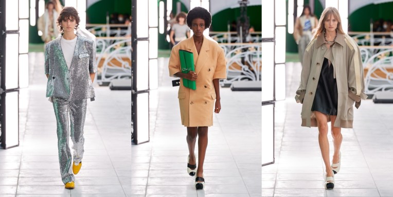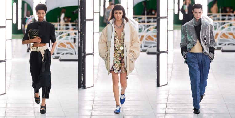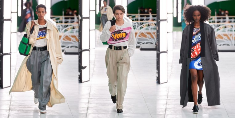 I’m really unconvinced by this Louis Vuitton collection delivered by Nicolas Ghesquière. It just felt so clumsy and messy. Which can’t be said of the show’s venue, which nearly each season looks better than the actual clothes on Vuitton’s runway (sorry…). Interspersed among the live audience in the freshly remodeled-by-LVMH La Samaritaine department store were 360-degree cameras that allowed viewers at home to swivel in their chairs, watch models coming and going, and see who did and didn’t score a better seat. It was almost like being there. “This season is very new in every way. The conditions that we’re facing are making us think differently. We came up with the idea of different degrees of presence.” In addition to the 360-degree cameras, green screens lined the walls and, in some places, the floors of La Samaritaine. Viewers of the livestream – the third way to watch and hear the show (there were live mics) – saw footage from Wim Wenders’s film Wings of Desire. Beyond the ’80s-ish silhouettes that have long been a touchpoint for the designer (and I think that’s the problem!), the connection between the Wenders movie and Ghesquière’s collection, was angels, which have two wings, but no gender. “My question this season was less about one theme; it was about this zone between femininity and masculinity,” he explained. “This zone is highlighted by nonbinary people, people that are taking a lot of freedom dressing themselves as they want, and, in turn, giving a lot of freedom to all of us. I found it inspiring to explore what the items are that represent this wardrobe that is not feminine, not masculine. I wanted to zoom in on that section in between.” The show began with a look that combined a timely Vote t-shirt (his absent American friends appreciated that) and baggy pleated chino pants cinched with a thick belt. It was emblematic of a collection that felt more spontaneous and street-ready than some of Ghesquière’s more glamorous outings. Basically, the entire line-up was kept in this sporty style. I’m intrigued by Nicolas’ take on the genderless fashion hitting such bourgeois brand as Louis Vuitton, but the clothes just don’t express that to me.
