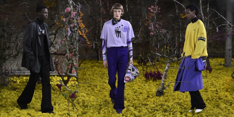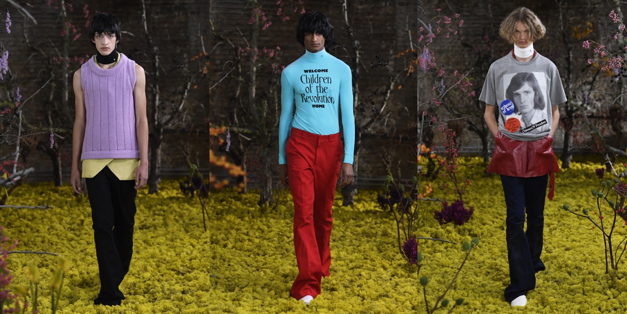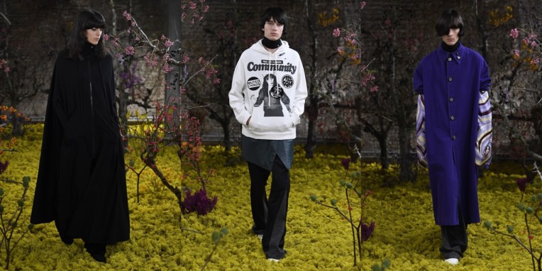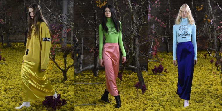 This season, we’ve had more of Raf Simons than usual – first in his new role at Prada back in September, and now in his name-sake label’s co-ed spring-summer 2021 collection. There are few working designers so vocally obsessed with youth culture as Simons. But the youth Simons seeks to explore isn’t exactly the youth of today – the young people advocating for climate justice, leading protests against police brutality and racism, and volunteering as poll workers. It’s his own youth that interests him. The metadata of his website, where he streamed his spring 2021 film “Teenage Dreams,” reads: “I don’t want to show clothes, I want to show my attitude, my past, present, and future. I use memories and future visions and try to place them in today’s world.” Designers are plumbing their own histories more than ever in this digital and isolated season, but this has always been Simons’s way. The press release for his teen dream collection lists the films that inspired him, many of which he has cited before, from Alien and Alice in Wonderland to Picnic at Hanging Rock and A Nightmare on Elm Street. That’s the totality of Simons’s statements on this collection, which features his first official foray into womenswear at this brand and his first fashion film since his start in the late ’90s, when similarly rakish models loafed about in Belgian photo studios and homes. Back then they smoked ciggys and drank champers and smushed into a single couch. In today’s film they populate in a nuclear floral set by Mark Colle: possessed, crawling on the floor, snatched into a web. As Simons’s youth in revolt slunk around in the film, punctuated by pulsing beats by Senjan Jansen, his signatures came into focus. The silhouette was as slim as ever and there was ample sloganeering and graphics, things his customers old and young adore, as well as photo prints of family members of Raf’s studio team. Raf stans will appreciate the continuity of his long lean silk skirts, colorful turtlenecks with R monograms at the throat, sleeveless tunics, and body-wrapping perspex tops. A big mustard knit, the sort of sweater Simons himself often wears, will be another fan favorite. It’s worn by both a male and female model, proving the point that while this is technically a womenswear debut, female shoppers have long found comfort in Simons’s work.