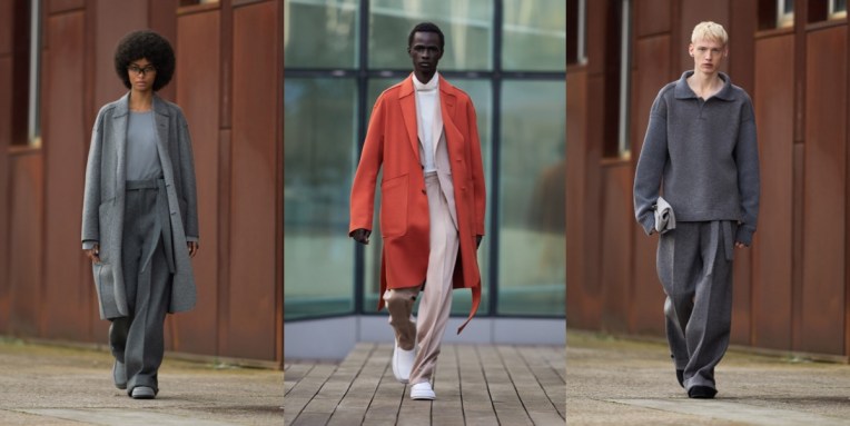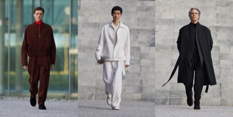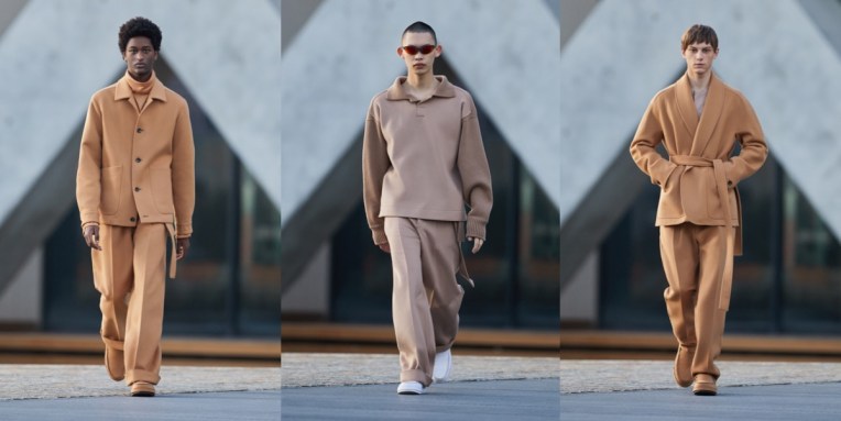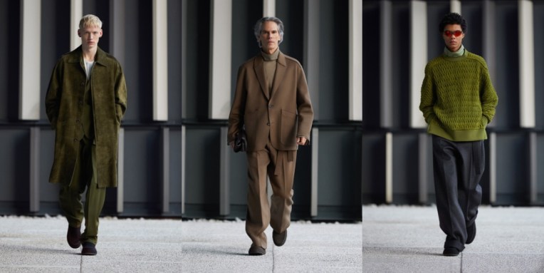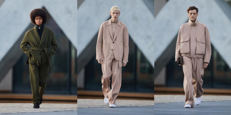 The “phygital” men’s Milan Fashion Week started really well with Ermenegildo Zegna‘s stunning exercise in stay-home refinement. Alessandro Sartori, the brand’s creative director, won’t let Zegna clients do WFH style in basic sweats. Just like the architecture of Milan’s Bocconi campus (Zegna’s HQ) in which the collection was framed, the clothes on show were hyper-contemporary yet contained echoes of past forms; some jackets in suede or felted cashmere bore lapels split at the collarbone, or pockets cut on the hip. Fine knit or even nylon turtlenecks – loose at the throat to create a fresh substitute for the shirt collar and consign to history the tie – had buttonable cuff details. These details were nods to a lineage of traditional tailoring that increasingly seems relegated to habit and history, yet the philosophy of tailoring was refreshed and applied to forms once deemed beyond it. Chore coats, updated leisure suits, and softened outwear—often with slit sides to allow the hands to nestle in cozy internal pockets – will all be offered on a made-to-measure basis for men and women. Like the single shoe style of the collection – a rubber-sole, shearling-lined slipper – these garments were built to service a post-pandemic world in which business life is expanded beyond the office to the home, or as Sartori put it, “a world where the indoor and the outdoor are colliding.” The indoor world was shown via a studio set of 12 open-wall rooms in which the models lived their best Zegna lives, sometimes connected, sometimes apart. Ultimate highlights of this season? The striped jacquard wool suit and overcoat and many of the cashmere jersey pieces which are in line with the Zegna “Use the Existing” policy of presenting its collections in fabrics made from materials recovered during the manufacturing process, a philosophy that is continuously being expanded in partnership with house suppliers to apply right down to shoe linings. Other items, like a long green coat in quilted suede or oversized sweaters decorated with stitched leather, might have been entirely new to existence yet demanded to be worn into vintage old age.