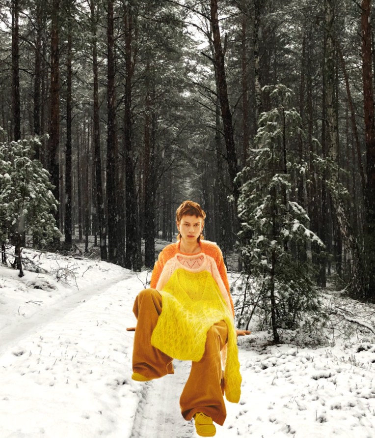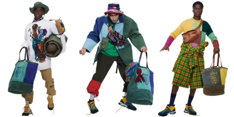 Amongst the collection is also a huge, cosy multi-patterned Shetland-cum-Norwegian type sweater, knitted together from upcycled yarns. It links directly into the work on sustainable research that’s been going on for four years with the Eye/Loewe/Nature collection. It’s much more than an isolated side-project, Anderson explains. “We set it up as an incubator inside Loewe to try to work out a long-term solution to sustainability. It’s where the entire design process is monitored from start to finish. Every year we try to chip away at something – buttons, zips, hardware, plastic clips – so that what was a problem becomes less of a problem. Because it then means that your supply chain can deal with it, manufacturing know how to deal with it, and the design team knows how to design within that framework,” he says. “And from those learnings, working with suppliers, we can disseminate elements into the bigger workings of Loewe.” In practical terms, it’s meant “buying a huge bulk of used knit sweaters, or denim, and working them into garments. The great thing is that the whole company is involved. What I like about the industrial side is the idea of talking to suppliers like YKK about a problem – and actually making it not a problem. The trouble is when you’re impatient, like me, you want to be completely sustainable tomorrow – but you have to realize it takes time. It means turning an industrial revolution into a new eco revolution. Ultimately, the big picture is, we all have to do it,” he says. “It’ll probably be an ongoing thing throughout my entire career.” If luxury goods companies ever worried that customers would baulk at buying products made of upcycled or non-traditional materials, then the testing ground of the Eye/Loewe/ Nature collection is beginning to prove them wrong. “This is the third collection now,” says Anderson. “And, you know, it’s becoming very, very popular.”