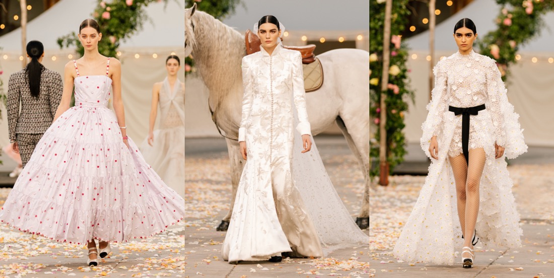 There seems to be an attitude division in haute couture industry these days. The first camp challenges the couture conventions and focuses on creating phenomenal wonders, like in case of Daniel Roseberry’s Schiaparelli. The latter does “pretty” couture – and this season, Virginie Viard‘s Chanel stays in this safe camp. Her spring-summer 2021 line-up felt like a nostalgic memory of dreamy garden party somewhere in the south of France in pre-COVID reality. These are not, as Viard told Vogue, the conventional fancy nuptials one might expect from a Parisian couture collection, but instead “more bohemian style – more a wedding or a family celebration in a village than at the Ritz!” complete with “the mother and the aunt, and the 15-year-old girl dressing up for the first time” – the latter in a tiny little grown-up black dress of spangled black tulle worn with 1980s opaque white tights. A very fête galante vision draws in one’s mind. There are also boys at this wedding, or rather girls who, in Viard’s words, are “a little garçonne” and dressed in old fashioned boys’ clothes – tweedy Oxford bags, and waistcoats for instance, a reminder of Gabrielle “Coco” Chanel’s appropriations of menswear in her designs, and her literal borrowing from the wardrobes of her lovers including Boy Capel and the Duke of Westminster. The mother of the bride, meanwhile, has some chic little suits in silvery embroidery and lace to choose from, or a skinny shrunken cardigan jacket embroidered by Vernoux, while more adventurous guests might opt for a lace jumpsuit or a tiny tweed coat dress with a ruffled overskirt to tie on like an apron. There are “a lot of flounces and petticoats,” Viard continued, as though the Gypsy Kings were playing at the celebration and the guests in those big tulle skirts were going to spin around the town square. “There is a masculine/feminine side to the silhouettes,” she added, and the fairy-tale grandeur of these pale net ballgowns is brought into the real world when those skirts are paired with white boyfriend shirts, or singlets of crocheted chiffon, worked by the embroidery house of Montex. While at a first glance the collection strikes with a certain, relaxing simplicity, the details are top knotch couture standards, of course. This season, Viard has also worked with photographer Anton Corbijn, whom she met when he shot her for the December 2020 Vogue profile, La Vie de Virginie, and whose music industry credentials – he has shot videos for U2 and Depeche Mode, among many others and directed Control, the magisterial biographical movie about Joy Division’s Ian Curtis – appealed to the rock chick in her. It’s a lovely collection, yes, but I really love seeing Viard doing something a bit more rough.