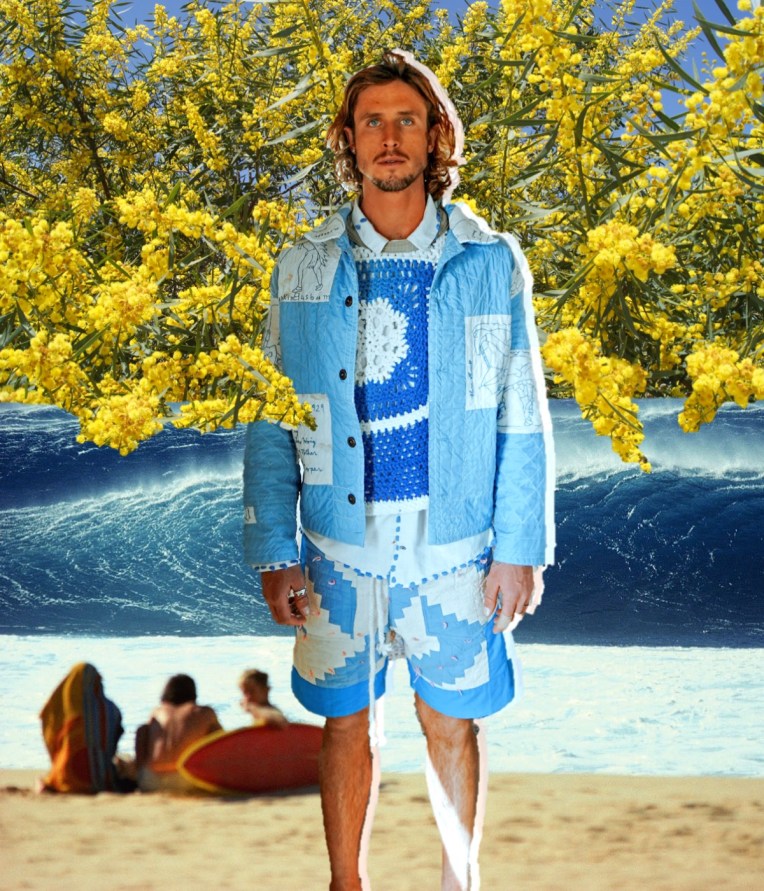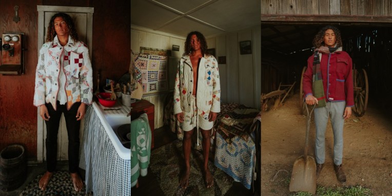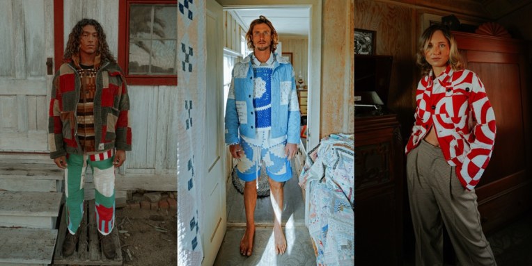 While New York Fashion Week feels very sleepy this season (due to quite understandable reasons), that state of slowness has has its advantages: there’s more time to discover the newcomers. Well, in case of Tristan Detwiler, he is new to the fashion insiders, but on TikTok, he has a following of over 133,000 users who watch him cut up antique blankets and quilts, some dating back to the 1800s, and transform them into chore jackets, Baja hoodies, board shorts, and cocoon coats. The videos offer a behind-the-scenes glimpse of the process and reaffirm Detwiler’s skills as a maker; when he wasn’t competing on University of Southern California’s surf team, he was taking fashion design classes and customizing his own clothes. Upcycled quilted jackets are Tristan’s brand Stan signature, with boxy, unisex fits that accommodate a multitude of sizes, genders, and ages. To hear him tell it, he made his first one in college to replace the quilts he draped over his shoulders for chilly mornings on the beach, but fell in love with the story behind old textiles, quilts in particular. In 2018, he joined the Bumann Quilters of Olivenhain, a group of ladies who have been quilting for decades. In addition to sharing the stories of their quilts and teaching Detwiler their techniques, they’ve gifted him with textiles and heirlooms to use in his collection. The opening jacket in his autumn-winter 2021 collection was made from one of those gifted quilts, a 1920s ‘one patch’ style in a checkerboard motif. It was large enough to make a matching pair of pants too. The second outfit’s ivory coat, chore jacket, and pants were all cut from the same 20th-century ‘wedding quilt,’ while other looks had a more haphazard mix. A jewel-toned jacket made from an 1890 Amish quilt was paired with trousers cut from a 1980s screen-printed potato sack. It’s worth mentioning that these items are already available to buy on Detwiler’s website; since they’re one-of-a-kind, fashion’s usual production time-table doesn’t apply (similar way of doing things at Imitation of Christ!). Detwiler describes himself as a storyteller and a curator, not necessarily a designer. He doesn’t aspire to be the next American mega-brand. But joining the New York Fashion Week calendar places him in the context of the mainstream fashion conversation, and inevitably draws comparisons to his peers experimenting with quilts and upcycling. Emily Bode comes to mind of course, though it isn’t really worth comparing their work; Bode’s is polished and fully “designed,” while Detwiler’s has the messier, intentionally rumpled attitude of California surf culture. Whether it’s a one-time fling or a serious venture into fashion, the vision of a sun-drenched surfer in his DIY quilted jacket and crotchet knit is compelling, especially in the COVID era.