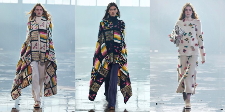 There’s an unofficial trend circulating this season: finding inspiration in powerful women from the past, often with a religiously-charged background. First, Bevza‘s designer mentioned Olga of Kiev as a reference for her knitted hoods and elongated silhouettes; yesterday, Gabriela Hearst talked about Hildegard of Bingen. A writer, composer, philosopher, mystic, and Benedictine abbess, Hildegard was a regular Renaissance woman, except that she predated the Renaissance by about two centuries. “I’m convinced,” Hearst said, “that if she had been a man we’d know her name like we do Leonardo da Vinci’s.” In fact, Hildegard sketched a Universal Man, not unlike Da Vinci’s Vitruvian Man, only hers was completed 300 years earlier. Hildegard resonates with Hearst because among her other polymath pursuits, she was an herbalist, a woman really at one with nature. “She believed in ‘green power,’” said the designer. The environment is a passion of Hearst’s too. Fashion isn’t the greenest of industries, but her company is making strides. She reported that last year 40% of the materials used in the production of her collections were repurposed and deadstock. Her 2021 goal is 50%. Hearst’s efforts around responsible design are at least partly why she was hired as Chloé’s new creative director in December (looking forward to her debut this Paris Fashion Week!). Hearst’s autumn-winter 2021 line-up is all about timeless, beautifully-crafted design that actually needs no further explanantions or mood-boards behind. Still, those behind-the-scenes details are intriguing. Hearst’s 12-year-old daughter Mia’s interpretations of Hildegard’s painted flowers appear as a print on a silk shirtdress and as crocheted appliqués on knit sweater and skirt sets. They also inspired a pair of extraordinary ruanas, hand-knit by the Manos del Uruguay women’s collective in Hearst’s native country. Hearst’s own renditions of Hildegard’s flowers were transformed into hand-painted belt buckles at the center of which she placed mano figas, talismans signifying fertility and, by extension, female power. As usual, the designer offers a well-edited wardrobe of soft, yet empowering tailoring, gorgeous dresses that can be both for the day and night and remarkable outerwear (knotting details at the shoulders softened the lines of a trench and the hem of another coat was finished with a deep band of macramé lace).