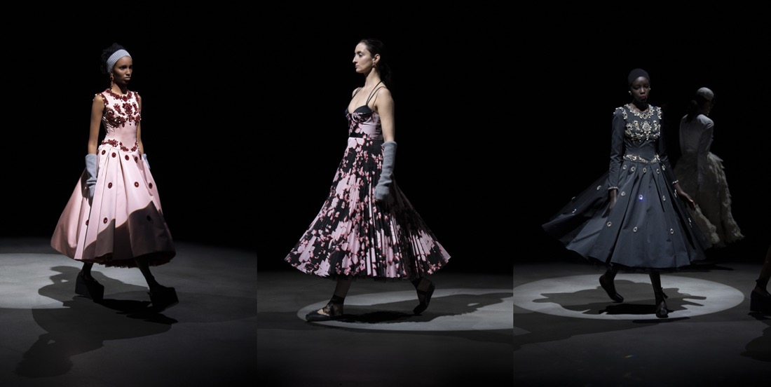 Erdem Moralioglu delivered a mesmerising collection. He is at heart a dramatist, forever living for theatrical moments. Conceived in the realm of ballet, his Erdem autumn-winter 2021 collection freeze-framed a dancer’s wardrobe between the stages of rehearsal and performance. “When I was working at the Royal Opera House, that was the moment I found so exciting: the dancers shifting around, criss-crossing, half-dressed in what they wear during the day and half-dressed in their costumes,” he said on a video call with Vogue, recalling Corybantic Games, the ballet he created costumes for in 2018. Incidentally, the contrast between a ballerina’s everyday dancewear and her ornate costumes served as a rather poetic illustration of our impending transition from domestic dressing to dressing up. The exquisiteness of feather-embroidered 1940s jackets, Swan Lake headpieces and plumed skirts, giant opera gowns daubed in night-time florals, and jewel-encrusted shirts came as no surprise. The gray ribbed knitwear fashioned into dramatic skirts that moved like pleats, into softly cinching cummerbunds, and body-conscious tops that had the elegance of eveningwear but the tactility of the comfort-wear of lockdown. With similar duality, he elevated ballet slippers onto stilted platforms that gave his silhouette an air of fetish. Perhaps that feeling was spurred by the narrative that underpinned his story: the relationship between Rudolf Nureyev and prima ballerina Margot Fonteyn, whose on- and off-stage wardrobe also informed proceedings. “The contrasts, the dichotomies of a dancer… that Hitchcockian self-possession and drive for perfection,” Moralioglu paused. “I find the psychology of it interesting.” Perfecting a look – a sculpted sleeve, a nipped-in waist, a little plumed hat, a pair of neat red slippers – seems shocking in our home-bound reality. It was pleasant to be reminded of that feeling.