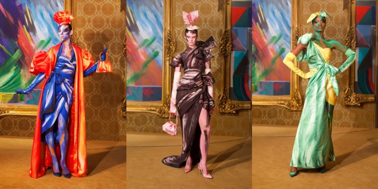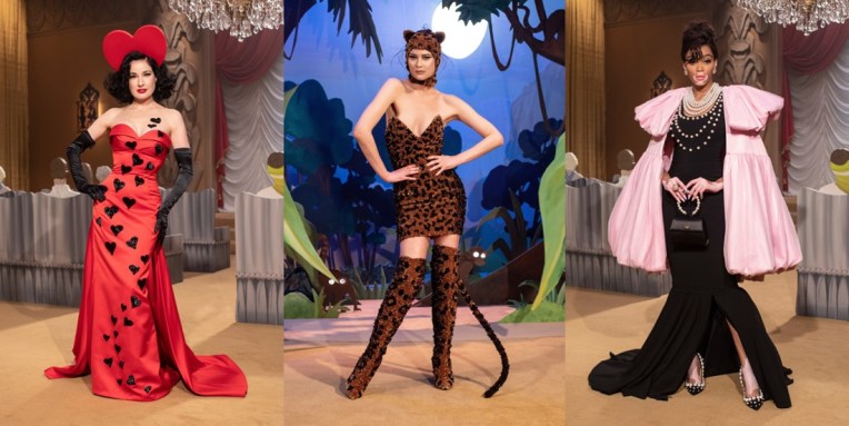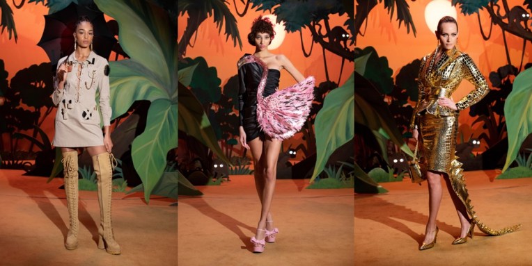 Jeremy Scott‘s autumn-winter 2021 collection for Moschino is hilariously good. Forget the lockdown-and-loungewear talk. Here’s total, camp fantasy. Possessed by the mad spirit of Franco Moschino, Scott has become a master of meta. He had to design this collection in tandem with the short film he wanted to make, with every model, look and dimension planned to precision before the clothes ever existed. There we were, sitting in front of screens as Scott knew we would, watching a digital show about a real-life salon show, which turned out to be a show within a show, all its players part of the line-up. In this imposed digital moment in fashion and life, Scott’s theater was a thought-provoking image of our current surreal lives: layers and layers of trompe l’oeil, in garments as well as their unreal surroundings. “I wanted to do things in film that you can’t do live,” Scott said on a video call from Los Angeles, reflecting on the two digital showcases he’s created during the lockdown period. Last season he designed a puppet-sized collection for a complex and fantastic marionette show. This time, he called upon 36 star models, It girls and pin-ups as diverse as Maye Musk (who presented the salon show) to Precious Lee, Dita Von Teese, and Winnie Harlow (who attended it), and Hailey Bieber, Miranda Kerr, and Shalom Harlow (who modeled in it). They staged a multi-dimensional portrayal of a lady’s everyday life: outfits for business, leisure, upkeep, travels and balls; all activities we haven’t had a reason to dress for over the past year. Even for a wardrobe designed for coming out of lockdown, the Old Hollywood Technicolor glamour of Scott’s collection – titled Jungle Red after the name of the nail varnish du jour in the 1939 George Cukor film The Women – was decidedly extravagant. “I guess I live in such a fantasy land I didn’t really think of it that way. I mean, you have to get dressed anyway, don’t you?” Scott quipped, rolling his eyes at continued fashion forecasts for comfort-wear. “Comfort schmomfort! What we need now more than ever is fantasy and glamour and things that make you feel wonderful, and I don’t think sweatpants do that.” So, call it a surreal wardrobe for surreal times: for lunch, little tweed dresses with purses dotted around them as adornment. For work, bankers’ pinstripe suits reconstructed into bustier dresses. For the countryside, Franco Moschino’s cloud and cow motifs unified on gowns alongside burlap potato sack peplum dresses – all delightfully impractical, of course, for the actual countryside. There was Kirsty Hume with a windmill on her head. And for afternoons at the museum, chic skirt suits cut like biker jackets, and paintings that came to life in brushstroke evening wear. Flamingo gloves framed the arrival of an actual dress shaped like the bird. Dita Von Teese closed the film in a show-stopping moment that was, quite literally, a cheeky statement of glamour in a time of dullness. All’s well that ends well, as they say. Let that be the concluding remark for this digital chapter in fashion history, which no one has aced quite like Jeremy Scott. Brilliant!