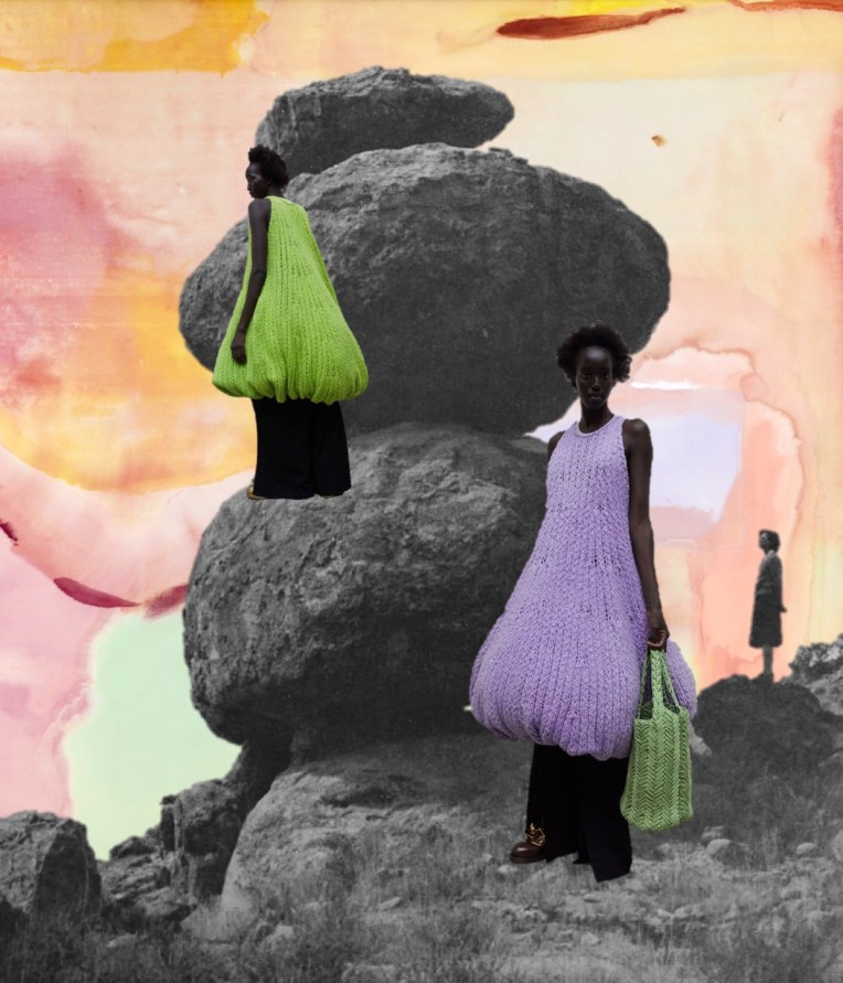 For some designers, the pandemic brought a sense of freedom, and also let them really rethink how to do things. Jonathan Anderson is an example. “I do not want to be bound by the idea that we have to show 60 looks, that we have to do this thing, that it has to be presented this way. I want to be able to have the freedom. I’m enjoying the freedom at the moment that we’re not part of the vehicle. And I didn’t want to put pressure upon pressure on my team – the last six months have been a nightmare. I said, ‘Let’s just focus on getting 19 fantastic propositions.’ I don’t want urgency. I want to just put it out when it’s ready.” Continuing with a format established several seasons ago, JW Anderson presented its women’s autumn-winter 2021 collection in the form of nineteen double-sided posters shot by Juergen Teller in addition to a video message from Jonathan Anderson. This season’s presentation is a curation and juxtaposition of Jonathan’s passions: art and fashion. Alongside the nineteen looks of the collection are portraits of Dame Magdalene Odundo DBE and Shawanda Corbett and their works. Anderson uses his fashion platforms as creative outlets for people he finds inspiring and wants to introduce to his audience. The designer got to know the internationally lauded Odundo when she loaned him pieces in 2017 for the “Disobedient Bodies” exhibition that he curated at the Hepworth Wakefield Gallery, a show that sparked comparisons between art forms and fashion forms (“I really look up to her. She’s one of the most important ceramicists of the 20th century”). He discovered the young American Corbett at the Corvi-Mora Gallery in London last summer. Corbett, who was born with one arm and without legs, creates vessels that she has described as “stand-ins for people,” as well as dance performances. “I went into that room, and there was nearly a landscape of people talking to each other,” he remembers. “It was incredible to feel the power and influence objects can have on you.” In both Corbett’s work and Odundo’s practice, he feels a physical connection. “This is about an exploration of two artists’ work, my own work, and the idea of the body. And that is what clothing is about.” For Jonathan the collection was an attempt to “boil everything down to beauty, silhouette and pose.” It is an exploration of volume, a recurring theme in JW Anderson womenswear collections, with a focus on totemic structures. Knitwear expands into extreme, cocooning shapes. The everyday becomes surreal in prints on trousers and tops. The body, grounded on sturdy boots with chain embellishment, is celebrated as a vessel. Like the art and the images, the fashion is “curated” (one of Anderson’s favourite words, both at his London-based brand and Loewe). The combination of art and fashion this season is embodied in hand-knit and woven blankets (four hand-knit blanket styles featuring works from Odundo and Corbett can be pre-ordered on the brand’s website) and the entire presenation is “one of the most personal projects I have ever done,” as Jonathan summed up.