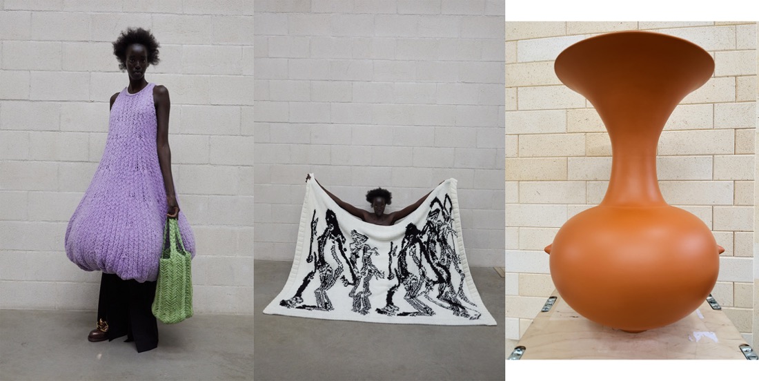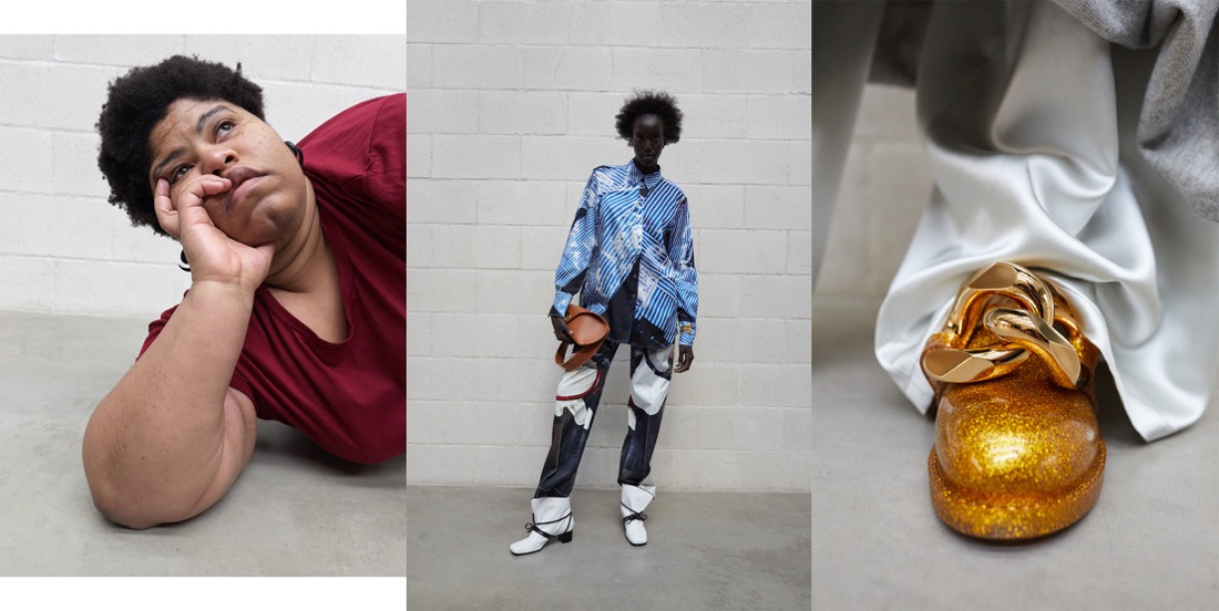 For some designers, the pandemic brought a sense of freedom, and also let them really rethink how to do things. Jonathan Anderson is an example. “I do not want to be bound by the idea that we have to show 60 looks, that we have to do this thing, that it has to be presented this way. I want to be able to have the freedom. I’m enjoying the freedom at the moment that we’re not part of the vehicle. And I didn’t want to put pressure upon pressure on my team – the last six months have been a nightmare. I said, ‘Let’s just focus on getting 19 fantastic propositions.’ I don’t want urgency. I want to just put it out when it’s ready.” Continuing with a format established several seasons ago, JW Anderson presented its women’s autumn-winter 2021 collection in the form of nineteen double-sided posters shot by Juergen Teller in addition to a video message from Jonathan Anderson. This season’s presentation is a curation and juxtaposition of Jonathan’s passions: art and fashion. Alongside the nineteen looks of the collection are portraits of Dame Magdalene Odundo DBE and Shawanda Corbett and their works. Anderson uses his fashion platforms as creative outlets for people he finds inspiring and wants to introduce to his audience. The designer got to know the internationally lauded Odundo when she loaned him pieces in 2017 for the “Disobedient Bodies” exhibition that he curated at the Hepworth Wakefield Gallery, a show that sparked comparisons between art forms and fashion forms (“I really look up to her. She’s one of the most important ceramicists of the 20th century”). He discovered the young American Corbett at the Corvi-Mora Gallery in London last summer. Corbett, who was born with one arm and without legs, creates vessels that she has described as “stand-ins for people,” as well as dance performances. “I went into that room, and there was nearly a landscape of people talking to each other,” he remembers. “It was incredible to feel the power and influence objects can have on you.” In both Corbett’s work and Odundo’s practice, he feels a physical connection. “This is about an exploration of two artists’ work, my own work, and the idea of the body. And that is what clothing is about.” For Jonathan the collection was an attempt to “boil everything down to beauty, silhouette and pose.” It is an exploration of volume, a recurring theme in JW Anderson womenswear collections, with a focus on totemic structures. Knitwear expands into extreme, cocooning shapes. The everyday becomes surreal in prints on trousers and tops. The body, grounded on sturdy boots with chain embellishment, is celebrated as a vessel. Like the art and the images, the fashion is “curated” (one of Anderson’s favourite words, both at his London-based brand and Loewe). The combination of art and fashion this season is embodied in hand-knit and woven blankets (four hand-knit blanket styles featuring works from Odundo and Corbett can be pre-ordered on the brand’s website) and the entire presenation is “one of the most personal projects I have ever done,” as Jonathan summed up.