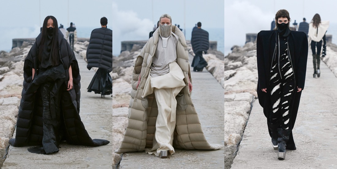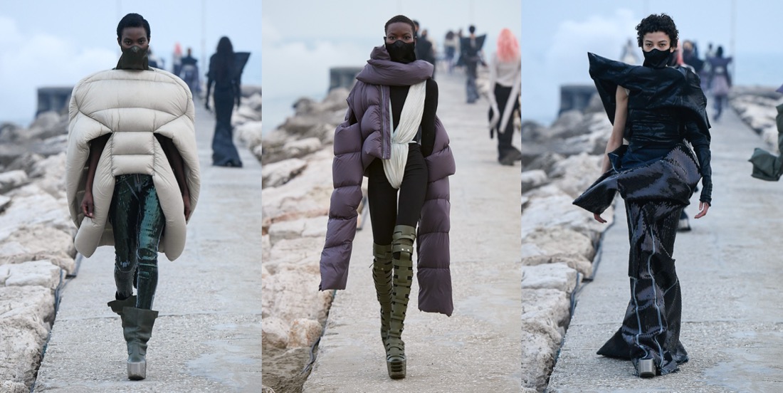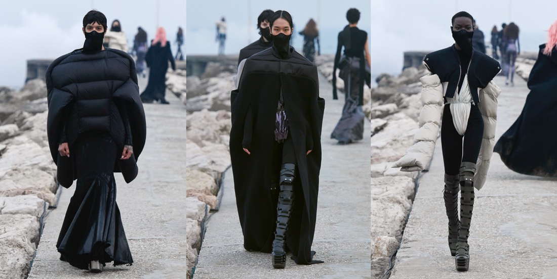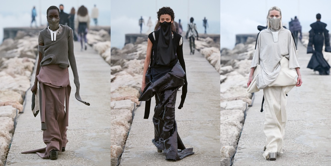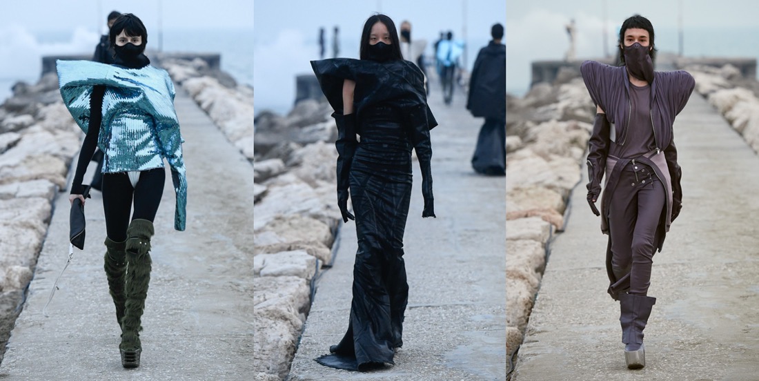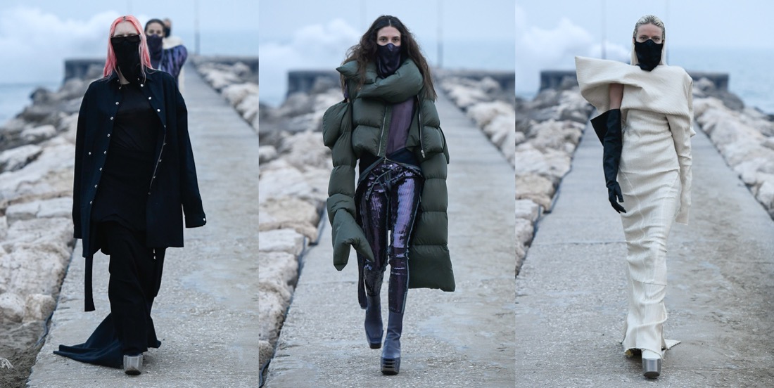 Rick Owens presented another incredible, made-in-lockdown collection, livestreamed straight from Venice Lido (the place where most of his brand’s goods are produced). “Doing these shows without an audience is becoming a kind of private ceremony because we’re sort of doing it for ourselves,” he told Vogue. “There’s a sweetness to it.” The runway was an actual concrete pier, and the background – a breezy, cold sea. The models looked like a troop of Giacometti sculptures, or aliens whose spaceship wrecked in the fog. The collection synthesized comfortwear of the pandemic – bodysuits, knits, the ubiquitous puffer – with the grandeur of haute couture. You’d be hard-pressed to find a more glamorous gown this season than this show’s closing look, a fully sequined ivory hourglass stunner with a sculptural, asymmetric neckline and a single sleeve that was worn with a black gauntlet and matching mask. To be honest, nobody today does draping as well as Owens. Equally fantastic were the couture-ish things he did with puffer capes and coats with his now-signature power shoulders. The use of sequins was an interesting take on femininity: the result was a “garment”, which appeared to be over-the-shoulder thongs worn with cashmere bodysuits. On the subject of underthings, the pentagram briefs from the January men’s show reappeared here wrapped around evening clutches, the implication being that these alien females had handled the “unhinged male aggression” that those briefs signified. Here’s what Owens had to say about it: “During times of strife, you gotta step up.”