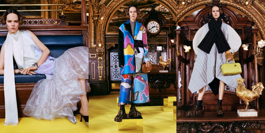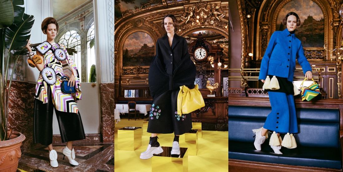 Last season, Jonathan Anderson went for a small collection of ‘un-commercial’, couture-esque dresses and full skirts. For autumn-winter 2021, his Loewe has more of the ‘ready-to-wear’ aspect, yet it still has that signature, fabulously-eccentric-lady style. It’s all about bold colours and mood-changing zigzaggy prints here; the curiosity of avant-garde shapes; perfectly placed, succulently colorful accessories; and what Danielle Steel is feeling about fashion. Say what? Go to Loewe’s website, and there, to be sure, you’ll hear the world’s best-selling novelist in a podcast with Anderson. This is “the ‘why not?’ era,” she remarks. “I’m much more into fun things now…. I like silly stuff. I guess I get more eccentric as I get older…. Life is serious enough!” The collaboration with Steel came about through Anderson’s connection with her daughter Vanessa Traina. In a continuation of his printed-matter lockdown show alternatives, he came up with a Loewe newspaper, within which is a trail of the first chapter of Steel’s new novel, The Affair. Neatly enough, it’s a tale about a New York fashion editor in chief. The paper, with all the pictures of the Loewe collection, is “being distributed to a million readers” including readers of The New York Times, Le Monde, and Le Figaro. In other words, it’s time to embrace the fun and euphoria of fashion again – or at least to be able to imagine ourselves into the time when we can. “As much as people always see the cynical in luxury fashion, there’s something in it that releases endorphins that make you feel good,” Anderson said in a Zoom call with Vogue. For the shoot, he rolled out the yellow carpet in Paris at the Le Train Bleu restaurant, his own office at Loewe, and a private members’ club off the Champs-Élysées. Elaborate settings for Anderson’s skilled composition of bold silhouettes, his subtly wearable pieces and a gamut of bags and shoes that deliver quirk to the adventurous and classicism to the conservative. “I don’t see this as a collection about fantasy. I think it’s about this idea of projecting what a new reality will hopefully be,” he said. “I think fashion is going to be important in the next while, in making people gain the confidence of going back out and dressing up again. The whole point of this collection is: believe it, and it will happen.”