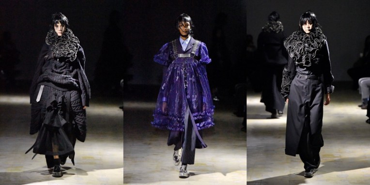 Entitled “Metal Couture“, Noir Kei Ninomiya‘s collection was all about excitingly unfamiliar silhouettes and extraordinary surfaces. This season, however, the designer takes a more aggressive approach. Those first looks featuring thin, stainless-steel spikes felt like an exaggerated, haute take on social distancing. The cylinder forms of tufty organza also seemed to say: ‘don’t bother me’. Black clusters of puckered organza (sea sponge–ish) look so tactile you wish you could actually touch them yourself to judge whether they are soft or razor sharp. Kei Ninomiya is a genius in creating organic-like garments that are both challenging and so, so intriguing.