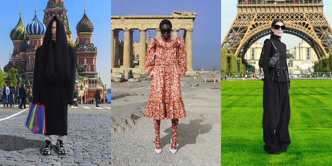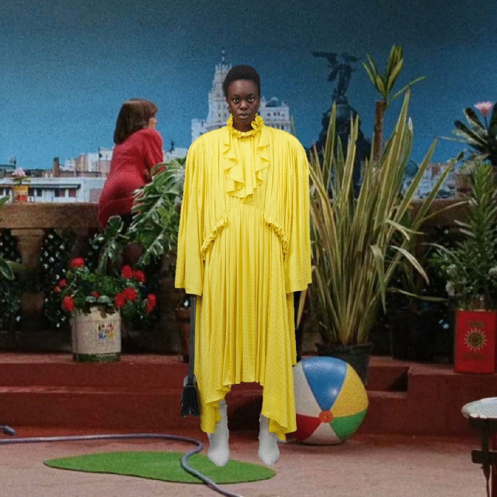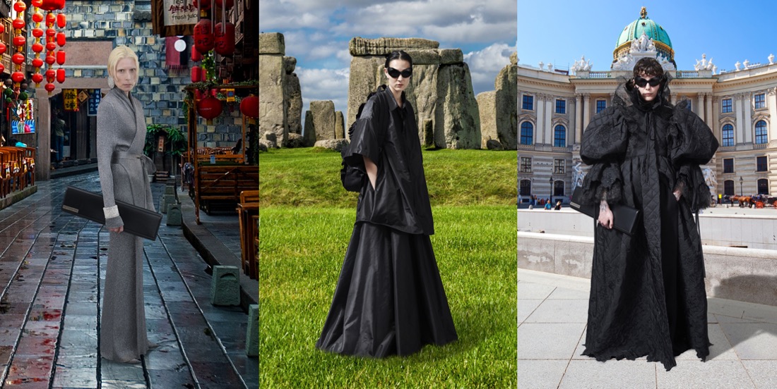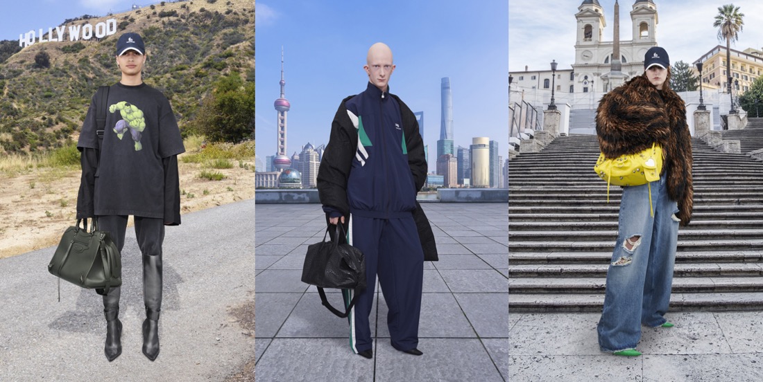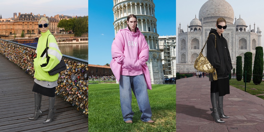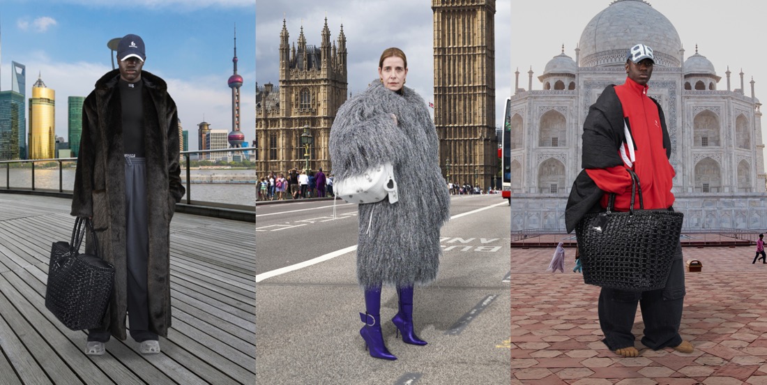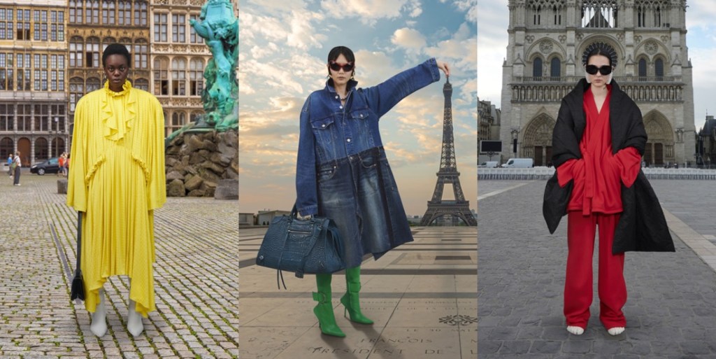 There’s always irony to what Demna Gvasalia does. You can tune into the pre-fall 2021 “Feel Good” Balenciaga video and not see any fashion at all – just a stock compilation of heart-warming running horses, kittens, children, and dreamy landscapes. But the most radical content in this Balenciaga outing is actually invisible to the eye. “When I started this collection,” Gvasalia told Vogue, “I said only show me sustainable fabrics. I don’t want to look at anything else.” So everything here, beginning with the pink hoodie to the black dramatic puffed-sleeve gownlike silhouette at the end, is made from recycled and otherwise certifiably okay materials. That’s big from a brand as powerful and as influential as Balenciaga, one of the major fashion actors of the universe which calls on suppliers who do significant volumes business with them. “As creative directors, asking for this causes a chain reaction, and we have to use it,” Gvasalia continued. Taking action on absolving shoppers’ anxieties about the damaging consequences of how their clothes are made ought to be the norm. Gvasalia promises that what’s gone into this collection isn’t a one-off gesture – because who isn’t suspicious of the greenwashing promo tricks of fashion these days? He started asking for better, more sustainable alternatives a while back, he attests, and began putting some of them into the collection in September. Now to the clothes: a photoshopped lookbook, posed against a wish-we-were-there travelogue of the famous backdrops of the world. Design-wise, there are just as many familiar Balenciaga-universe destinations here: the oversize hoodies, sweatshirts, tailoring; tweaked takes on signature floral-print dresses; recycled leather and denim things; magnified utility-worker jackets. A lot of the garments, Gvasalia said, are constructed as joined-together all-in-one pieces “trompe l’oeil, so what you see isn’t what you get. A lot of dresses which are actually coats.” So, too his lookalike ‘furs,’ which aren’t either animal pelts or petrochemical fakes. A brown chubby jacket and a coat are the results of hundreds of hours of chopping up and embroidering recycled cotton. They’re lavishly time-consuming hand-made pieces. Obviously, Gvasalia is keeping his creative powder dry for the long-deferred launch of the Balenciaga haute couture collection that he’ll show sometime this summer, pandemic willing. Meantime, predictive minds might leap to the elegant silhouette in black – full length, balloon sleeved, quilted and lace-trimmed drama that Gvasalia swears was inspired by the shape of Princess Diana’s wedding dress. It’s actually a coat. “ She’s wearing a t-shirt and jeans under that.” The Gay Pride hoodie worn with the padded stole (consciously a Demna-for-Balenciaga adaptation from Cristobal’s matching ensembles for couture customers) is another highlight of the collection. “I’m gay. I grew up in a society where I couldn’t have worn that, and there are places in the world that you cannot today,” the designer said. “It’s important to push through against homophobia. I’m not someone who goes out in the street and shouts. But this is the political fashion activism I can do.”