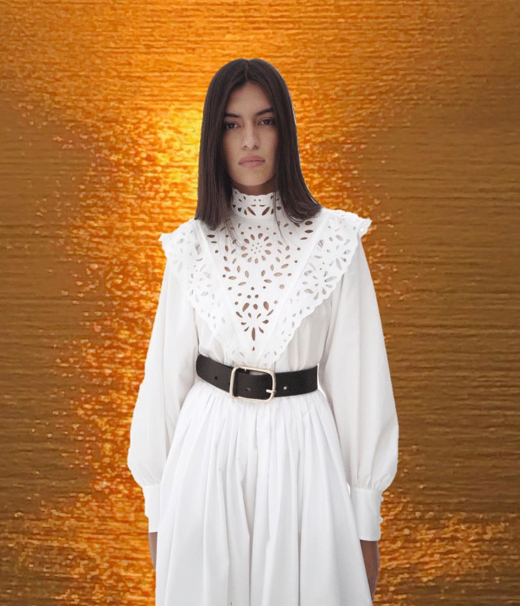 Gabriela Hearst delves deeper into the sustainable achievements of her Chloé residency, and it looks beautiful. Although I was not in love with Gabriela Hearst’s debut collection for Chloé, her next steps at the Parisian maison are promising. First, the direction of the brand’s Instagram, which is all about Zoë Ghertner’s raw, yet sensual photos of nature and female bodies – no aggressive product placement, no logo rebrandings, just idyllic visuals featuring poetic musings in the captions. Second, the resort 2022, which is a far better image of what Hearst vision for the brand really is. “We’re here on a mission,” she told Vogue, listing the impressive measures the house is taking to make its collections sustainable. If you came for the romantic mood boards and the classic tales of trips to the archive, this wasn’t it. “I haven’t gone to the archive,” Hearst said. “I feel like I’ve loved Chloé for so long and I have this idea of what it looks like. It’s not that I don’t respect what’s been done in its history, but I want the representation of what Chloé means to me to come out first.” Instead, the collection was an accelerated exercise in what we might discover to be our post-pandemic fashion mindset: What you wear is only as good as its social and environmental footprint. “We can’t deny what we went through on a global scale. Things are going to be different,” she said, referring to a cataclysmic year that shifted our understanding of environmental impact and made companies like Chloé – already on a sustainable path before her arrival – look to eco-conscious figureheads like Hearst. “Each collection is an opportunity to do it better,” she said. “I already did the least sustainable thing you can do, which is to have three kids.” In spirit, her proposal was geared toward those kids: the next-generation mentality Hearst says can’t come quickly enough. “We need to move out of the way and let them take over. They’re wired in a different way. They have a different perception.” In design, the collection’s Chloé-revering bohemian pragmatism reached out to generations somewhat older. Puritan-ish dresses were constructed in circular deadstock denim – with no metal, laser treatment instead of water, and recycled wood buttons – scalloped leather, and deadstock broderie anglaise. Linen trench coats trimmed with embroidered white edges demonstrated how Hearst might see a classic wardrobe staple through the instinctive Chloé lens she talks about. Blanket coats and fringed hand-spun dresses riffed on the hippie-esque references we historically relate to an eco-friendly wardrobe – not one for a cliché, Hearst likened them to techno dance parties. “Rave against the machine,” she punned, showing off a matching multi-color debut Chloé sneaker defined by its great, big stitches, every component created from recycled material. “I’m really attracted to product that feels handmade. I want to feel like a human worked on it.”