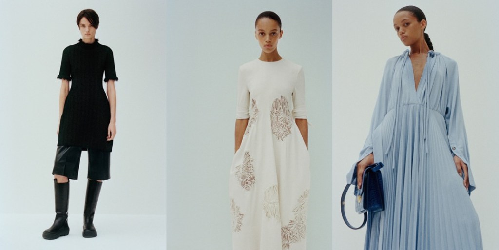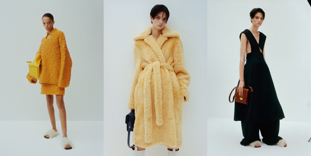 While nearly every single designer is musing on re-emerging and dressing up again as more and more people get vaccinated, the Proenza Schouler boys rather stay realistic. Lazaro Hernandez and Jack McCollough aren’t buying the roaring twenties, at least for the moment. “You want to hold onto some of that ease, some of that comfort, some of that intimacy that you had with the pandemic,” Hernandez told Vogue. “But then you want to introduce things that feel a little bit more nipped, more tucked, something a little bit more tailored.” They’re emphasizing knits in the form of ribbed tanks and pull-on pants that puddle at the ankles, and their high-buttoning jackets are made to be as easy-wearing as cardigans. Silhouettes are grounded by flat shoes, either fuzzy house slippers or thick-soled, heavy-tread boots of the sort that have recently been trending. The nipping and tucking Hernandez talked about was achieved in a couple different ways: a top and pants in oversized proportions were swaddled at the waist and fixed with a gold pin, while tunic-length bouclé tweed tops were slightly peplumed at the hips, creating a New Look-ish line that they kept modern by layering leather shorts and those big boots underneath. The clearest sign of the change to come, once we get past the pandemic, might be a chunky knit sweater and matching skirt combo that stands out not just for its eye-catching shade of marigold but also for the fresh mini-length of its skirt. I kind of wish there was more of that boldness in the designers’ latest offerings. Still, in its leggy, unencumbered attitude it looks like a compelling direction for the duo.