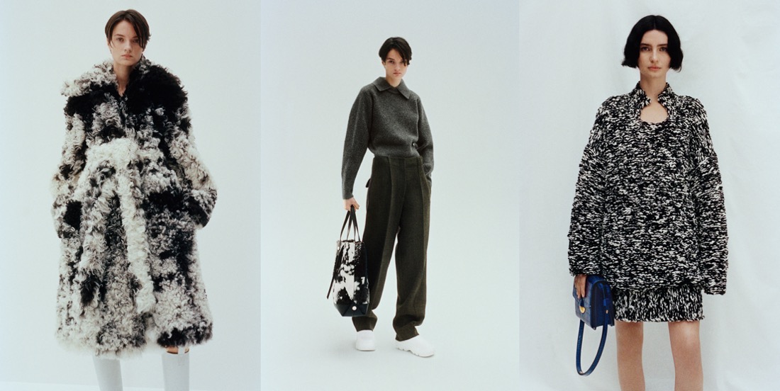 While nearly every single designer is musing on re-emerging and dressing up again as more and more people get vaccinated, the Proenza Schouler boys rather stay realistic. Lazaro Hernandez and Jack McCollough aren’t buying the roaring twenties, at least for the moment. “You want to hold onto some of that ease, some of that comfort, some of that intimacy that you had with the pandemic,” Hernandez told Vogue. “But then you want to introduce things that feel a little bit more nipped, more tucked, something a little bit more tailored.” They’re emphasizing knits in the form of ribbed tanks and pull-on pants that puddle at the ankles, and their high-buttoning jackets are made to be as easy-wearing as cardigans. Silhouettes are grounded by flat shoes, either fuzzy house slippers or thick-soled, heavy-tread boots of the sort that have recently been trending. The nipping and tucking Hernandez talked about was achieved in a couple different ways: a top and pants in oversized proportions were swaddled at the waist and fixed with a gold pin, while tunic-length bouclé tweed tops were slightly peplumed at the hips, creating a New Look-ish line that they kept modern by layering leather shorts and those big boots underneath. The clearest sign of the change to come, once we get past the pandemic, might be a chunky knit sweater and matching skirt combo that stands out not just for its eye-catching shade of marigold but also for the fresh mini-length of its skirt. I kind of wish there was more of that boldness in the designers’ latest offerings. Still, in its leggy, unencumbered attitude it looks like a compelling direction for the duo.