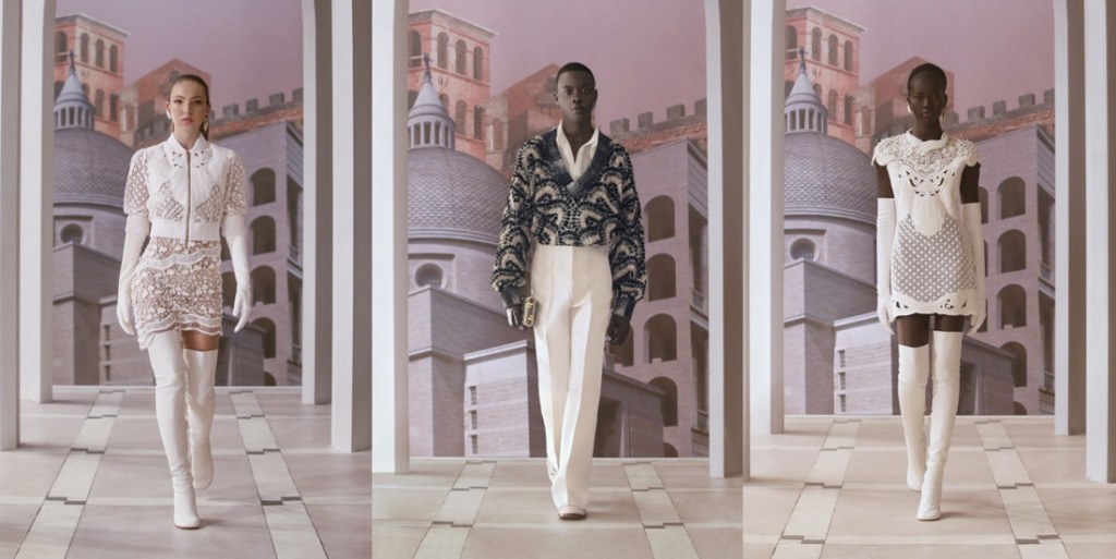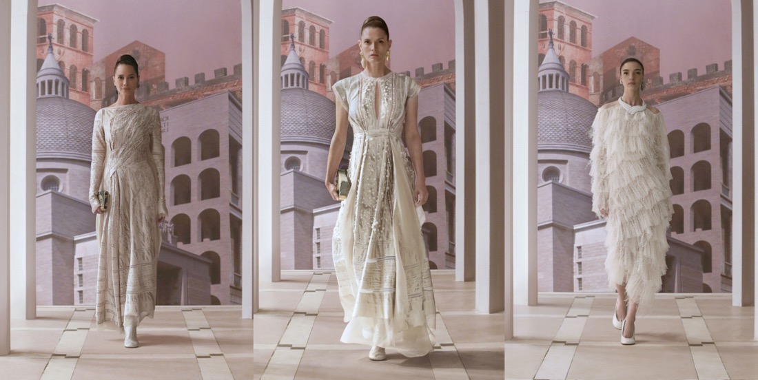 Kim Jones‘ second haute couture collection for Fendi was captured in an emotive film, which saw the likes of Kate Moss, Christy Turlington, Malgosia Bela and Amber Valletta gaze enigmatically into the camera as they wafted around a Roman theater set in dresses evocative of the stone and statues of the Eternal City. It was shot by Luca Guadagnino and scored by Max Richter. In the age of social media when big, beautiful dresses go viral, the direction Jones is setting for Fendi epitomizes a popular understanding of haute couture as something the eye can easily identify: bold ballroom silhouettes, sumptuous surface decoration and (very) famous faces. “It’s being optimistic about being able to socialize properly. I thought it was a nice moment to say that,” he said. Couture clients, Jones pointed out, “go to Fendi for something extravagant.” Two seasons into his tenure, his couture expression is manifesting itself in decoration and fabrication above all. His glamorous evening dresses serve as canvases for this finery, like the mother-of-pearl embellishment and recycled fur mosaic work that graced this collection. Watching it unfold, it feels like a formative process, as if all that intarsia and all those embroideries have been locked inside him for so long, waiting for the day when they could burst out into bona fide couture. Comparing to his heavy, over-worked January show, this one radiates with lightness and elegance that isn’t forced. To me, it felt like the mesmerising ambience of Rome. The film was inspired by Pasolini’s neorealistic Roman cinema, every architectural era of the city visible on its mock horizon. The fabrics and textures were informed by the buildings and pavements of Rome, some employed in statuesque lines that underscored the theme. Jones’s evolving exercise in the decorative aspects of haute couture made for eye-catching effects like the allover petal work of Moss’s oversized dress, or the marbling of Valletta’s swathing gown. Most compelling were the silhouettes that really took form, like the hypnotizing construction of a mosaic bolero jacket that resculpted the body through the volume-specific grammar of haute couture, or the dress worn by Mica Argañaraz, which demonstrated a similar idea in flou. “We had a lot more time to work on this one. We’ve actually had a full season. So, it’s a lot more worked into, and I think people will see a lot of difference in it. The people here, when they see what we’ve been doing, they can’t believe it’s the second one I’ve done. They say it’s a lifetime’s worth of understanding,” Jones concluded.