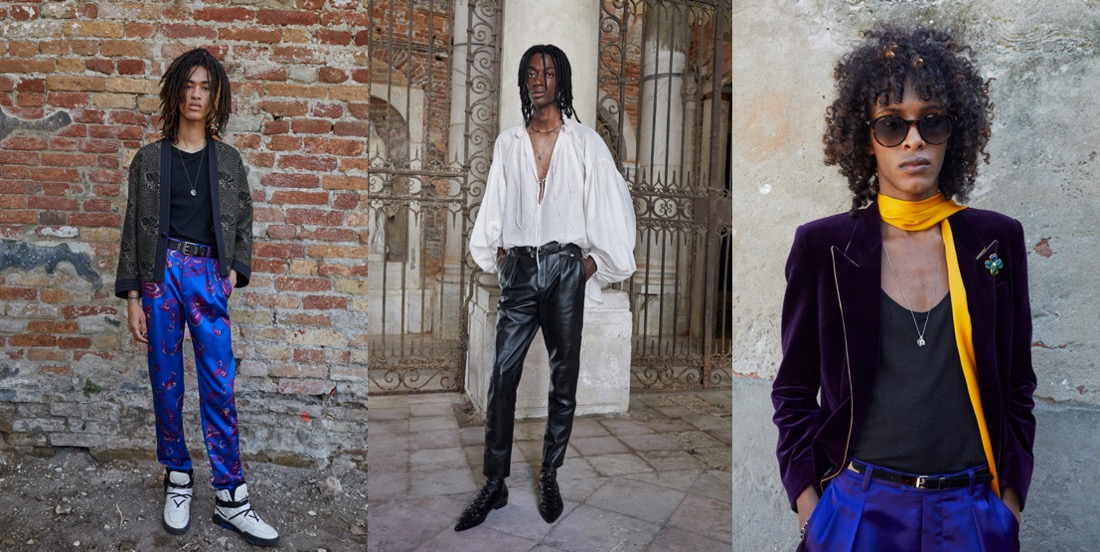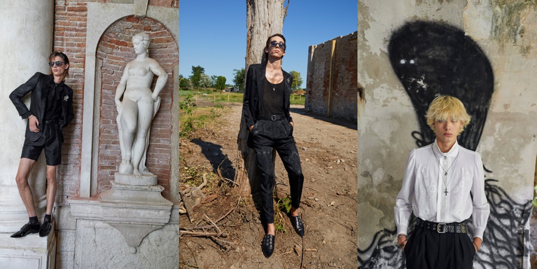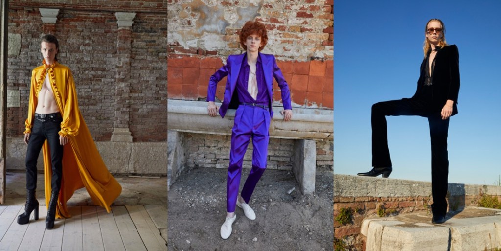 With Venice’s winding lanes and piazzas relatively empty, not exactly overwhelmed with visitors, an army of very slender wraiths, confettied with tattoos, bristling with attitude, and wafting around the city’s fabled landscape, seemed even more conspicuous. These proved to be the (extra, extra skinny) models and brand icons of Anthony Vaccarello’s Saint Laurent, in town to walk the runway in the designer’s collection. In keeping with the city’s current focus on the possibilities of architecture, Vaccarello collaborated with the genre defying artist and filmmaker Doug Aitken (who won the International Prize at the 1999 Venice Biennale) on an environment to showcase his collection. Aitken created Green Lens, an amazing mirror-faceted structure that was assembled in a month on the Isola della Certosa, and planted with hot house jungle greenery. It serves as a response to the question posed by the Biennale, harmoniously blending futurism with the natural landscape. “All the sets of Saint Laurent I’ve always done myself in a way,” Vaccarello explained, at the magical post-show dinner set in the roofless ruin of an old brick structure on the island, “so it was nice to share a concept for the first time with an artist who I truly admire, and it was fun. That concept was supposed to be for the women’s show last year,” Vaccarello added, “and because of the pandemic we pushed it to now. In the end it made more sense to have it in Venice than in Paris, especially with the Architecture Biennale – and with that collection, which is a mix of a lot of influence of Saint Laurent and a lot of Venetian ‘New Romanticism.’ Not putting them into the historical, classical Venetian way, but in a futuristic environment. I think after COVID you want to look more into the future than the past – and I like that mix of the past in the references in the clothes, and the future in the setting.” During the fast-paced show the structure reflected the blue skies, dusk light, and dappled lagoon waters while Aitken’s lighting transformed the mood from moment to moment, suggesting by turns a flaming sunset or a glacial blue Scandinavian dawn. Refracted in those mirrors, Vaccarello’s tribe strode forth in lean jackets or billowing piratical blouses, and cigarette-leg pants with winkle picker ankle boots extending the slender silhouette further still. In a timely reversal of the endless womenswear borrowings from the traditional men’s wardrobe, Vaccarello also had fun exploring the unparalleled Saint Laurent archives for women’s wear pieces that could be appropriated by the guys, including jacquard crepe de chine blouses and shirts from the early ’70s, cropped toreador jackets and spencers from Picasso line-up, and a padded brocade bolero from the China collection reimagined as a bomber and worn with black jeans, as well as a number of variations on Le Smoking. In homage to the host city there was Venetian carnival drama too in the dramatic billowing capes, including one in brilliant yellow silk that evoked a faille example shown in Saint Laurent’s autumn-winter 1983 haute couture show. “I think it was fun to see how a young guy could assume it,” said Vaccarello of his gender fluid propositions, “And I have to say they assumed it very naturally, [whether] a lace shirt, or platform shoes.” With this most convincing menswear line-up to date coming from the designer, hope to see more of such moments coming from Vacarrello in the future.
