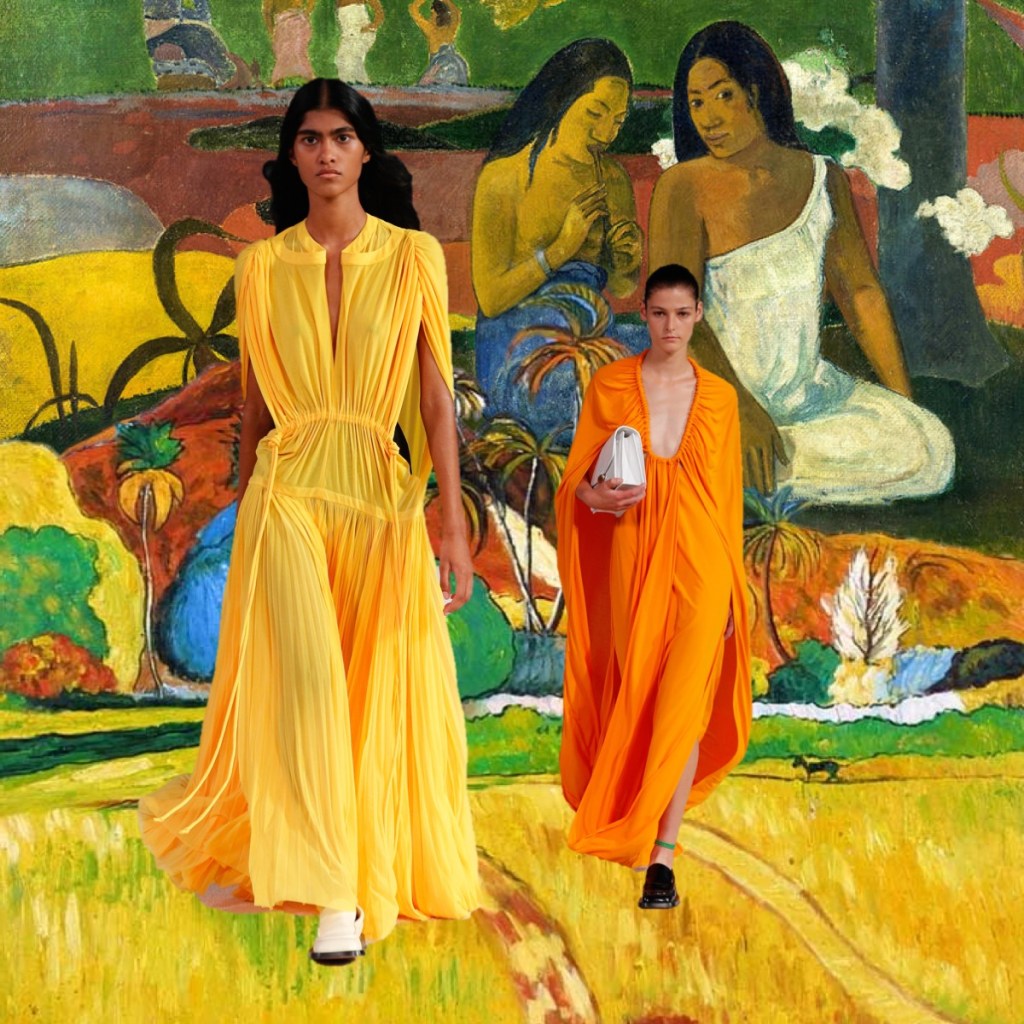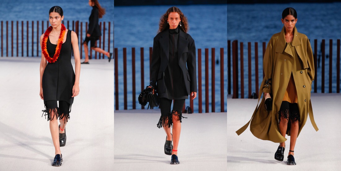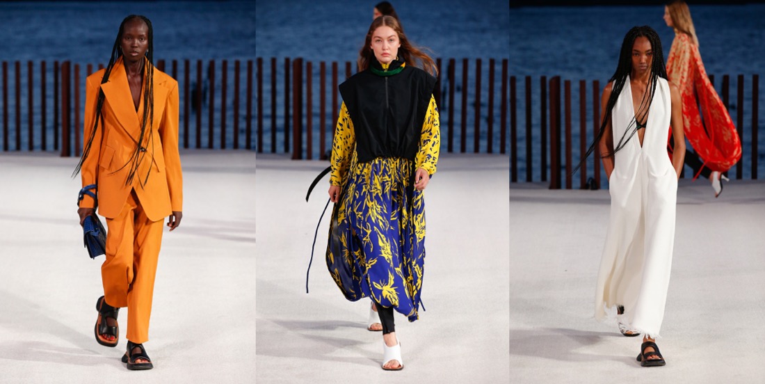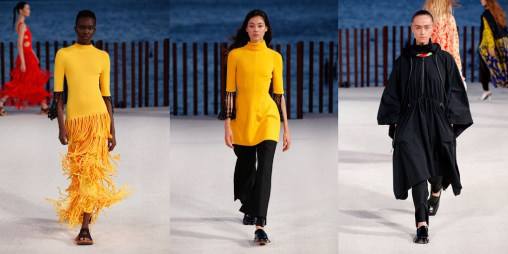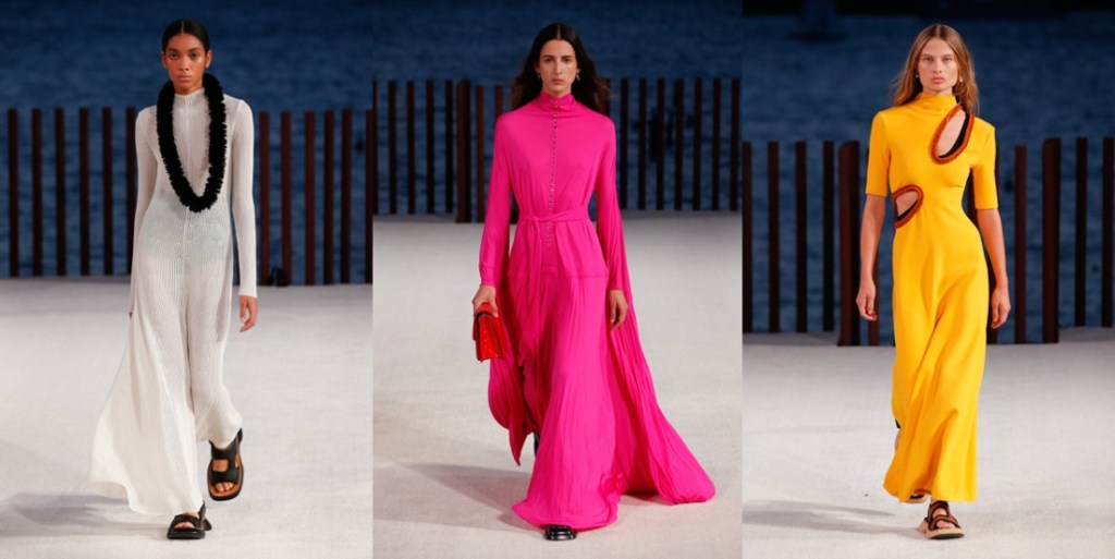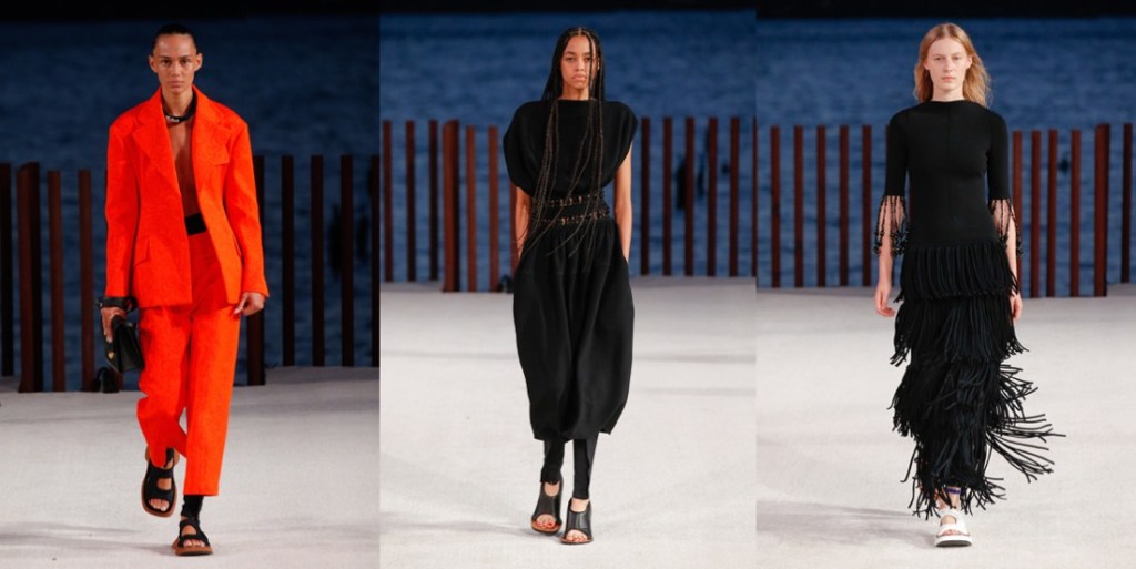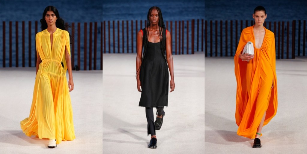 Proenza Schouler radiates with a laid-back, easy-going, summer-ish energy this season. There’s a reason why. Lazaro Hernandez and Jack McCollough made Kauai their “home-office” during a period of pandemic time – it’s their favourite destination that they call their “sanctuary.” The island vibe influenced their new collection, which mixed scuba and surfing motifs, a color palette plucked from nature, and a few handmade leis from Maui with their more urban fare. Backstage after their Little Island show, they clarified that Hawaii wasn’t a literal reference, but rather a starting point for the collection’s ambience. Most of all, “they’re joyful clothes to step out in the world again.” There were suits, but they come in vivid shades of coral or orange cotton jacquard. Basic black, meanwhile, isn’t so basic when suit bottoms are cut tight like bicycle shorts with swingy fringe below the hems. A pair of block-printed floral dresses with looped hems had verve; the designers pointed out that the prints were the same on the front and back of the fabric rather than being reversed, a complicated technique to pull off. The point of the collection was not to look complicated – who needs too much sophistication after the tumultuous times? The gowns, in gorgeous acid colors, were made from fine gauze jersey, perfect for beach strolling. “They stretch and move, we all want to be comfortable.” This was one of the best Proenza Schouler collections in seasons, even though some Phoebe-Philo-Célinisms can’t be ruled out of their vocabulary.