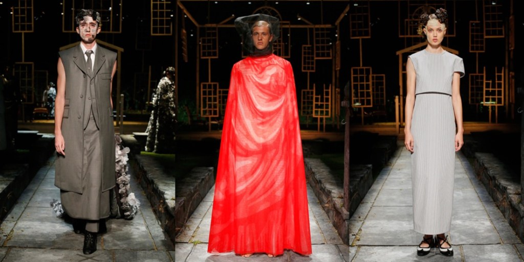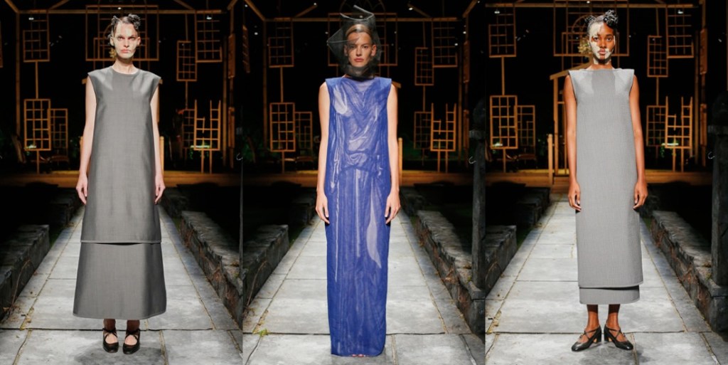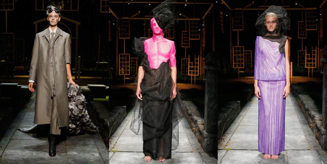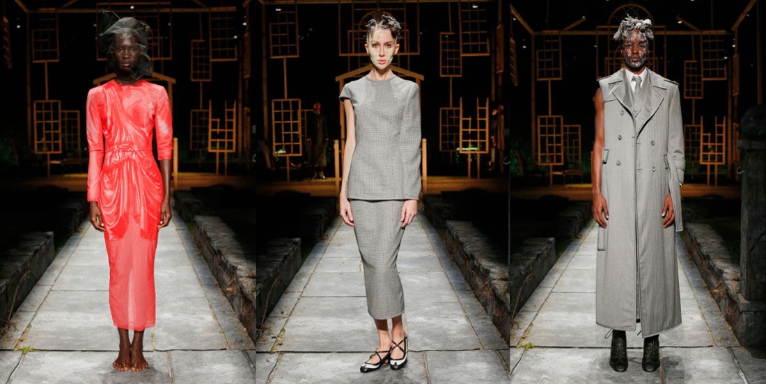 No one in New York does opera-level drama like Thom Browne. At his spring 2022 presentation, which was an artistic performance and a fashion spectacle at the same time, the audience could be carried off in awe in so many directions: pegasuses rode penny-farthings, a couple of bachelors haunted a raw wood house, models turned from shrubs into statues… just wow. The presentation began with a voice-over about a couple of bachelors stuck indoors, looking out over an aging garden. Classic statuary, the tradition of carving a marble block into a contrapposto David, charted the show’s three parts: part one, twenty Platonic suiting ideals; part two, the pure marble slab as tunic and maxi, fastened with a hook-and-eye up the back; part three, a trick of the eye, a flex of artistry, full force in tulle. At the end, the show’s two bachelors chained their gates, unzipped each other’s gray wool dresses, and orbited each other, never quite touching hands. Passion thrives in the littlest gestures; Browne’s show was full of beauty to pluck your heartstrings and stoke your sartorial flame. And oh, the details! Those rainbow-color tulle dresses that made up the finale, with trompe l’oeil drapery and abs (the exact Greek statues Browne visited were in The Met), were not painted, but dozens of layers of tulle built up like a topography of the human form. Teddy Quinlivan’s long sheath had an arm sewn to the torso, and the models who walked in the show’s first passage were layered in at least four Browne tailoring separates. This show was not only awesome for its theatricality but for its scale; other designers would struggle to make a single garment to Browne’s standard. Browne made about 200. Each of those 200 shirts, pants, skirts, suits, jackets, bags, shoes, and hand-made gray flowers was, in not-so-coded language, a love letter to American fashion. Browne moved his show back to New York for one season only in support of his partner Andrew Bolton’s exhibition “In America: A Lexicon of Fashion” opening at The Met this week.