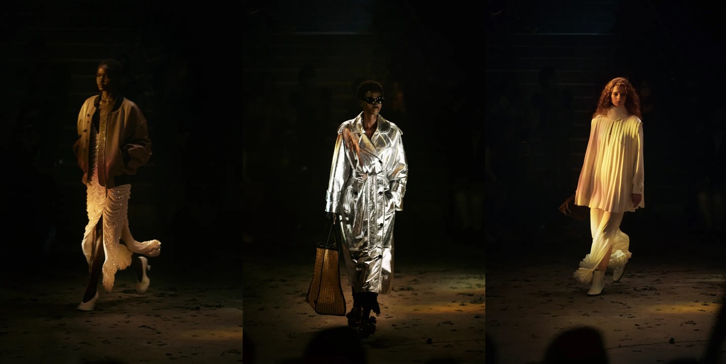 Khaite’s spring-summer 2022 show was incompatible with Instagram, from the intentional lack of photographers to the (also intentional) dim, hazy lighting. This was Cate Holstein‘s intention. Set in the bowels of a Lower East Side apartment building, there were wild green vines climbing up the walls, tumbling from the rafters, and snaking across the floor, as if we’d descended into an overgrown, long-forgotten basement. It was something of a metaphor for New York’s resilience and regeneration, and echoed a collection designed for the equally resilient New York woman. Much of Holstein’s focus this season was on the touch and feel of the clothes – and not just in the materials but how a garment might alternately embrace or liberate the wearer. Gigi Hadid’s opening look was a luminous ivory satin coat lightly filled with down, “like your duvet cover, but more elevated,” said Holstein at a preview. “I think it’s still important to be gentle to ourselves,” she added. A crinkled organza bubble dress would be almost weightless on the body, while a new hand-stitched satin harness might feel satisfyingly snug over a T-shirt. A chrome sequined mini was deliberately heavy, she noted, “to ground you.” These are details that can’t be captured in two dimensions, but make all the difference IRL. “I think we’ve really established the brand’s character, so now it’s about pushing our materials and construction techniques,” said the designer. Holstein pointed out a ruched sequined dress in glittering pale gold, styled here with an oversized chocolate bomber. The effect was of a woman heading to a glitzy party – maybe her first since lockdown – and on her way out the door, she throws on her everyday jacket, not a fancy evening coat. Why fuss when you can be comfortable? Now more than ever, she’s less inclined toward prescriptive full looks and deeply curious to see how each customer puts their own unique spin on a Khaite piece.
