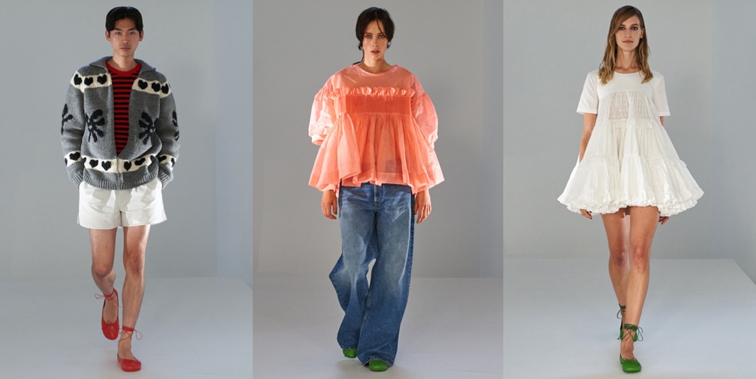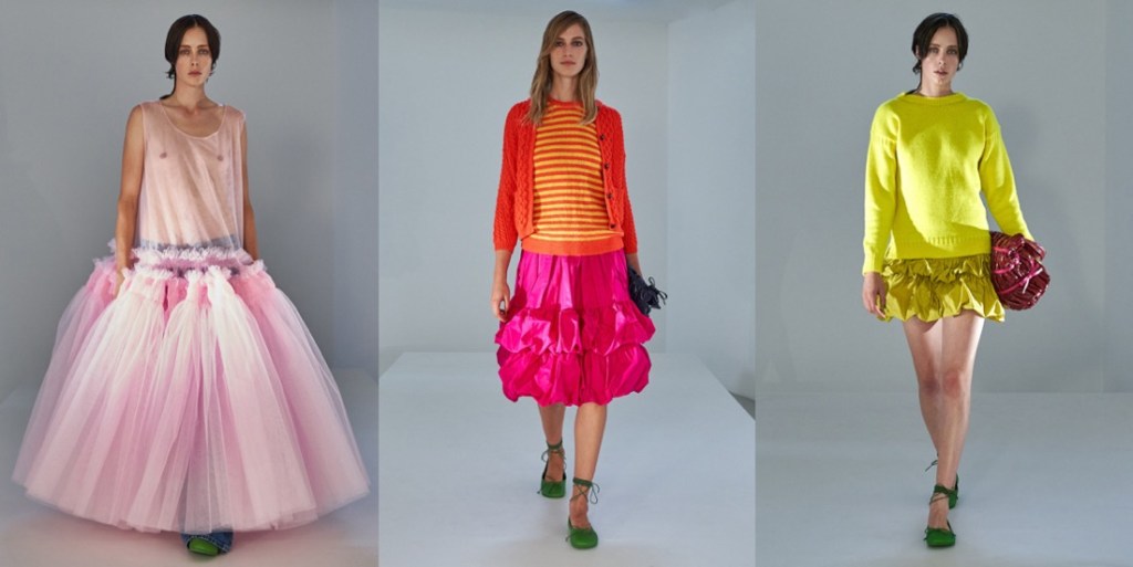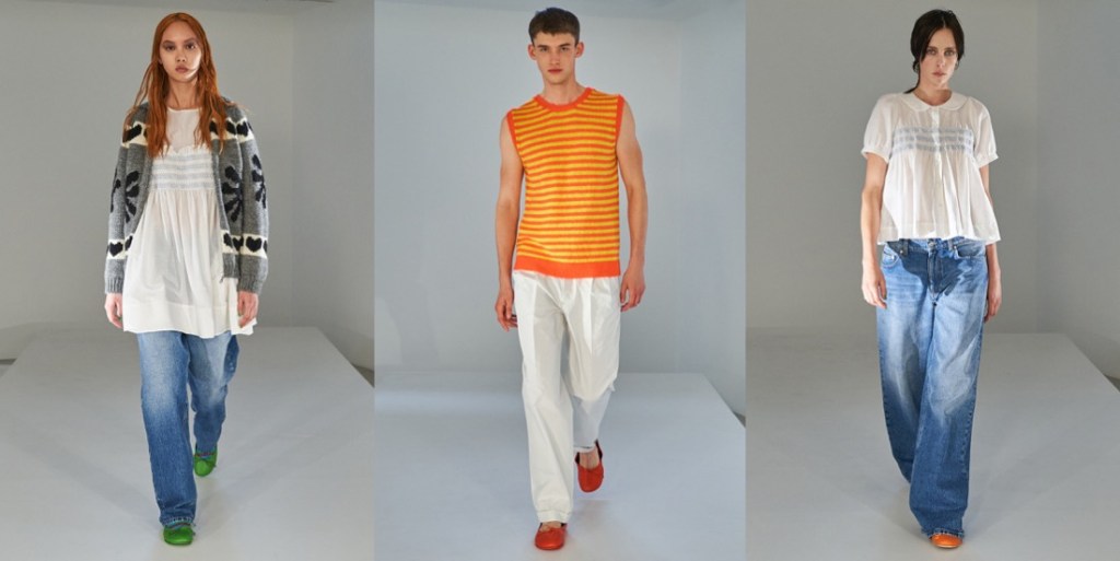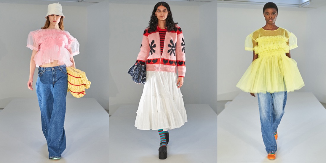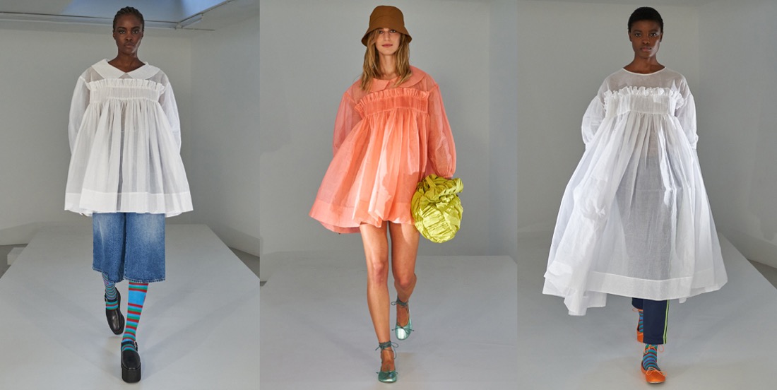 It’s a baby-boom among fashion designers in London! Both Molly Goddard and Simone Rocha have returned to the new season with infants. Molly’s Frank was charming visitors with appointments at her studio this morning, while his mother was explaining how being pregnant made her “think about baby clothes” for the spring-summer 2022 season. In fact, it’s intrinsic to her origin-story as a Central Saint Martins fashion student: “My graduation collection was all based on blowing up the dresses I had when I was a child,” she said. That’s where her obsession with smocking grew. This was a woman-centric staring down, laughing at and toying with whatever toxicity might be meant by “Lolita.” The multiple meters of pink net which typically explode from this designer’s little baby-smocked bodices are definitely not for women who simper. There’s one of those dresses in her spring collection: a classic Molly Goddard party frock. More noticeable, though, is her diversification from full-on going-out clothes. Instead of a show, she shot a video in her studio which demonstrates what Molly Goddard people can wear all of the time. Excellent wide-leg jeans. Neon-bright Guernsey sweaters and Aran knit cardigans. Smocks to layer over track pants. Menswear – including flared trench coats, stripy sweaters and ballet flats. Next season, Goddard is aiming for a full runway show again. In the meantime, her baby-time has generated as much joy as ever, and possibly even more clothes that a lot of people will want to have in their lives.