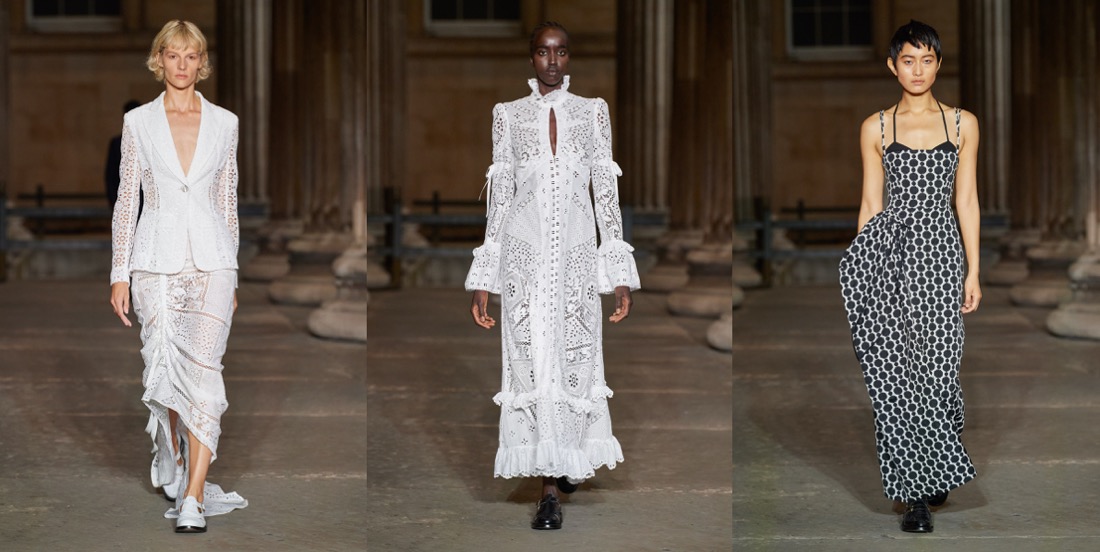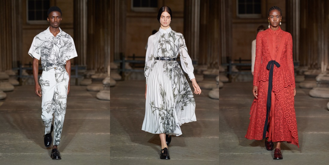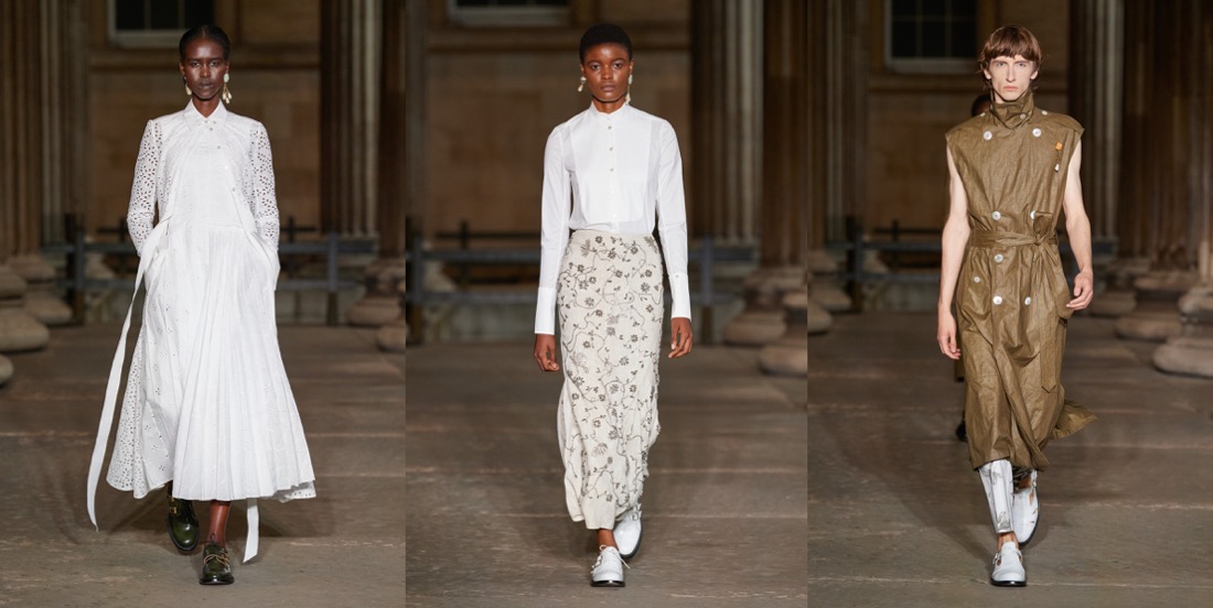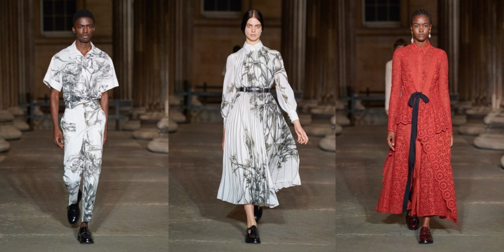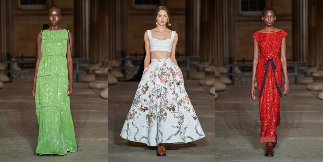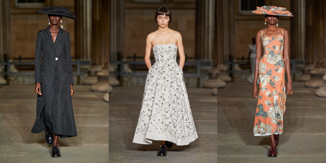 Ever since Erdem Moralioglu moved into his new house in Bloomsbury during the pandemic, his work has taken on a more demure and sober character. Somehow, the fusion between that sensibility and the old-world glamour that underpins his oeuvre feels appropriate for now. Dramatic, but with balance. Erdem’s 15th-anniversary collection – and first runway show since the pandemic – captured that dichotomy in a purified and clarified ode to his own body of work. Presented in the colonnade of the British Museum (in Bloomsbury), he envisioned it through the wardrobes of Bloomsbury’s best: Edith Sitwell and Ottoline Morrell, whose spirits he could easily have come across on one of his evening strolls across Bedford Square. “I was really fascinated with these two women – both six foot – who knew each other, and donated to the British Museum,” Moralioglu said backstage, highlighting their independent and formidable approaches to life in the early- and mid-20th century. “Both women lived outside of the time that they actually lived in: Ottoline Morrell dressed in kind of Edwardian dress in the 1930s, and Edith Sitwell would wear something kind of medieval. They were displaced and disjointed in terms of time and pace,” he observed, with words that could have described the last 15 years of Erdem collections just as well. Throughout his own history, he has freely and defiantly traveled the annals of fashion history at large, spinning fantastical narratives around characters and events drawing on fact and fiction, and brought those looks into contemporary contexts. This collection was no different. While its silhouettes were carved from the first half of the previous century, Moralioglu twisted them out of their prim lines and switched opulent fabrics for “poor” ones, using instead embellishment as his richness factor. A delicate floral embroidery curled around dresses looked almost like an industrial chain print, quilted floral skirts were kind of wrong but cool, and lace dresses transformed into knitwear de-prettified that girly trope. Styled consistently with unfussy brogues – and showed alongside the terrific sturdy-romantic menswear he launched this summer – those tactics created a sense and sensibility that spoke to that post-pandemic appetite for the gentle grand gesture.
