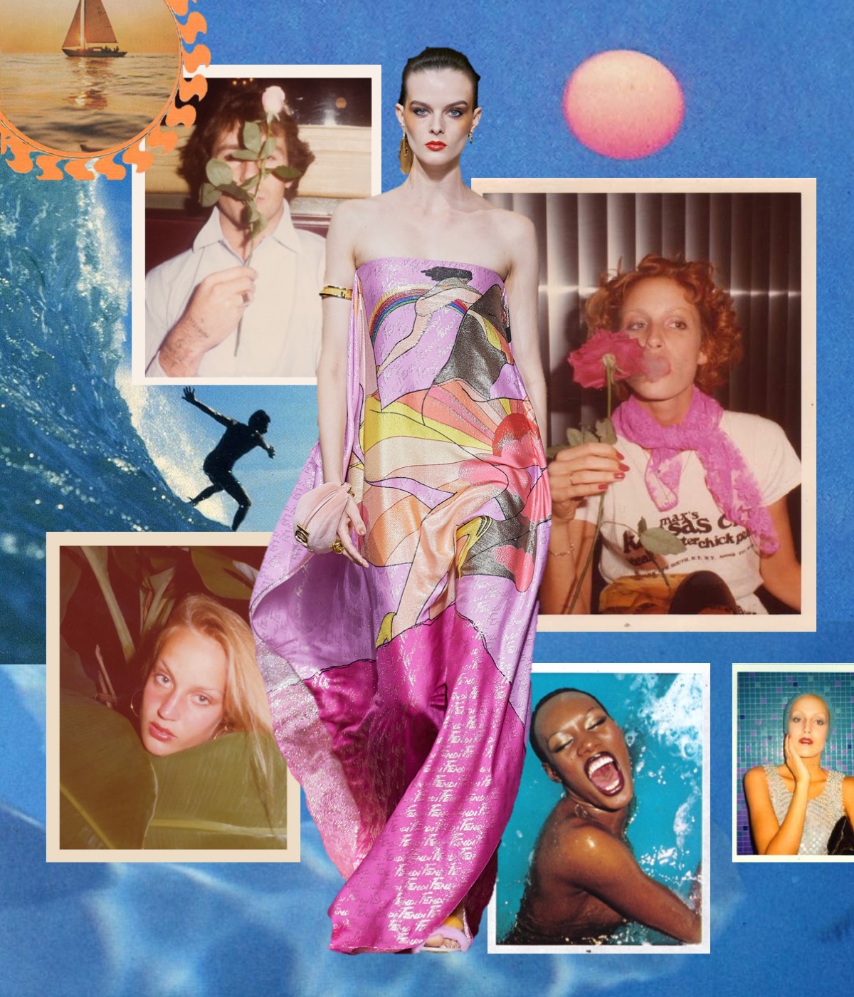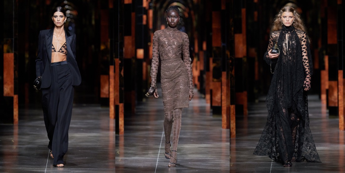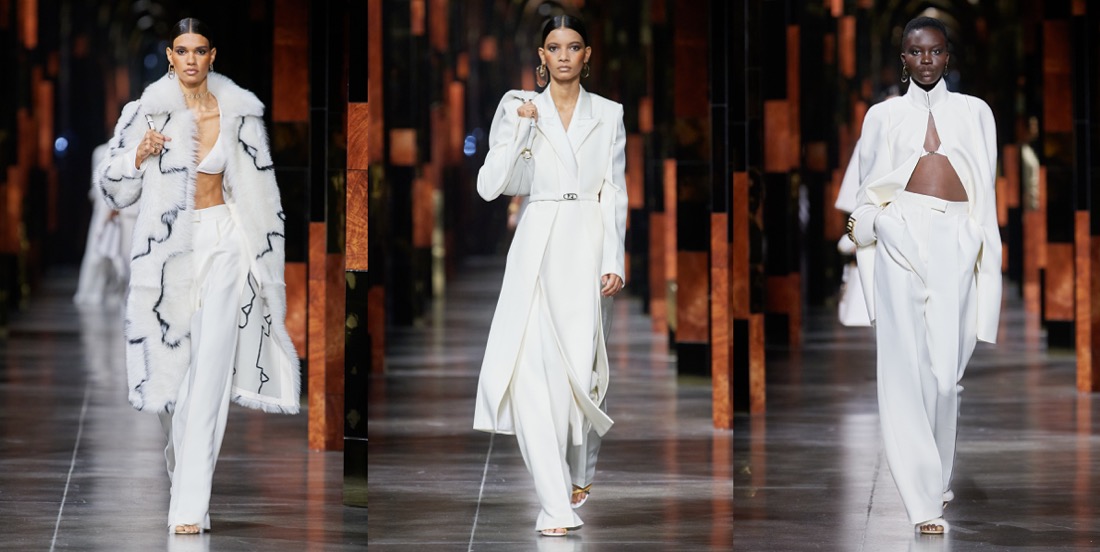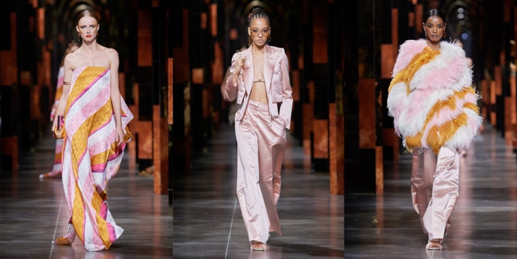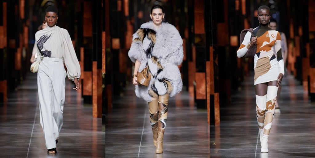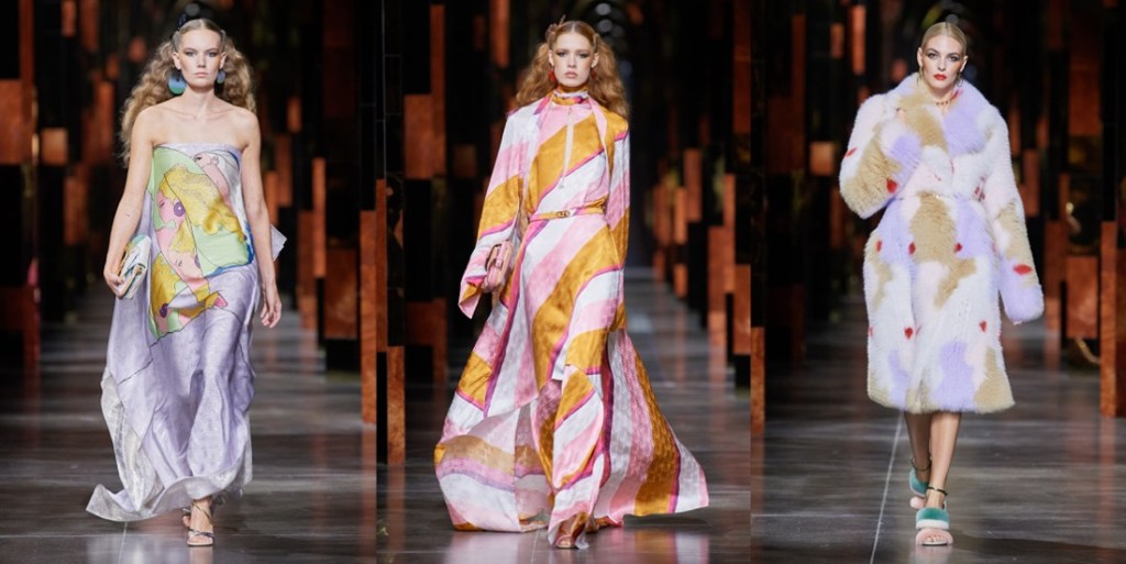 Kim Jones’s spring-summer 2022 collection for Fendi was a line-up of classically-flavored silhouettes and color progressions played against an irresistible decorative sample of archive Antonio López illustrations. The models glided out from backstage down a runway whose arches echoed the house’s Roman home, the Palazzo della Civiltà. The big reveal of this collection, the decoration, rotated around the vintage Fendi logo drafted by López during his period of collaboration with Karl Lagerfeld. Said Jones of López: “He was a big, big fashion influencer for a lot of people, but is not so talked about. He had this relationship with Karl and with Fendi, and he helped shape so many strong visions of women, because he loved them: that feels very authentic and topical.”The illustrations drawn from the López estate’s archive originated, Jones said, as the 1960s transitioned into the 1970s. Here his work was introduced via oversized brushstrokes, then zeroed-in upon via one particular drawing, a rouge-lipped profile of Jane Forth that was abstracted into the pattern that contoured four vivid intarsia and jacquard looks. Color became more impactfully calorific as further illustrations of wavy-haired and cherry-lipped rainbow-framed women were worked into kaftans, a fringed tapestry-woven Baguette, intarsia leather thigh-highs and silks. Plexiglass jewelry by DelfinaDelletrez was shaped in gold-edged transparent lily leaves, another López signature. Many looks remained illustration free, yet even without the figurative signposting, these outfits echoed the aesthetic of the period in which López was working. Just like Jones’ debut collection last March, this was… a proper-looking collection. Quite dangerously, Kim leads Fendi to that type of predictably classy, beige-y, luxury Italian brand category, which Lagerfeld avoided at all costs.