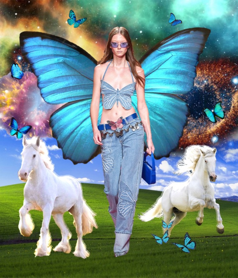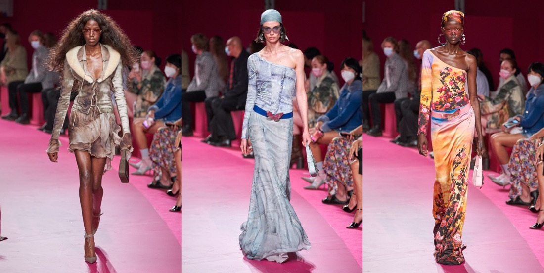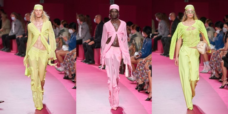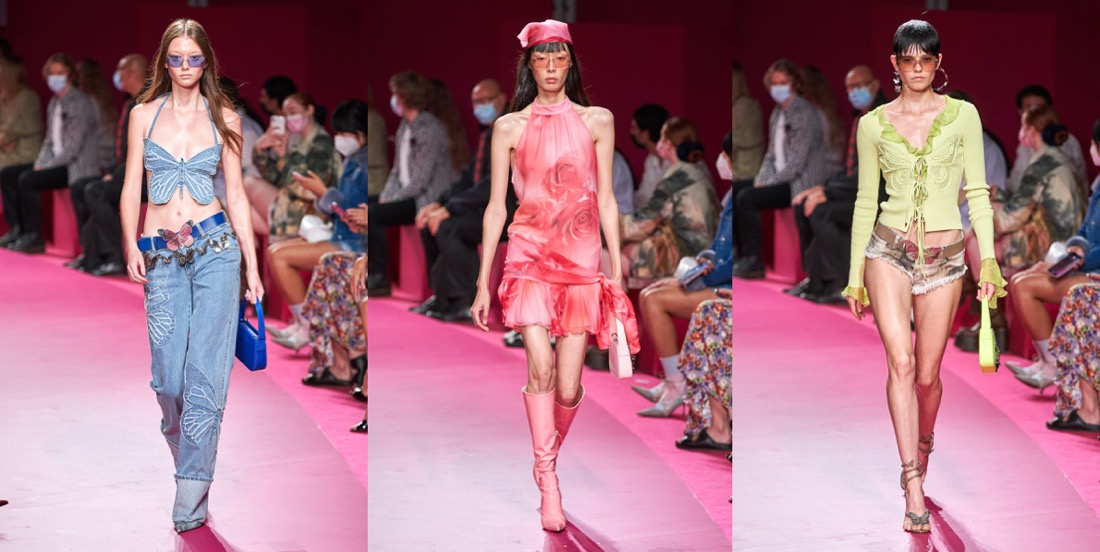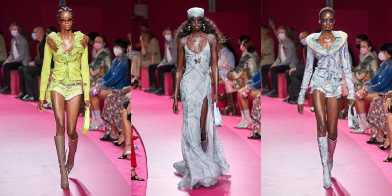 In just a few seasons, Nicola Brognano (with Lotta Volkova’s styling help) has flipped and twisted one of the sleepiest brands in Milan and transformed it into a 2000s-era e-girl nostalgia heaven. Blumarine last had such success in the end of the 90s and the beginning of the millenium, when nothing seemed better than rhinestone butterflies, sexy ruffles and lots, lots of denim. It’s 2021, and ironically, that’s what the TikTok generation loves and needs in their lives. Yet when asked backstage about his inspiration for spring, Brognano said “no one in particular really“. He knows that what matters is inundating social media accounts with the brassy swagger of all the skimpy, hotter-than-hot pants trotting on stilettos on the catwalk today, as well as the risqué fringed and beaded bikinis barely covered by a cropped cardi trimmed in regenerated mink or crocheted in fluoro recycled poly, or the see-through chiffon cargo pants with midriff-baring matching tops in eye-popping Day Glo colors. The co-conspirator in Brognano’s implacable turnaround is Volkova, who was busy backstage before the show shepherding models into a not-too-orderly lineup. Dressed in a whisper of a dress in pale pink stretchy gauze and chaperoned by her gallant, elegantly groomed black poodle Dimitri, Lotta fired off a barrage of her own takes on Blumarine’s new fundamentals: “Military Fairies. Sexy Butterfly girls. Frivolous and fun early Y2K mood when social media wasn’t on the horizon. Denim patchwork queens. Trippy, psychedelic, neon girls. Red carpet denim prints, red carpet bandanas. Low-waisted mermaids.” Love it or hate it, but that kind of Blumarine seems to be timeless.