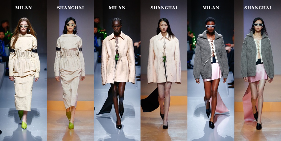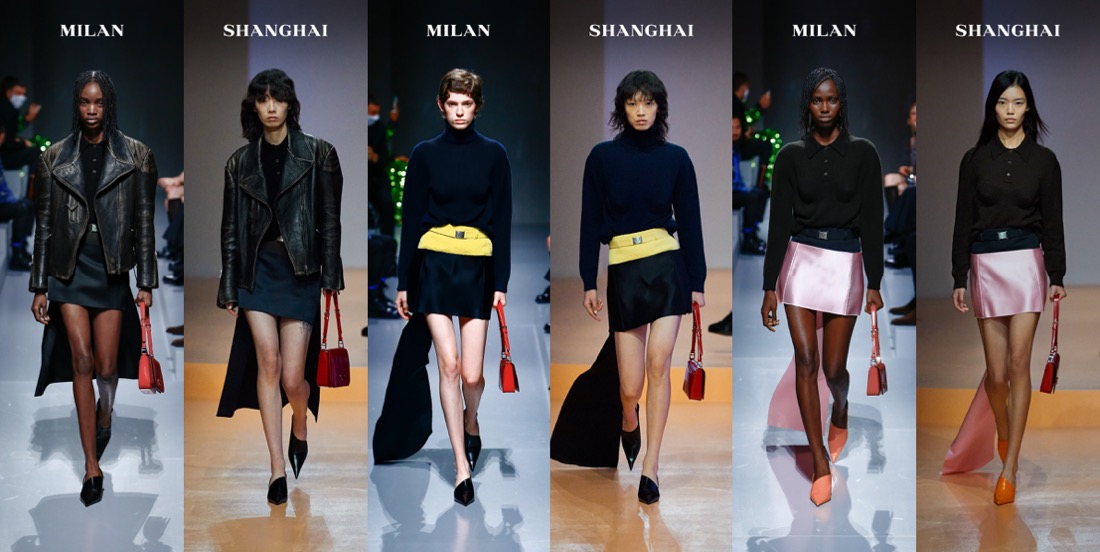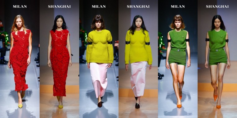The Prada spring-summer 2022 show was the first chance to see Miuccia Prada and Raf Simons’ work on an IRL catwalk. Their collaboration began just as the pandemic descended, and with only videos to tell the story, it could feel at times like the project was in its beta phase. Eighteen months later, with vaccines reopening the world, the brand staged two simultaneous shows, one at home in Milan and the other at Shanghai’s Bund One. At the Fondazione Prada, large LED screens were placed around the runway, and via the live feeds we could see different models striding by in the same looks. As Simons put it, it’s about connecting the world. Clothes-wise, I’ve never been so on fence with a Prada line-up, but I guess if a collection this season makes you question things, then it does the work. Collectively, people on the streets and people inside the fashion industry are embracing sexiness. There’s a diversity of opinion about what’s sexy, but generally speaking, clothes have gotten tighter, smaller, and more see-through as we begin emerging from this COVID-19 crisis. The young generations display a new kind of body positivity that can be frankly startling for older types who didn’t grow up as free. Ultimately, though, their boldness is heartening. “Seduction, Stripped Down” is the name Prada and Simons gave to the collection. In her notes, Prada said, “We thought of words like elegant – but this feels so old-fashioned. Really, it’s about a language of seduction that always leads back to the body. Using these ideas, these references to historical pieces, the collection is an investigation of what they mean today.” The historical ideas in question are the familiar tropes of womanhood, like bra cups and corsetry boning, made unconventional by how they were presented: on simple, even plain, sweaters or as details on denim coats. Duchesse satin sheaths read as almost demure until the dresses turned to reveal they were unbuttoned to the lower back, exposing peekaboo flashes of lingerie. The long evening column also got a rethink; it was sliced above the knee, but a bow in back extended to the floor. “That feels modern,” Simons stated. The hard/soft interplay of raw or distressed leather jackets and tiny duchesse satin miniskirts trailing trains counted as the collection’s most talked about details. Well, I can’t stand those trains, and I feel like they’ve polarized the entire industry. It’s not easy to redefine sexy, as we’ve seen elsewhere this week. Does this word even mean anything in fashion today? Miuccia and Raf did “sexy” in the Prada-ist “ugly chic” manner, balancing cumbersome and sleek, lace with leather, the wrapped and the untied.