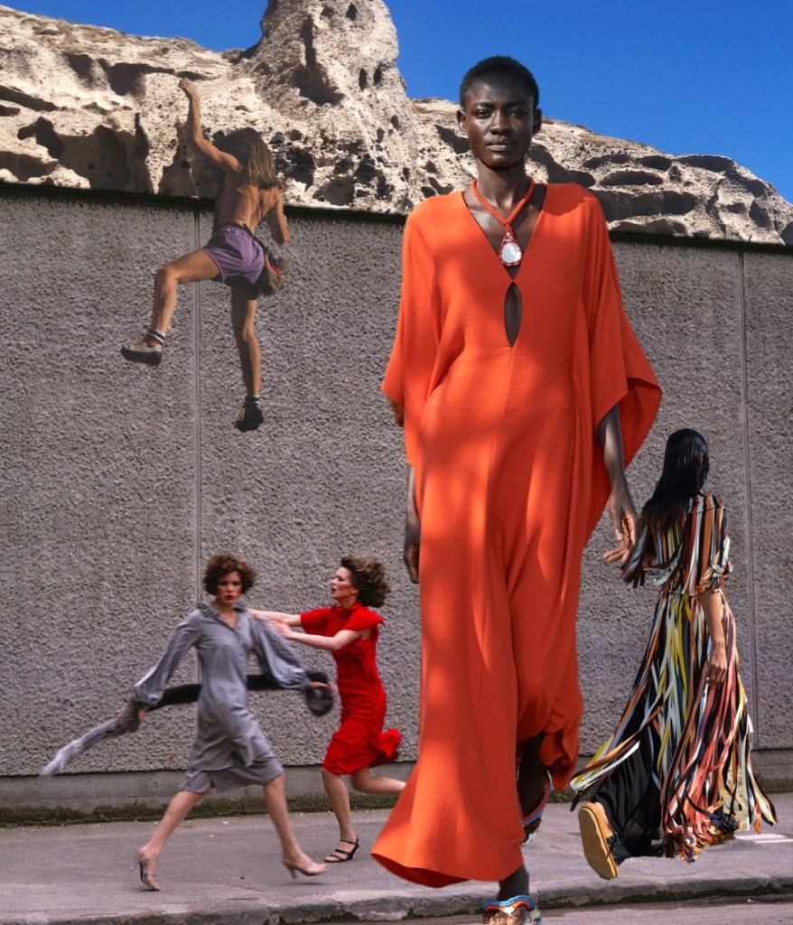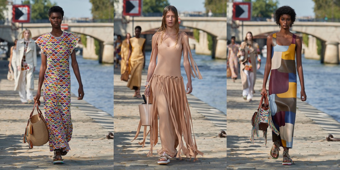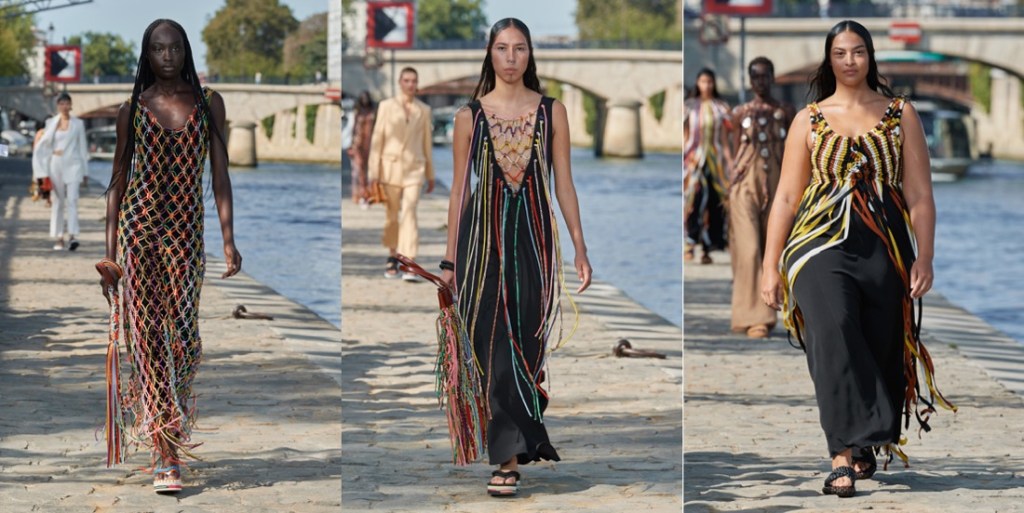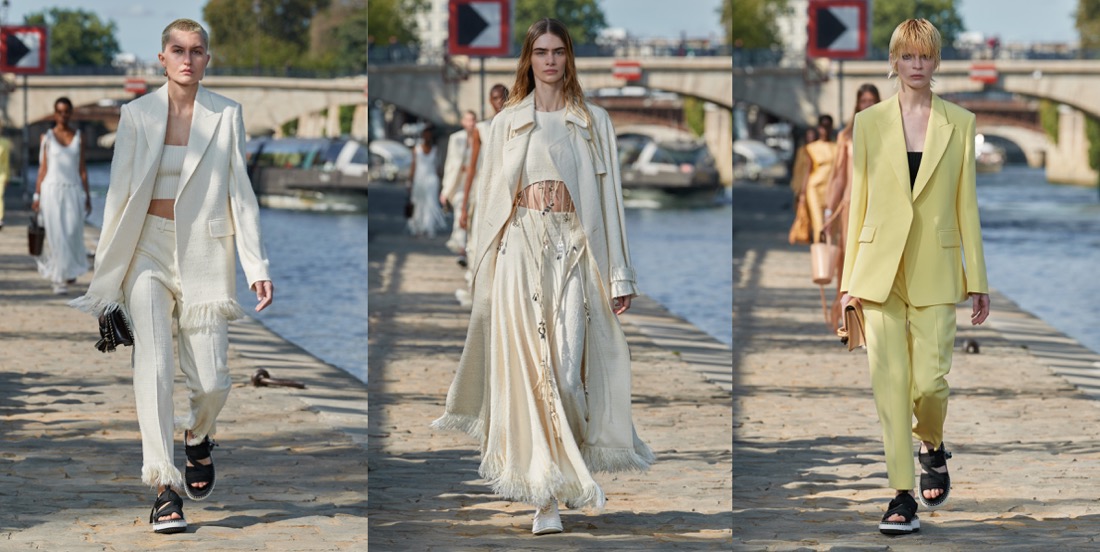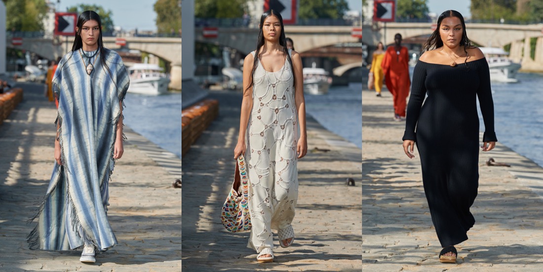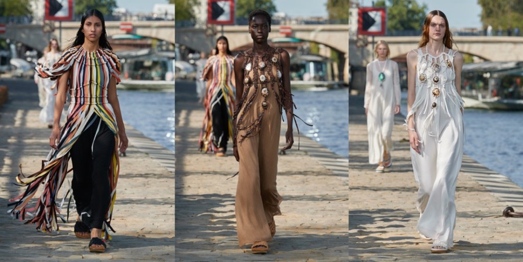 All the information is documented in a Chloé press release and on its website: progress toward what all fashion houses ought to look like internally in this age of climate emergency. At points – when you consider how many women’s organizations and communities Chloé is benefiting through buying strategies around the world – it almost begins to seem possible that this work could even be marking a shift in the entire purpose of a luxury brand’s existence. One step in that direction is that the most exclusive level of Chloé luxury is now being launched as Chloé Craft – a group of products with a spiral logo, denoting, as Hearst puts it, “that only a human hand can make those pieces.” In the spring collection, those hand skills were evidenced in pieces like the petal-pattern crocheted dress and the intricately knotted streamer-harnesses made of strips of leftover fabric from seasons before – techniques created by Akanjo, a social enterprise organization in Madagascar. The chunky seashell and macramé necklaces, as well as baskets that come labeled with the name of the person who wove them, also bear the spiral branding. Shifting the needle toward causing less environmental harm primarily comes in Hearst’s creditable insistence on fabric switching. For example, there’s more linen and less cotton involved in this collection. It’s used to chic effect in the cream pieces, including a generous, Hearst-signature trench coat with a cool heft and whipstitched leather edging. And, more surprisingly, in a great indigo blue pantsuit that at first sight seemed to be denim, but was in fact a beautifully soft, supple linen. Underfoot, as well as the eco-friendly Nama trainers launched this year, a new and delightfully multicolored deep-soled Chloé flip-flop was treading the Parisian riverside quai. In fact, all the pretty pastel layers pressed into the soles were once other flip-flops. “They’re from Ocean Sole, which I’ve been wanting to work with for a long time!” Hearst declared. “It’s a Kenyan nonprofit that collects flip-flops from the ocean.” All the applause from the people of Paris, boat-trippers and fashion audience alike, was well deserved for the progress she’s pushing through.