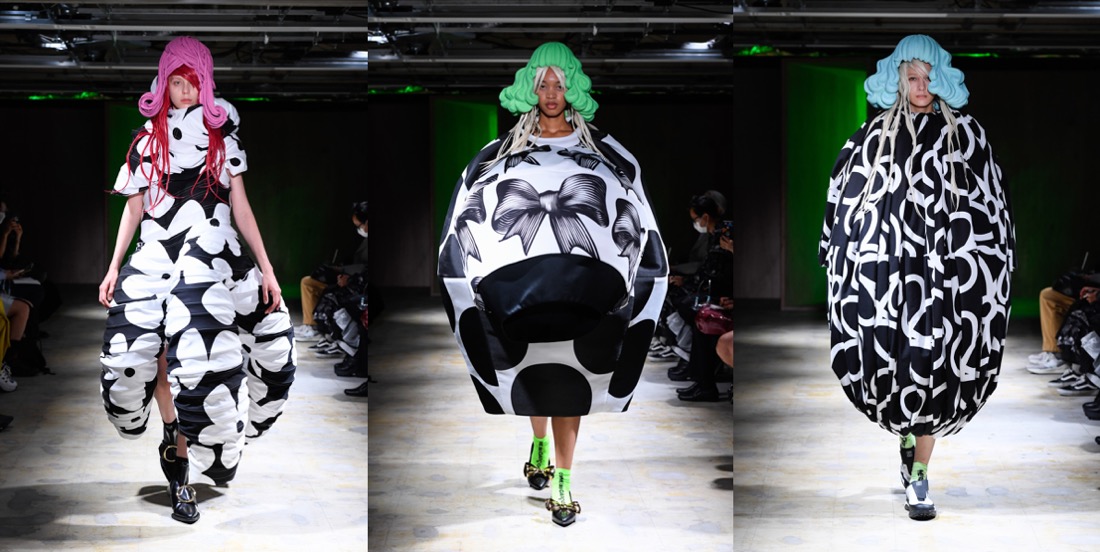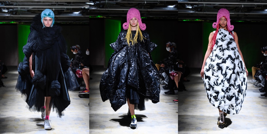 Livestreamed from Tokyo, Rei Kawakubo went for her signature giant portable Comme Des Garçons sculptures this season, imprinted with exaggerated flowers, leaves and bows. There were huge shapes, which meant models had to squeeze or shuffle sideways to emerge through a door onto a set. It didn’t feel like one of Kawakubo’s dystopian, apocalyptic moments in which she has seemed to sound a warning about bad things coming. Was her popping-out scenario closer to suggesting a feeling of rebirth, re-emergence, maybe? If so, it’s into a world where – as other fashion designers have been saying – nothing makes sense. Randomness, surrealism and absurdity are registering as part of the mood of 2021. Kawakubo, in confronting her “present state of mind” went large, very, very large, occupying space in ways that no women is meant to (though to be honest, vast art-fashion structures have been her safe space for experimenting for years). She certainly met her own criterion of avoiding making clothes. Comme “dresses” were presented as abstract perambulating 3-D fabric structures, topped off with pastiches of plastic cartoon girly wigs by Gary Card. Some of them had a sort of curved prow; several had net-filled cones spurting from their backs; some were ovoid, another was a 3-D black trashbag flower. Eventually there was an impression of the weight of furnishing fabric and swishing curtain swags. In the end there was a piece that seemed to have entirely merged a woman with a comfy black and white upholstered armchair. Paris Fashion Week missed having the Comme de Garçons show to contemplate at a time when fashion needs fearless innovators to take it forward. Kawakubo sets an example for all: a designer who has been independent for a lifetime and is still pushing.