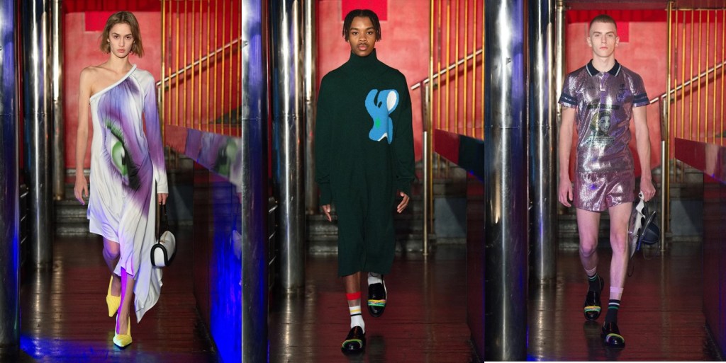 For autumn-winter 2022, Jonathan Anderson embraces all things “weird”, and seems to be aesthetically torn between the 1980s (sparkly party dresses) and now trending, early 2010s “indie sleaze” (metallic lycra jumpsuits). The JW Anderson collection was planned to be shown live in Milan with a late-night after-party. An IRL event would have enhanced and disrupted this season’s menswear week. As Anderson explained in a preview, however, the party element especially was nixed by Omicron restrictions and the live Milan debut has been pushed back until June. During that preview, Anderson used the word “weird” countless times: most often at a point at which he unlocked the thinking that had led to key elements in this collection. It was “weird” how a documentary on Cristiano Ronaldo inspired him to re-engage with “the limits of hyper-masculinity.” This lead to Anderson’s gleeful excavation of the polo shirt – “there is nothing more quintessential”—as a masculine cipher which he then disrupted by variously lengthening it into a hoop-hemmed dress, rendering it in micro-sequin with a vintage “Glamour Bonnet” hair net advert, or reconfiguring it as a high-shorted playsuit. This last look brought back fond back-in-the-day memories. When not watching documentaries “on everything and anything” Anderson spent much of his time weird-scrolling, and the results inflected this collection. The gorgeous eye-graphic dresses had a chin-strokily John Berger inference yet were sparked by a bout of engaging with the world of YouTube make-up tutorials. The menswear tunics peppered with rubber bands and sweaters featuring tubular protrusions that ran from one side of the hem, between the wearer’s legs, and up to the other hem with both pieces designed to generate sound through contact. “A lot of the materials have these odd sounds qualities that are kind of almost sexual… there’s a kind of tension,” he said. These were the by-product of spiraling into ASMR content on TikTok, another “weird” lockdown stop-off. When Anderson detects weirdness, he is not repelled but stimulated: for him “odd” and “bad taste” hold creative opportunity. Allied with his highly refined sense of beauty, the results are unorthodoxly compelling.