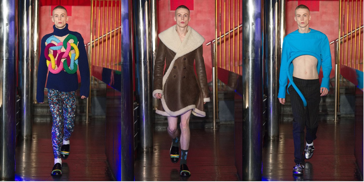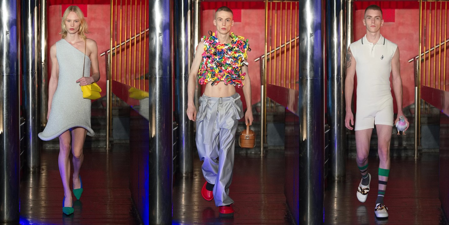 For autumn-winter 2022, Jonathan Anderson embraces all things “weird”, and seems to be aesthetically torn between the 1980s (sparkly party dresses) and now trending, early 2010s “indie sleaze” (metallic lycra jumpsuits). The JW Anderson collection was planned to be shown live in Milan with a late-night after-party. An IRL event would have enhanced and disrupted this season’s menswear week. As Anderson explained in a preview, however, the party element especially was nixed by Omicron restrictions and the live Milan debut has been pushed back until June. During that preview, Anderson used the word “weird” countless times: most often at a point at which he unlocked the thinking that had led to key elements in this collection. It was “weird” how a documentary on Cristiano Ronaldo inspired him to re-engage with “the limits of hyper-masculinity.” This lead to Anderson’s gleeful excavation of the polo shirt – “there is nothing more quintessential”—as a masculine cipher which he then disrupted by variously lengthening it into a hoop-hemmed dress, rendering it in micro-sequin with a vintage “Glamour Bonnet” hair net advert, or reconfiguring it as a high-shorted playsuit. This last look brought back fond back-in-the-day memories. When not watching documentaries “on everything and anything” Anderson spent much of his time weird-scrolling, and the results inflected this collection. The gorgeous eye-graphic dresses had a chin-strokily John Berger inference yet were sparked by a bout of engaging with the world of YouTube make-up tutorials. The menswear tunics peppered with rubber bands and sweaters featuring tubular protrusions that ran from one side of the hem, between the wearer’s legs, and up to the other hem with both pieces designed to generate sound through contact. “A lot of the materials have these odd sounds qualities that are kind of almost sexual… there’s a kind of tension,” he said. These were the by-product of spiraling into ASMR content on TikTok, another “weird” lockdown stop-off. When Anderson detects weirdness, he is not repelled but stimulated: for him “odd” and “bad taste” hold creative opportunity. Allied with his highly refined sense of beauty, the results are unorthodoxly compelling.