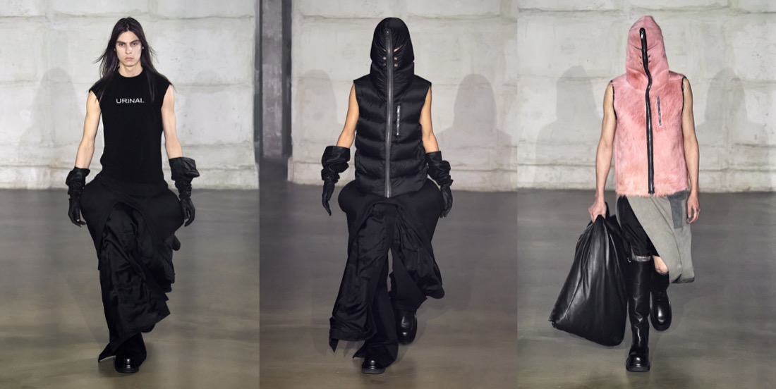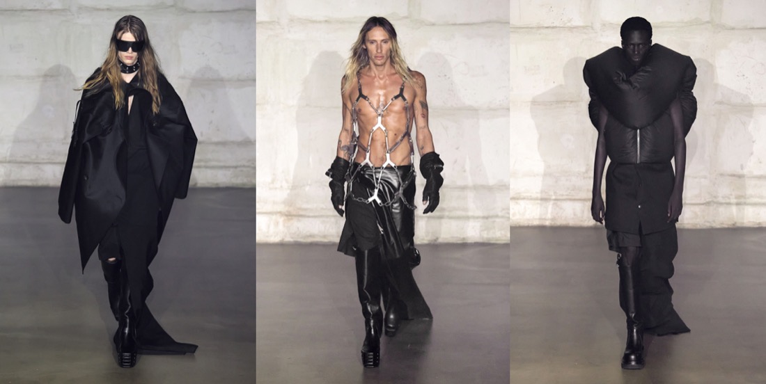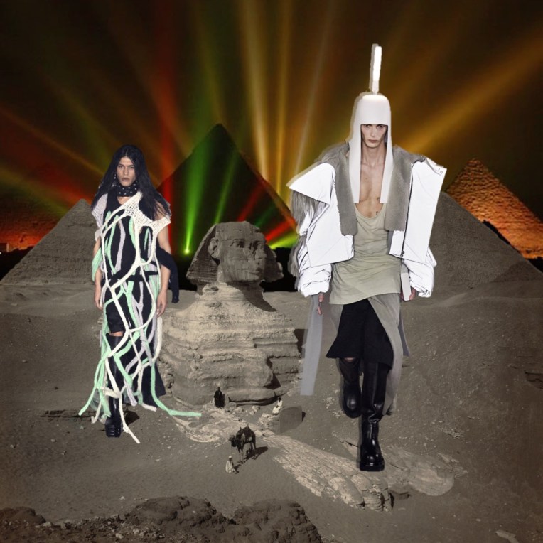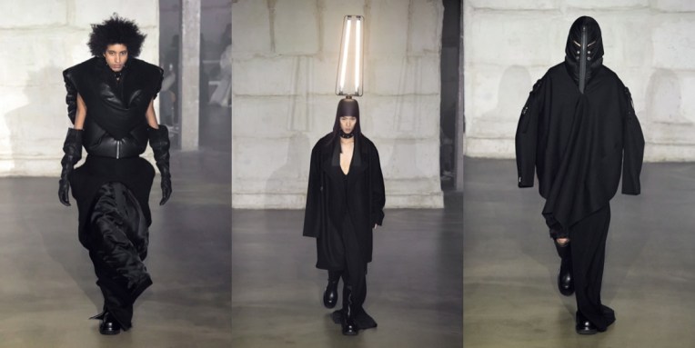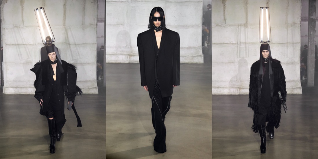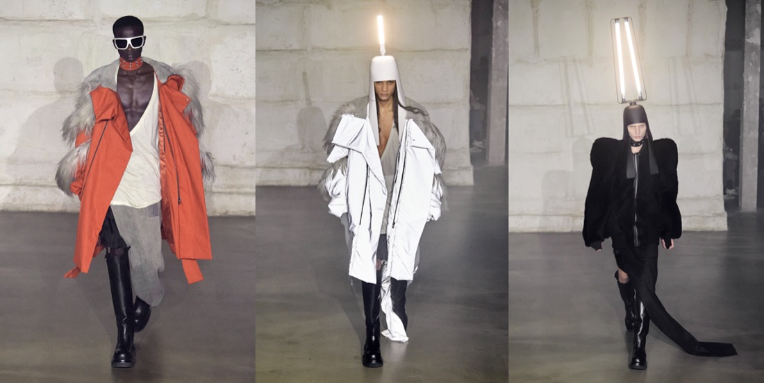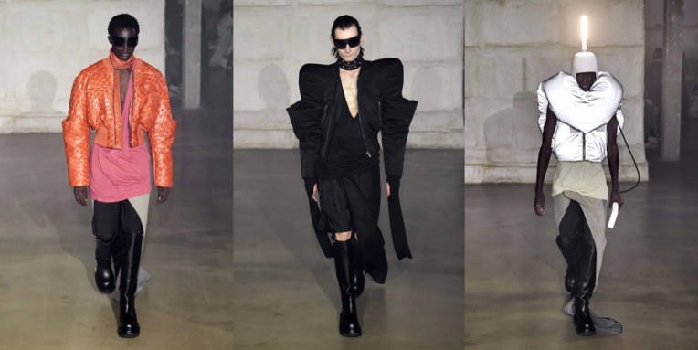 “I’m not the kind of designer that says, ‘I just went to China and this is my inspiration‘. But I just went to Egypt, and they have those shapes, those beautiful shapes, and I thought if I did that as a Dan Flavin helmet, that would be so cool.” This is how Rick Owens summed up his out-of-this-world, ethereal autumn-winter 2022 menswear collection. By combining the headwear profiles of Ancient Egypt with some adroitly applied Philips light bulbs, Owens created headpieces that doubled as lamps – “they’re all free-standing.” The on-and-off-again lighting meant that much of the detail was suppressed from the eye: what was left were silhouettes. These were masculine, wonderfully unconventional and diverse, and ranged from Owen’s originally parodic mega shoulder to whorled arthropod curlings rendered in piumino. He compared the Land Art of the 1970s to the emerging meta-stuff, but remained refreshingly detached. Much more passionately he dug deep into the Made In Italy provenance of his pieces, dishing detail on the family companies that fashion his progressive fashion with artisanal techniques. The great upside of this, he hinted, is that it advertises traceability. “That’s information that’s important. And I like being in a company that is talking about that, but which is also saying ‘We’re not that good at it, but we’re trying.’”
