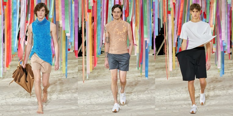 When Jonathan Anderson referenced “metaverse” in his J.W. Anderson collection last week, he said, “I was using it more in an ironic way. The idea that it doesn’t really do anything.” For all its brilliant and hilarious techy surrealism, his Loewe collection was not a wardrobe for the metaverse. In fact, it felt a lot like it was trolling the very idea of our digital lives lived on phones, and the hoopla whipped up around trendy concepts like the metaverse. If our attraction to VR and AR and whatnot is founded in the idea of possibility, Anderson’s collection was a twisted take on how these imaginings translate into real life. He illustrated it in decidedly normal things made abnormal. Shorts were embellished with sparkles that looked like raindrops, as if it had rained crystals. A wool coat had a gilded stain on its lower back “as if you sat on a park bench and it was gold.” Coats and tops were punched with big bathroom eyelets like you’d digitally dragged your most mundane morning surroundings into your wardrobe. Shoes looked like bags, and transparent coats were actually made of leather. Meanwhile, a series of garments satirized our relationship with technology. The sleeves and lapels of a furry coat had fiber optic lights inside them creating the illusion of wetness, the illuminated waistband of trousers made them seem like they were floating, and the entire frame of a coat was lit up. “It’s the idea that you become backlit because everything on a phone is backlit,” Anderson said, referring to the way we see things on our phones and the way our screens light up our faces. Balaclavas with heart-shaped peepholes played on the idea of digital frames. Similarly, the orbital hem of a shirt and the waistband of shorts were bent in separate directions so it looked like you’d skewed them in FaceTune. It evoked the DIY editing accidents you sometimes spot in people’s selfies where the person looks like a supermodel while the retouching process has turned the background into an abstract painting. We all follow someone like that. And those t-shirts and jumpsuits with faces and bodies printed on them like optical illusions? They were worn by the models who posed for them, distorting and reshaping their physiques the way we do it on those beautifying apps.