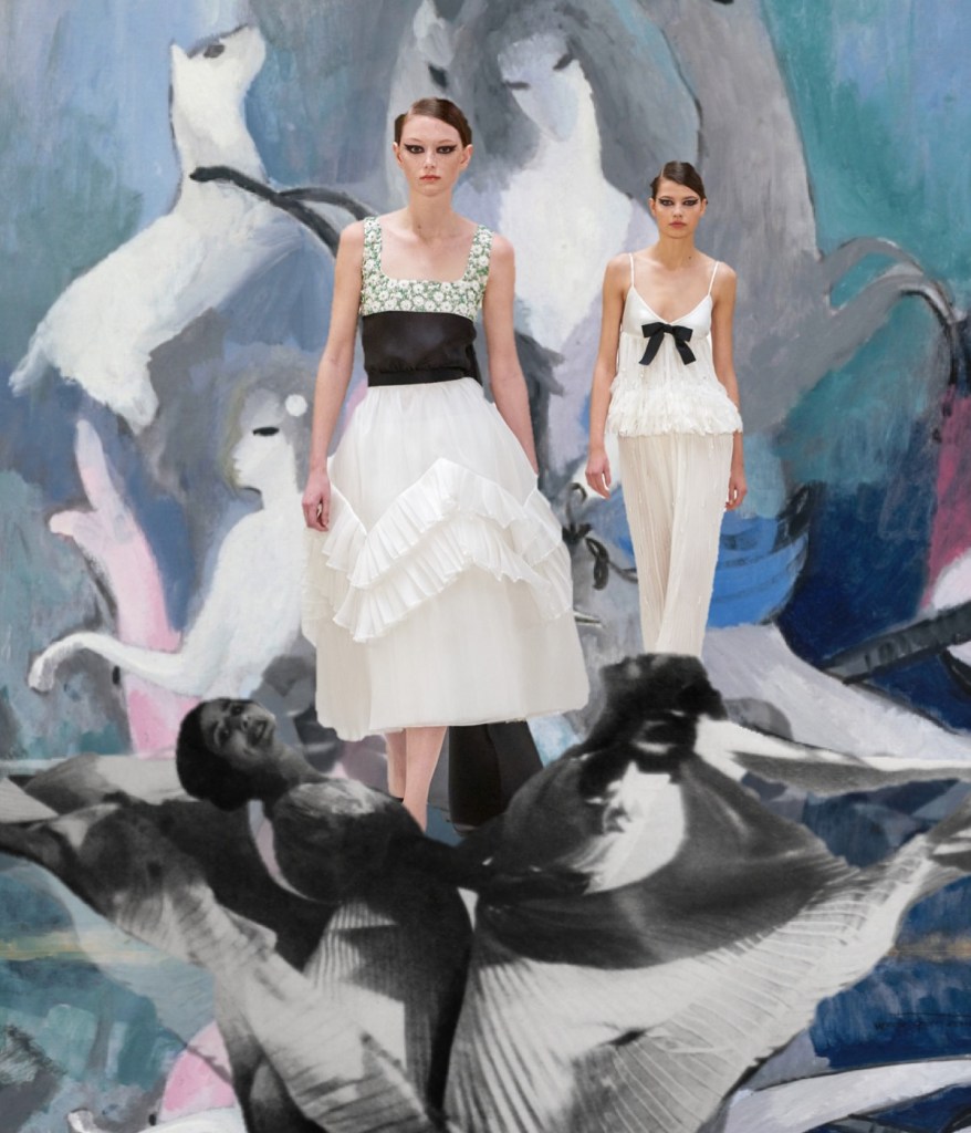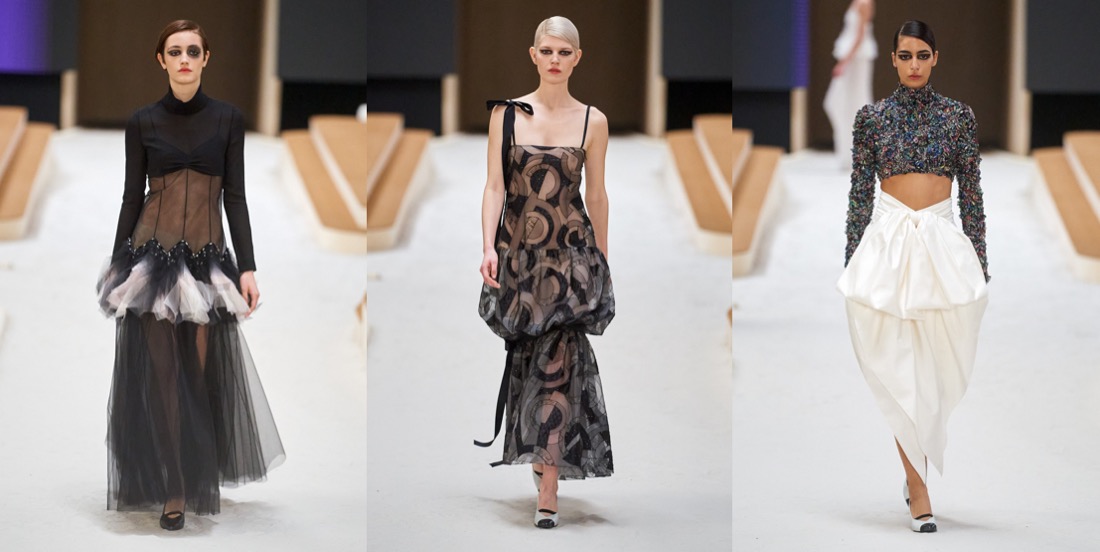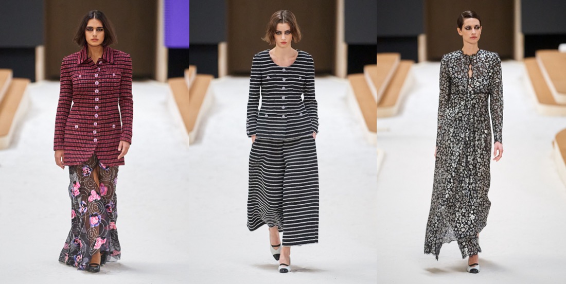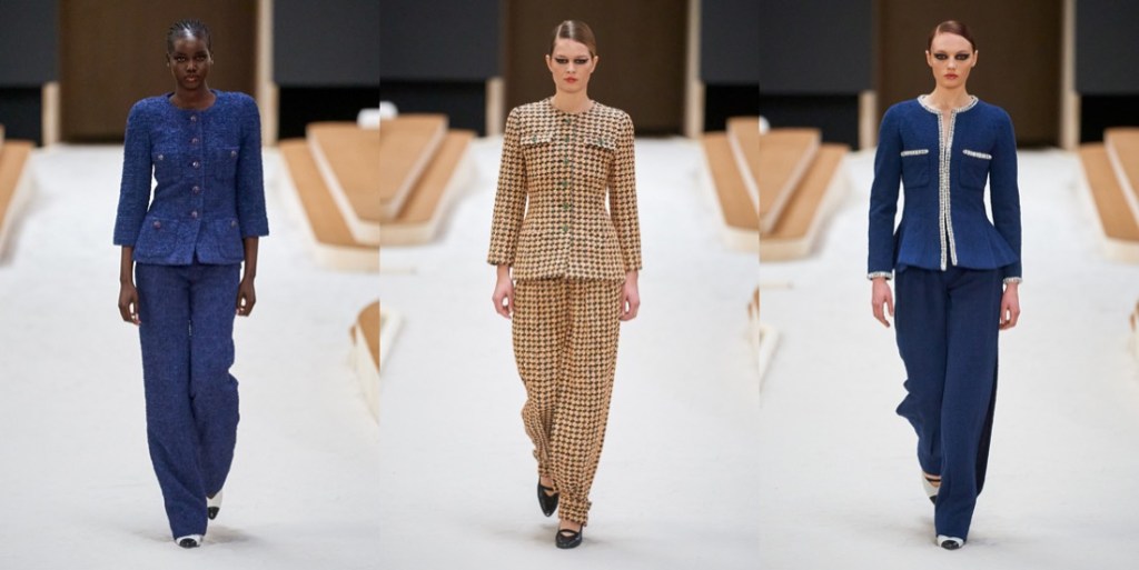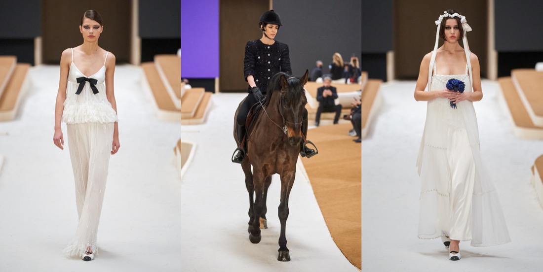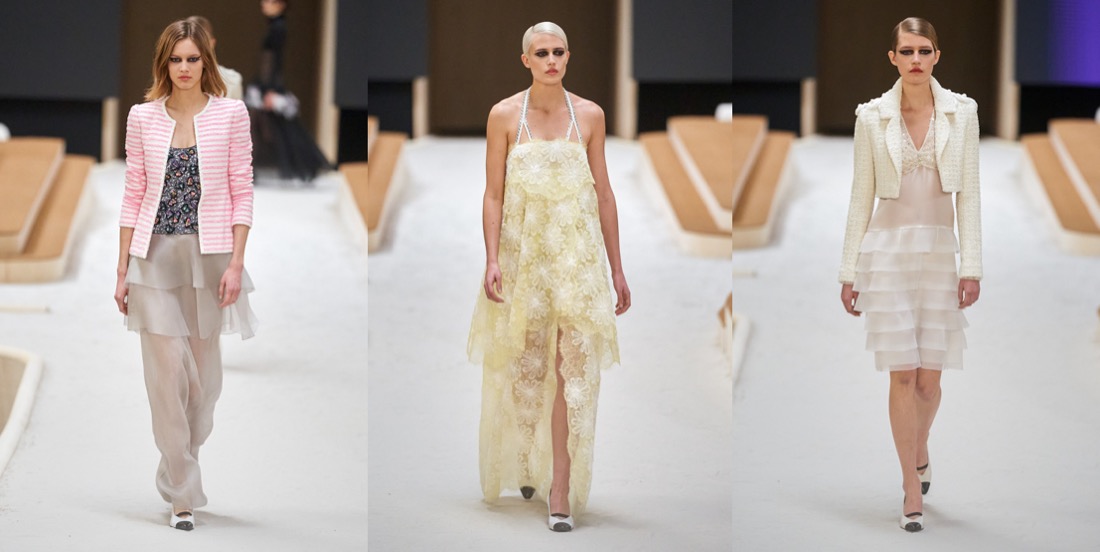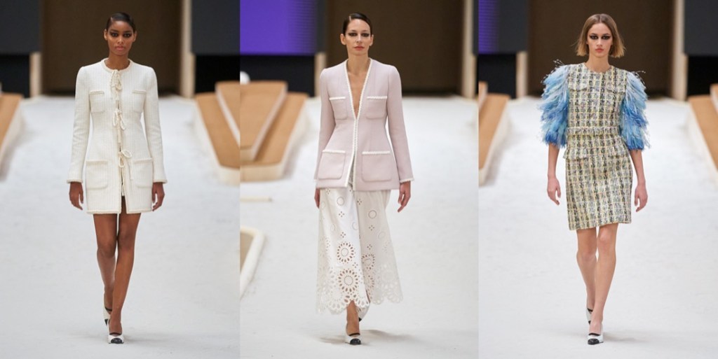 Chanel‘s spring-summer 2022 couture collection was as predictable as Virginie Viard‘s description of it: “it’s a summer collection, so it’s very fresh, even with a lot of embroideries. I was inspired by the ’20s a little – the feathers, the fringe.” Well, nothing ground-breaking – this collection isn’t for the ones who seek haute-novelty. To set the scene, Viard reached out to the artist Xavier Veilhan whom she met at the home of their mutual friend, musician Sébastien Tellier. “I always wanted to work with him because he did something for Chanel [fine] jewelry 15 years ago in Place Vendome, a great installation,” Viard said. “I love his work and I needed someone to work with for the sets – the way Karl did. Me, I can’t do that! He loves Constructivism, that kind of thing which is so Karl!” she continued. “In fact, I found some notes from Karl in Rodchenko and Malevich books that he always gave me – so many books and documents with notes on details that could be used for embroidery and so on. It was always Constructivist with Karl!” Veilhan, who was chosen to represent France in the 2017 Venice Biennale, drew on this century-old, but still revolutionary period in art, for his Chanel set, with its giant spinning discs and sandy walkways, crafted from sustainable plywood and matting in his preferred (and appropriately Chanel) palette of black, white, and beige. The set he created springs from this thought, inspired by 1920s World Fairs and artists like Sonia and Robert Delaunay. The makeup was also inspired by the pre-war era’s avant garde creatives, although the dark circles around some of the models’ eyes looked rather unfortunate. “I like the classic Chanel,” added Veilhan, “and I like sport and it’s funny to think that the Chanel tailleur is something you can wear for playing golf, or riding a horse.” To prove his point, the show opened with Monaco’s Princess Charlotte, dressed in a Chanel jacket, riding the beautiful eight year old Spanish bay horse Kuskus, first in an elegant “collected walk,” then a canter. What about the actual fashion? Sadly, it was the biggest downer of the entire event. That 1920s and ’30s Gatsby mood that Viard discussed was manifested in filmy chiffon and organza dresses with uneven hems, and trailing scarf panels that drifted from the shoulder. Satin evening dresses seemed to be suspended from necklaces and were draped to reveal the back, and tiny beaded gilets could be slipped on to amplify the glamour quotient. All of it looked pretty… but pretty is kind of boring, right?