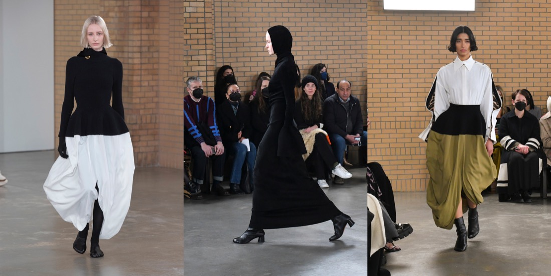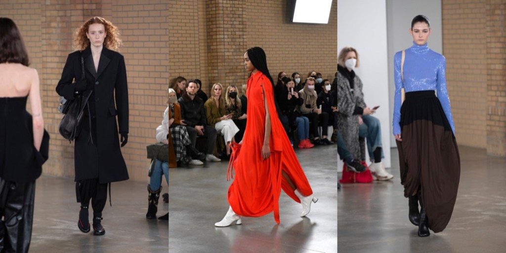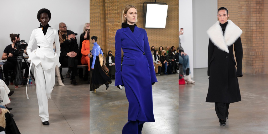 Here we go – it’s New York Fashion Week, the most IRL one since the start of pandemic. This season it’s opened by a very New York collection, coming from Proenza Schouler. And this isn’t just another line-up, but a collection that celebrates Lazaro Hernandez and Jack McCollough‘s 20th year in business. Take a look back at the Parsons graduation collection that started it all for them in 2003, and you will notice that much has changed in the intervening decades. The brand had its ups and downs throughout the years, and for a couple of seasons now it consequently heads towards a sort of sophisticated, yet aesthetically minimalist formality. “Comfort” and “ease” are fashion’s buzzwords of the moment, relics of a lockdown that remain even as the emergence we’ve been hoping for starts to take shape. The corseted silhouettes that were the first Proenza Schouler signature, however, have been completely rethought for today, constructed from machines that knit in circles, allowing for a seamless, molded look. Can a strapless dress with volume evocative of 18th-century panniers really feel effortless? Yes, if it’s in sculpted knitwear with a circular bias-cut skirt. Hernandez and McCollough gave their tailoring the same waisted look by accessorizing suits with torso-spanning body shapers, or by cutting jackets and coats to wrap across the midriff and button off to the side, the cloth equivalent of a firm hug. If this outing was a reappraisal of their past, it wasn’t reliant on it. A loose-fitting shirtdress with a fluid looped hem stood out for its color, a vibrant purple that they’ve avoided before. The animal print is another new indulgence – here it was deliberately glitched, as if the color didn’t take in the folds and creases of the fabric as it went through the machine.