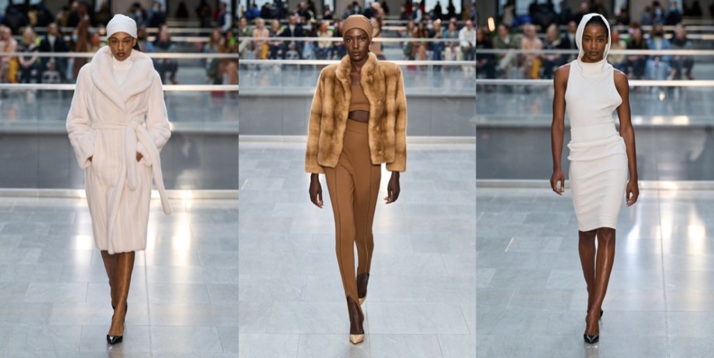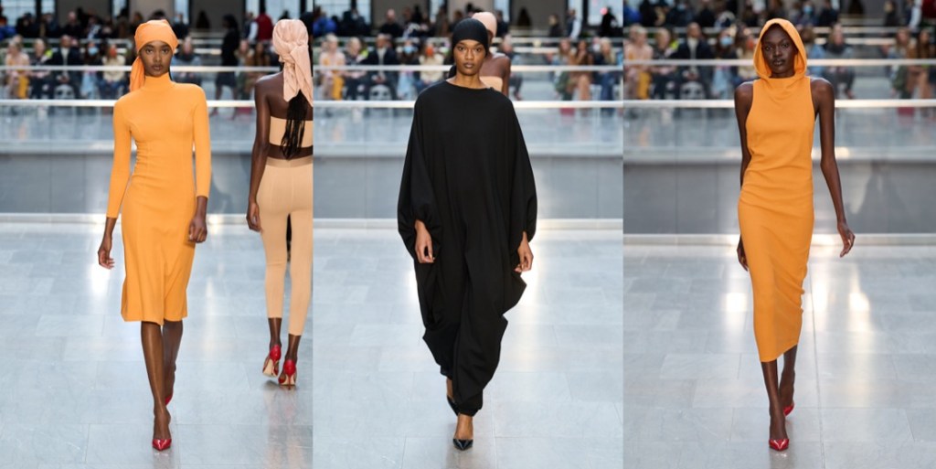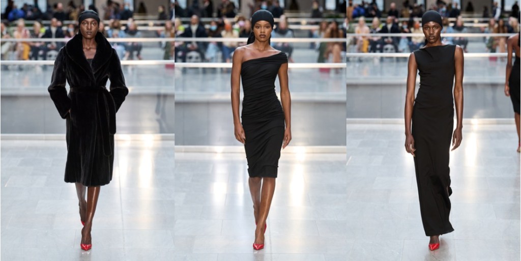 Victor Glemaud‘s brilliant autumn-winter 2022 outing oozed with the energetic New York chic of the Halston days – and the graceful confidence of the Halstonettes. Lately, Glemaud has been working a more minimalist groove, and this season the designer ramped up that aesthetic, stripping down and paring back his signature vibrant knits. Models sauntered into the marble paved atrium in classic stilettos, their hair tied back with chic headscarves. The collection has its key reference – Ousmane Sembène’s Black Girl, a masterpiece of 1960s cinema that earned the pioneering Senegalese filmmaker international renown. Mbissine Thérèse Diop plays the young Senegalese woman who moves to France to work for a wealthy white family. Her stirring performance is amplified by a wardrobe of impeccable black and white shift dresses. Punctuated with touches of tangerine and soft beige, the collection’s mostly monochromatic palette nodded to Diop’s scene-stealing performance. Glemaud introduced a new, more pliant yarn to his brand this season, and the resulting cut and sew jersey dresses were attention grabbing and flattering on a variety of body types. The most compelling examples were cut with athletic attitude, including clingy hooded racerback maxi dresses, ruched asymmetric LBDs, and stirrup leggings. As a partner to those bodycon looks, Glemaud showed a series of fur coats, perhaps the most unexpected aspect of the collection. With so many brands going fur-free, these days it’s rare to see so much as a fur trim on the runway. Still, for Glemaud the choice made sense. “Fur has a rich history in Black culture and it’s something I don’t think we should be ashamed about,” he said backstage. “I also don’t believe we should live in fear of being canceled.” It was a lovely surprise to discover in the show notes that he had dedicated the collection to “the countless women who left their homelands for the American Dream,” including his elegantly dressed mother and her twin sister, originally from Haiti, who sat in the front row. “I wanted this collection to be a celebration of body and shape, but most of all a celebration of Black women,” said Glemaud. Easily the most powerful statement of the show was the casting of all Black dark-skinned beauties.
