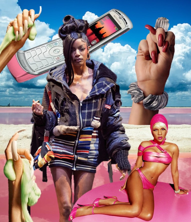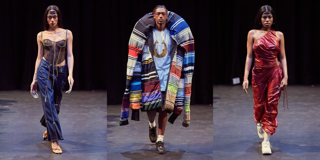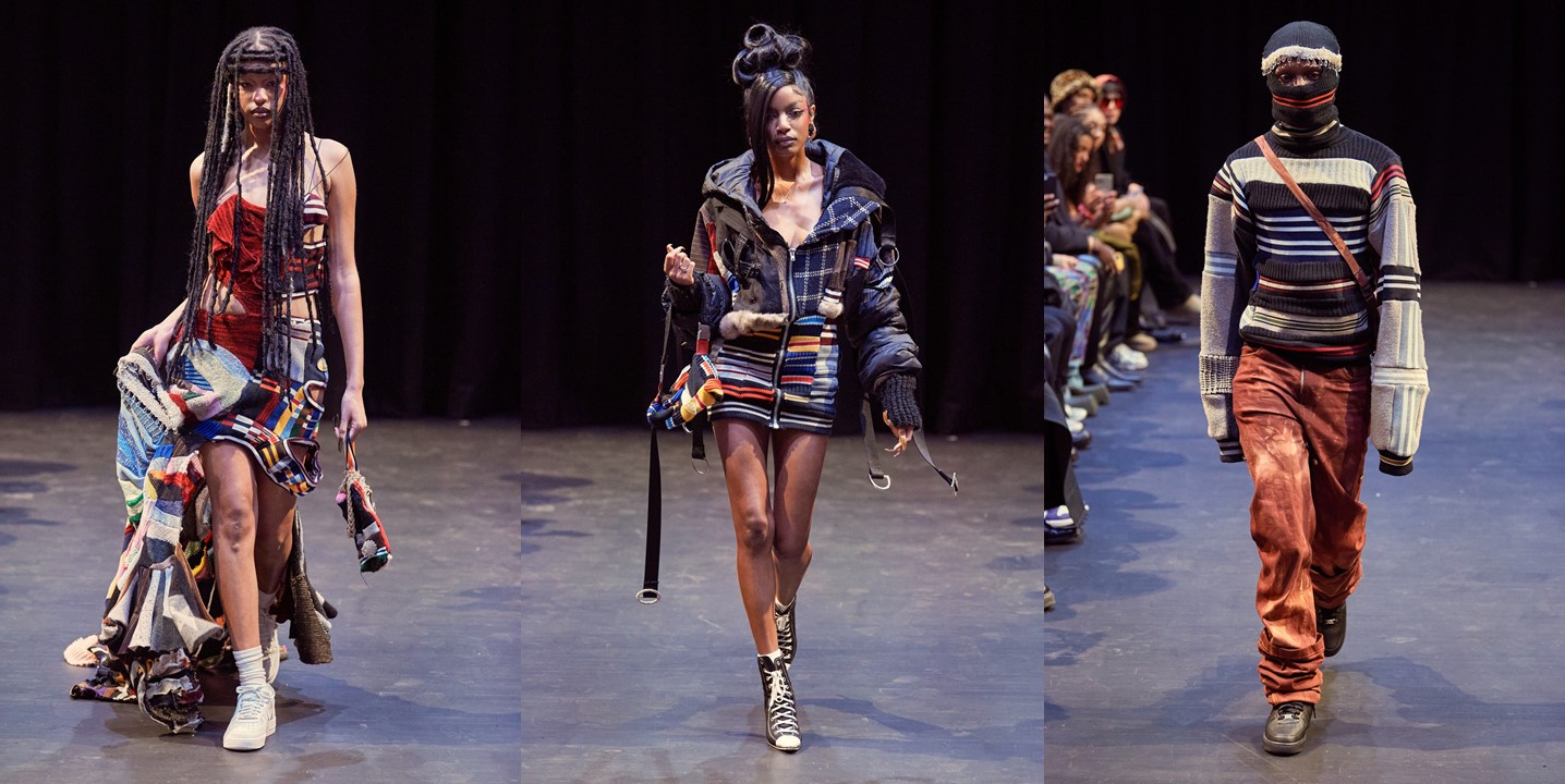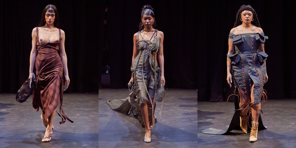Using traditional American materials, from brown houndstooth wool to red nylon, No Sesso‘s designers Pia Davis and Autumn Randolph wrote their own lexicon of fashion classics steeped in their experiences as Black women. Dresses dripped off the body, some in filmy olive chiffon, others in crisp cotton shirting, cradling the bust and revealing slivers of torso, thigh, and breasts. A one-shoulder silhouette with cargo pockets appeared in several different fabrications, hammering home the piece’s versatility. The real stars of the lineup were the upcycled pieces and the pair’s new Levi’s collaboration. The former, made using vintage varsity jackets, ties, puffer jackets, and other unloved fashion items, took the brand’s familiar practice and pushed it to new heights. A dress collaged together from pieces of old knitwear was trimmed in crystal beading, almost ethereal in its execution, while a short zip-front dress was boldly sexy. The denim pieces made with Levi’s toed the line of appropriateness, using corsets, lacing, and zippers to transform a cool, oversize jacket into a sexy little dress. That play of sexual and sensual with something more appropriate is the territory where No Sesso thrives. It’s also the place where Davis and Randolph are able to combine their skills as artists and as pragmatists. This No Sesso collection included more utilitarian, essential pieces than ever before without losing the pair’s deconstructivist touch.